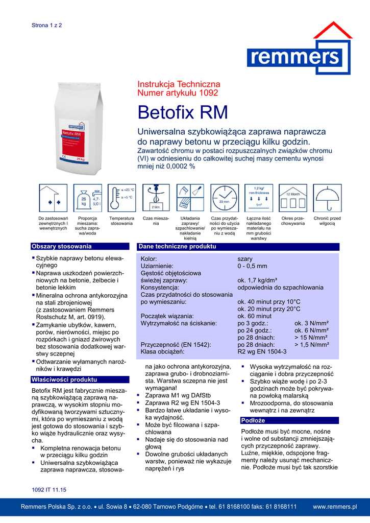 Strona 1 z 2 Instrukcja Techniczna Numer artykułu 1092 Betofix RM Uniwersalna szybkowiążąca zaprawa naprawcza do naprawy betonu w przeciągu kilku godzin. Zawartość chromu w postaci rozpuszczalnych związków chromu (VI) w odniesieniu do całkowitej suchej masy cementu wynosi mniej niż 0,0002 % Do zastosowań zewnętrznych I wewnętrznych Proporcja mieszania: sucha zaprawa/woda Temperatura stosowania Obszary stosowania Czas mieszania Czas przydatności do użycia po wymieszaniu z wodą Łączna ilość nakładanego materiału na mm grubości warstwy Okres przechowywania Chronić przed wilgocią Dane techniczne produktu Szybkie naprawy betonu elewa- Kolor: Uziarnienie: Gęstość objętościowa świeżej zaprawy: Konsystencja: Czas przydatności do stosowania po wymieszaniu: cyjnego Naprawa uszkodzeń powierzchniowych na betonie, żelbecie i betonie lekkim Mineralna ochrona antykorozyjna na stali zbrojeniowej (z zastosowaniem Remmers Rostschutz M, art. 0919). Zamykanie ubytków, kawern, porów, nierówności, miejsc po rozpórkach i gniazd żwirowych bez stosowania dodatkowej warstwy sczepnej Odtwarzanie wyłamanych narożników i krawędzi Początek wiązania: Wytrzymałość na ściskanie: Przyczepność (EN 1542): Klasa obciążeń: Właściwości produktu Betofix RM jest fabrycznie mieszaną szybkowiążącą zaprawą naprawczą, w wysokim stopniu modyfikowaną tworzywami sztucznymi, która po wymieszaniu z wodą jest gotowa do stosowania i szybko wiąże hydraulicznie oraz wysycha. Kompletna renowacja betonu w przeciągu kilku godzin Uniwersalna szybkowiążąca zaprawa naprawcza, stosowa- Układania zaprawy/ szpachlowanie/ nakładanie kielnią na jako ochrona antykorozyjna, zaprawa grubo- i drobnoziarnista. Warstwa sczepna nie jest wymagana! Zaprawa M1 wg DAfStb Zaprawa R2 wg EN 1504-3 Bardzo łatwe układanie i wysoka wydajność. Może być filcowana i szpachlowana Nadaje się do stosowania nad głową Dowolne grubości układanych warstw, ponieważ nie wykazuje naprężeń i rys szary 0 - 0,5 mm ok. 1,7 kg/dm³ odpowiednia do szpachlowania ok. 40 minut przy 10°C ok. 20 minut przy 20°C ok. 60 minut po 3 godz.: ok. 3 N/mm² po 24 godz.: ok. 6 N/mm² po 28 dniach: > 15 N/mm² po 28 dniach: > 1,5 N/mm² R2 wg EN 1504-3 Wysoka wytrzymałość na rozciąganie i dobra przyczepność Szybko wiąże wodę i po 2-3 godzinach może być pokrywana powłoką malarską Mrozoodporna, do stosowania wewnątrz i na zewnątrz Podłoże Podłoże musi być mocne, nośne i wolne od substancji zmniejszających przyczepność zaprawy. Luźne, miękkie, odspojone fragmenty należy usunąć mechanicznie. Podłoże musi być tak szorstkie 1092 IT 11.15 Remmers Polska Sp. z o.o. ul. Sowia 8 62-080 Tarnowo Podgórne tel. 61 8168100 faks: 61 8168111 www.remmers.pl Strona 2 z 2 i chłonne, aby zagwarantowana była przyczepność zaprawy. Mocno chłonące podłoża należy wstępnie zwilżyć. W przypadku podłoży niechłonących lub słabo chłonących można zrezygnować z wstępnego zwilżenia. Wytrzymałość podłoża na odrywanie w przypadku głębszych ubytków powinna wynosić co najmniej 1,5 N/mm². Odsłonięte pręty zbrojeniowe należy mechanicznie odrdzewić do uzyskania metalicznej czystości (SA 2´). Następnie wymieszać: 2,5 części wagowe Betofix RM oraz 1 część wagową Rostschutz M tak, aby uzyskać jednorodną mieszankę nadającą się do nakładania pędzlem. Proporcja objętościowa: 2 cz. obj. dyspersji + 3,5 cz. obj. proszku. Na stal zbrojeniową należy kryjąco nanieść pędzlem warstwę świeżego szlamu ochrony antykorozyjnej o grubości co najmniej 1 mm. Po co najmniej 30 minutach nanosi się drugą warstwę świeżego szlamu ochrony antykorozyjnej w sposób opisany powyżej. Po odczekaniu 30 minut można wypełniać ubytek zaprawą Remmers Betofix RM. Naprawa betonu Wlać 4,7 – 5,0 l wody do czystego pojemnika na zaprawę i wsypać 25 kg Betofix RM. Intensywnie wymieszać mieszarką/mieszadłem przez ok. 2 minuty doprowadzając do jednorodnej konsystencji odpowiedniej do stosowania. Mniejsze ilości miesza się w proporcji 1 część objętościowa wody : 3,7 części objętościowych proszku. Betofix RM szybko wiąże i umożliwia nakładanie powłoki malarskiej tego samego dnia. Dlatego należy mieszać tylko taką ilość zaprawy, jaką można zastosować w przeciągu 20 minut (zależnie od temperatury). Betofix RM wiąże nieco w czasie układania, tak że nawet głębokie ubytki można całkowicie zamknąć w jednym cyklu roboczym. Zamykanie wyłomów: Po wymieszaniu, Betofix RM nakłada się kielnią w warstwie o wymaganej grubości i wygładza. Dodatkowa warstwa sczepna nie jest wymagana. Po 15-30 minutach można zatrzeć powierzchnię czerwoną pacą gąbkową aż do uzyskania bardzo drobnoziarnistej i gładkiej faktury. W razie potrzeby fakturę powierzchni należy upodobnić do istniejącej. Powłoki, szpachlówki Nanieść na podłoże jako szpachlówkę wypełniającą kawerny lub powłokę. Wykonać obróbkę powierzchni przez filcowanie, zacieranie, gładzenie lub fakturowanie. Rodzaj opakowania, zużycie, składowanie Rodzaj opakowania: Wiadra 5 kg, worki papierowe 25 kg Zużycie suchej zaprawy: Ok. 1,2 kg/m² na każdy mm grubości warstwy. Składowanie: W zamkniętych opakowaniach, w miejscu suchym co najmniej 12 miesięcy. Bezpieczeństwo, ochrona środowiska, usuwanie Bliższe informacje na temat bezpieczeństwa podczas transportu, składowania i stosowania oraz na temat usuwania i ochrony środowiska znajdują się w aktualnej karcie charakterystyki produktu. Wskazówki Stężałej zaprawy nie wolno ponownie zarabiać dodając wody lub świeżej zaprawy. Nie stosować przy temperaturach poniżej 5°C i powyżej 25°C. Podane parametry produktu zostały oznaczone w warunkach laboratoryjnych, w temp. 23°C i wilgotności względnej powietrza 50%. Niskie temperatury wydłużają, wyższe skracają czas przydatności do stosowania i czas twardnie