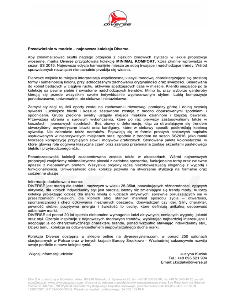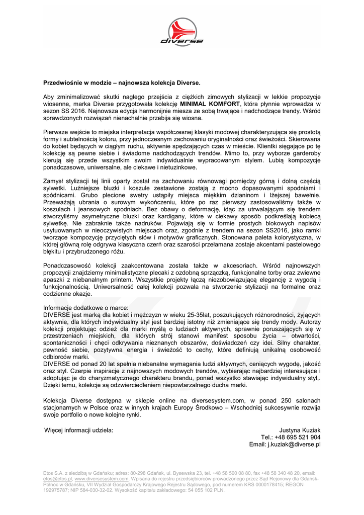 Przedwiośnie w modzie – najnowsza kolekcja Diverse. Aby zminimalizować skutki nagłego przejścia z ciężkich zimowych stylizacji w lekkie propozycje wiosenne, marka Diverse przygotowała kolekcję MINIMAL KOMFORT, która płynnie wprowadza w sezon SS 2016. Najnowsza edycja harmonijnie miesza ze sobą trwające i nadchodzące trendy. Wśród sprawdzonych rozwiązań nienachalnie przebija się wiosna. Pierwsze wejście to miejska interpretacja współczesnej klasyki modowej charakteryzująca się prostotą formy i subtelnością koloru, przy jednoczesnym zachowaniu oryginalności oraz świeżości. Skierowana do kobiet będących w ciągłym ruchu, aktywnie spędzających czas w mieście. Klientki sięgające po tę kolekcję są pewne siebie i świadome nadchodzących trendów. Mimo to, przy wyborze garderoby kierują się przede wszystkim swoim indywidualnie wypracowanym stylem. Lubią kompozycje ponadczasowe, uniwersalne, ale ciekawe i nietuzinkowe. Zamysł stylizacji tej linii oparty został na zachowaniu równowagi pomiędzy górną i dolną częścią sylwetki. Luźniejsze bluzki i koszule zestawione zostają z mocno dopasowanymi spodniami i spódnicami. Grubo plecione swetry ustąpiły miejsca miękkim dzianinom i lżejszej bawełnie. Przeważają ubrania o surowym wykończeniu, które po raz pierwszy zastosowaliśmy także w koszulach i jeansowych spodniach. Bez obawy o deformację, idąc za utrwalającym się trendem stworzyliśmy asymetryczne bluzki oraz kardigany, które w ciekawy sposób podkreślają kobiecą sylwetkę. Nie zabraknie także nadruków. Pojawiają się w formie prostych blokowych napisów usytuowanych w nieoczywistych miejscach oraz, zgodnie z trendem na sezon SS2016, jako ramki tworzące kompozycję przyciętych słów i motywów graficznych. Stonowana paleta kolorystyczna, w której główną rolę odgrywa klasyczna czerń oraz szarości przełamana zostaje akcentami pastelowego błękitu i przybrudzonego różu. Ponadczasowość kolekcji zaakcentowana została także w akcesoriach. Wśród najnowszych propozycji znajdziemy minimalistyczne plecaki z ozdobną sprzączką, funkcjonalne torby oraz zwiewne apaszki z niebanalnym printem. Wszystkie projekty łączą niezobowiązującą elegancję z wygodą i funkcjonalnością. Uniwersalność całej kolekcji pozwala na stworzenie stylizacji na formalne oraz codzienne okazje. Informacje dodatkowe o marce: DIVERSE jest marką dla kobiet i mężczyzn w wieku 25-35lat, poszukujących różnorodności, żyjących aktywnie, dla których indywidualny styl jest bardziej istotny niż zmieniające się trendy mody. Autorzy kolekcji projektując odzież dla marki myślą o ludziach aktywnych, sprawnie poruszających się w przestrzeniach miejskich, dla których strój stanowi manifest sposobu życia – otwartości, spontaniczności i chęci odkrywania nieznanych obszarów, doświadczeń czy idei. Silny charakter, pewność siebie, pozytywna energia i świeżość to cechy, które definiują unikalną osobowość odbiorców marki. DIVERSE od ponad 20 lat spełnia niebanalne wymagania ludzi aktywnych, ceniących wygodę, jakość oraz styl. Czerpie inspiracje z najnowszych modowych trendów, wybierając najbardziej interesujące i adoptując je do charyzmatycznego charakteru brandu, ponad wszystko stawiając indywidualny styl,. Dzięki temu, kolekcje są odzwierciedleniem niepowtarzalnego ducha marki. Kolekcja Diverse dostępna w sklepie online na diversesystem.com, w ponad 250 salonach stacjonarnych w Polsce oraz w innych krajach Europy Środkowo – Wschodniej sukcesywnie rozwija swoje portfolio o nowe kolejne rynki. Więcej informacji udziela: Justyna Kuziak Tel.: +48 695 521 904 Email: [email protected] Etos S.A. z siedzibą w Gdańsku; adres: 80-298 Gdańsk, ul. Bysewska 23, tel. +48 58 500 08 80, fax +48 58 340 48 20, email: [email protected], www.diversesystem.com. Wpisana do rejestru przedsiębiorców prowadzonego przez Sąd Rejonowy dla GdańskPółnoc w Gdańsku, VII Wydział Gospodarczy Krajowego Rejestru Sądowego, pod numerem KRS 0000178415; REGON 192975787; NIP 584-030-32-02. Wysokość kapitału zakładowego: 54 055 102 PLN.