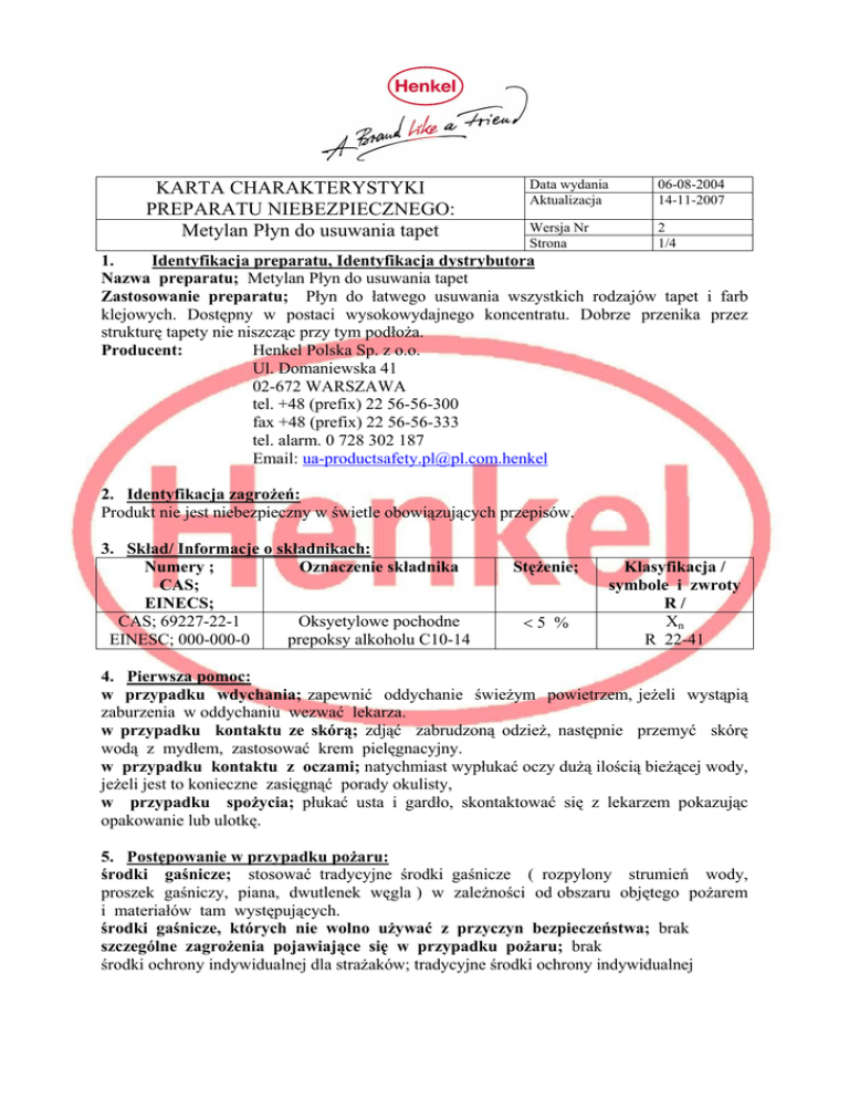 KARTA CHARAKTERYSTYKI PREPARATU NIEBEZPIECZNEGO: Metylan Płyn do usuwania tapet Data wydania Aktualizacja 06-08-2004 14-11-2007 Wersja Nr Strona 2 1/4 1. Identyfikacja preparatu, Identyfikacja dystrybutora Nazwa preparatu; Metylan Płyn do usuwania tapet Zastosowanie preparatu; Płyn do łatwego usuwania wszystkich rodzajów tapet i farb klejowych. Dostępny w postaci wysokowydajnego koncentratu. Dobrze przenika przez strukturę tapety nie niszcząc przy tym podłoża. Producent: Henkel Polska Sp. z o.o. Ul. Domaniewska 41 02-672 WARSZAWA tel. +48 (prefix) 22 56-56-300 fax +48 (prefix) 22 56-56-333 tel. alarm. 0 728 302 187 Email: [email protected] 2. Identyfikacja zagrożeń: Produkt nie jest niebezpieczny w świetle obowiązujących przepisów. 3. Skład/ Informacje o składnikach: Numery ; Oznaczenie składnika CAS; EINECS; CAS; 69227-22-1 Oksyetylowe pochodne EINESC; 000-000-0 prepoksy alkoholu C10-14 Stężenie; <5 % Klasyfikacja / symbole i zwroty R/ Xn R 22-41 4. Pierwsza pomoc: w przypadku wdychania; zapewnić oddychanie świeżym powietrzem, jeżeli wystąpią zaburzenia w oddychaniu wezwać lekarza. w przypadku kontaktu ze skórą; zdjąć zabrudzoną odzież, następnie przemyć skórę wodą z mydłem, zastosować krem pielęgnacyjny. w przypadku kontaktu z oczami; natychmiast wypłukać oczy dużą ilością bieżącej wody, jeżeli jest to konieczne zasięgnąć porady okulisty, w przypadku spożycia; płukać usta i gardło, skontaktować się z lekarzem pokazując opakowanie lub ulotkę. 5. Postępowanie w przypadku pożaru: środki gaśnicze; stosować tradycyjne środki gaśnicze ( rozpylony strumień wody, proszek gaśniczy, piana, dwutlenek węgla ) w zależności od obszaru objętego pożarem i materiałów tam występujących. środki gaśnicze, których nie wolno używać z przyczyn bezpieczeństwa; brak szczególne zagrożenia pojawiające się w przypadku pożaru; brak środki ochrony indywidualnej dla strażaków; tradycyjne środki ochrony indywidualnej KARTA CHARAKTERYSTYKI PREPARATU NIEBEZPIECZNEGO: Metylan Płyn do usuwania tapet Data wydania Aktualizacja 06-08-2004 14-11-2007 Wersja Nr Strona 2 2/4 6. Postępowanie w przypadku uwolnienia do środowiska: indywidualne środki ostrożności; Długotrwałe narażenie na pary może powodować podrażnienie błon śluzowych. Unikać kontaktu ze skórą oraz oczami. Podczas likwidacji, korzystać ze środków ochrony indywidualnej. metody oczyszczania; Należy usunąć stosując materiał wchłaniający ciecz (piasek, torf, trociny). Postępować zgodnie z pkt. 13. 7. Obchodzenie się z substancją i magazynowanie: wskazówki bezpiecznego obchodzenia się z preparatem; Nie dopuszczać do kontaktu ze skórą i oczami. Stosować w dobrze wentylowanych pomieszczeniach. Należy stosować środki ochrony indywidualnej zgodnie z rozdziałem 8. wymagania dotyczące pomieszczeń magazynowych i opakowań; Przechowywać wyłącznie w oryginalnym opakowaniu Chronić przed mrozem. Nie przechowywać razem z jedzeniem ani żadnymi produktami konsumpcyjnymi ( kawa, herbata, tytoń, itd.). 8. Kontrola narażenia/środki ochrony indywidualnej: kontrola narażenia NDS, NDSCh, NDSP; brak Podstawa prawna; Rozporządzenie Ministra Pracy i Polityki Socjalnej z dnia 29 listopada 2002 r. w sprawie najwyższych stężeń i natężeń czynników szkodliwych dla zdrowia ( Dz. U Nr 217, poz. 1833 ) z późniejszymi zmianami osobiste środki ochrony: Unikać kontaktu z oczami i skórą, nie jeść, nie pić podczas pracy. Umyć ręce przed przerwą w pracy oraz po jej zakończeniu. ochrona dróg oddechowych: zapewnić odpowiednią wentylację podczas pracy. ochrona skóry: ubranie ochronne. ochrona dłoni: ogólno dostępne rękawice ochronne. Rękawice ochronne należy zawsze sprawdzić pod względem przydatności dla konkretnego miejsca pracy oraz wymieniać natychmiast po zaobserwowaniu pierwszych objawów zużycia. Należy zawsze przestrzegać instrukcji dostarczonych przez producenta rękawic organicznych. ochrona oczu: okulary ochronne. 9. Właściwości fizykochemiczne: Stan skupienia Kolor Zapach pH Rozpuszczalność Gęstość Temperatura zapłonu - płyn przezroczysty bezwonny 8,5 – 11 dobra rozpuszczalność, rozpuszczalnik - woda 0,99 – 1,01 g/cm3 > 100 °C KARTA CHARAKTERYSTYKI PREPARATU NIEBEZPIECZNEGO: Metylan Płyn do usuwania tapet Data wydania Aktualizacja 06-08-2004 14-11-2007 Wersja Nr Strona 2 3/4 10. Stabilność i reaktywność: warunki jakich należy unikać – żadne jeżeli używany zgodnie z przeznaczeniem. materiały z którymi należy unikać kontaktu – nie są znane. niebezpieczne produkty rozkładu - żadne jeżeli używany zgodnie z przeznaczeniem 11. Informacje toksykologiczne: Długotrwałe narażenie na pary może powodować podrażnienie błon śluzowych. 12. Informacje ekologiczne: Nie dopuszczać do przedostania się produktu do ścieków, gleby, wód powierzchniowych. Należy przestrzegać rozporządzenia Ministra Środowiska z dnia 29 listopada 2002 r.( Dz. U. Nr 212, poz. 1799) w sprawie warunków, jakie należy spełniać przy wprowadzaniu ścieków do wód lub do ziemi oraz w sprawie substancji szczególnie szkodliwych dla środowiska wodnego. 13. Postępowanie z odpadami: Produkt; Rozlany preparat zbierać materiałem absorbującym. Opakowanie; 15 01 02 Opakowania z tworzyw sztucznych. Tylko puste opakowania ze śladami wyschniętego produktu mogą być poddane odzyskowi. Przestrzegać przepisów ustawy o odpadach z 27 kwietnia 2001 r. ( Dz. U. Nr 62, poz. 628 )z późniejszymi zmianami oraz przepisów ustawy o opakowaniach i odpadach opakowaniowych z 27 kwietnia 2001 r. ( Dz. U. Nr 63, poz. 638 ) z późniejszymi zmianami. 14. Informacje o transporcie: Nie jest towarem niebezpiecznym w myśl przepisów o transporcie 15. Informacje dotyczące uregulowań prawnych: Informacje podawane na etykiecie. Nie wymagane jest szczególne oznakowanie produktu. Znak ostrzegawczy - brak Rodzaj zagrożeń 