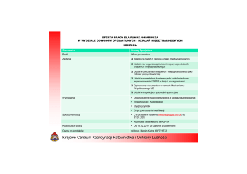 OFERTA PRACY DLA FUNKCJONARIUSZA W WYDZIALE ODWODÓW OPERACYJNYCH I DZIAŁAŃ MIĘDZYNARODOWYCH KCKRIOL Stanowisko Starszy Specjalista Profil Oficer pożarnictwa Zadania Realizacja zadań z zakresu działań międzynarodowych Nadzór nad organizacją ćwiczeń międzywojewódzkich, krajowych i międzynarodowych Udział w ćwiczeniach krajowych i międzynarodowych jako członek grupy ratowniczej Udział w warsztatach, konferencjach i szkoleniach oraz reprezentowanie KGPSP w kraju i poza granicami Opiniowanie dokumentów w ramach Mechanizmu Wspólnotowego UE Udział w inspekcjach gotowości operacyjnej Wymagania • Doświadczenie zawodowe zgodnie z tabelą zaszeregowania • Znajomość jęz. Angielskiego • Dyspozycyjność • Chęć podnoszenia kwalifikacji Sposób rekrutacji • CV (przesłane na adres [email protected]) do 31.01.2017 • Rozmowa kwalifikacyjna w KGPSP Rozpoczęcie pracy • Od 15.02.2017 lub zgodnie z ustaleniami Osoba do kontaktów mł. bryg. Marcin Kędra, 697721772 Krajowe Centrum Koordynacji Ratownictwa i Ochrony Ludności