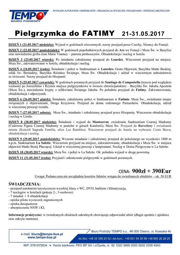 Pielgrzymka do FATIMY 21-31.05.2017 DZIEŃ 1 (21.05.2017 niedziela): Wyjazd w godzinach wieczornych, nocny przejazd przez Czechy, Niemcy do Francji. DZIEŃ 2 (22.05.2017 poniedziałek): W godzinach popołudniowych przyjazd do Ars we Francji i Msza Św. w Bazylice oraz nawiedzenie grobu Jean Marie Vianney – patrona proboszczów. Obiadokolacja i nocleg w hotelu. DZIEŃ 3 (23.05.2017 wtorek): Po śniadaniu całodzienny przejazd do Lourdes. Wieczorem przyjazd na miejsce, Msza Św., zakwaterowanie w hotelu, obiadokolacja i nocleg. DZIEŃ 4 (24.05.2017 środa): Śniadanie i pobyt w Sanktuarium w Lourdes: Grota Objawień, Bazylika Matki Boskiej, szlak św. Bernadety, Bazylika Różańca Świętego, Msza Św. Obiadokolacja i udział w wieczornym nabożeństwie ze świecami. Nocny przejazd do Hiszpanii. DZIEŃ 5 (25.05.2017 czwartek): W godzinach porannych przyjazd do Santiago de Compostella (trzecie pod względem ważności po Jerozolimie i Rzymie miejsce pielgrzymkowe w świecie chrześcijańskim) – Bazylika Św. Jakuba Apostoła (Msza Św.), nawiedzenie krypty z relikwiami Świętego Jakuba. Po południu przyjazd do Fatimy. Zakwaterowanie, obiadokolacja i odpoczynek. DZIEŃ 6 (26.05.2017 piątek): Śniadanie, całodzienny pobyt w Sanktuarium w Fatimie: Msza Św., zwiedzanie miejsc związanych z objawieniami, Droga Krzyżowa. Przejazd do domu rodzinnego Pastuszków. Obiadokolacja, udział w wieczornej procesji światła. DZIEŃ 7 (27.05.2017 sobota): Msza Św., śniadanie i całodzienny przejazd przez Hiszpanię. Wieczorem obiadokolacja i nocleg w Lleida. DZIEŃ 8 (28.05.2017 niedziela): Śniadanie i wyjazd do Montserrat, zwiedzanie Sanktuarium Czarnej Madonny (Cudowna Figura Czarnej Madonny w pustelni w górach Katalonii), Msza Św. Przejazd do Barcelony i zwiedzanie miasta (Kościół Sagrada Familia, ulica Las Ramblas). Wieczorem przejazd do hotelu na wybrzeże Costa Brava, obiadokolacja i nocleg. DZIEŃ 9 (29.05.2017 poniedziałek): Wczesne śniadanie i całodzienny przejazd do położonego na wysokości 1800 m n.p.m. Sanktuarium La Salette. Wieczorem przyjazd na miejsce, zakwaterowanie, obiadokolacja i Msza Św. w miejscu objawień Matki Bożej Płaczącej. Udział w wieczornej procesji z lampionami. Nocleg w Domu Pielgrzyma w La Salette. DZIEŃ 10 (30.05.2017 wtorek): Msza Św. i pobyt w La Salette. Ok. południa wyjazd w drogę powrotną. DZIEŃ 11 (31.05.2017 środa): Przyjazd i zakończenie pielgrzymki w godzinach porannych. CENA: 900zł + 390Eur Uwaga: Podana cena nie uwzględnia kosztów biletów wstępu do zwiedzanych obiektów – ok. 50 EUR ŚWIADCZENIA: - przejazd autokarem turystycznym wysokiej klasy z WC, DVD, barkiem i klimatyzacją. - 7 noclegów w hotelach (pokoje 2-, 3-osobowe) - 7 śniadań i 8 obiadokolacji - opieka pilota wycieczek zagranicznych - opieka duszpasterza - ubezpieczenie NNW i KL Informacje praktyczne: w zwiedzanych obiektach sakralnych obowiązuje odpowiedni ubiór (długie spodnie i spódnice oraz zakryte ramiona).