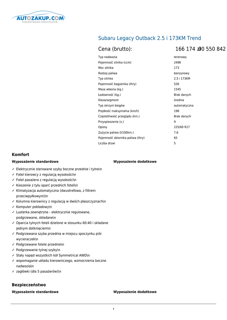 Subaru Legacy Outback 2.5 i 173KM Trend Cena (brutto): Typ nadwozia terenowy Pojemność silnika (ccm) 2498 Moc silnika 173 Rodzaj paliwa benzynowy Typ silnika 2.5 i 173KM Pojemność bagażnika (litry) 526 Masa własna (kg.) 1545 Ładowność (kg.) Brak danych Klasa/segment średnia Typ skrzyni biegów automatyczna Prędkość maksymalna (km/h) 198 Częstotliwość przeglądu (km.) Brak danych Przyspieszenie (s.) 9 Opony 225/60 R17 Zużycie paliwa (l/100km.) 7.6 Pojemność zbiornika paliwa (litry) 65 Liczba drzwi 5 Komfort Wyposażenie standardowe Wyposażenie dodatkowe ✓ Elektrycznie sterowane szyby boczne przednie i tylne\n ✓ Fotel kierowcy z regulacją wysokości\n ✓ Fotel pasażera z regulacją wysokości\n ✓ Kieszenie z tyłu oparć przednich foteli\n ✓ Klimatyzacja automatyczna (dwustrefowa, z filtrem przeciwpyłkowym)\n ✓ Kolumna kierownicy z regulacją w dwóch płaszczyznach\n ✓ Komputer pokładowy\n ✓ Lusterka zewnętrzne - elektrycznie regulowane, podgrzewane, składane\n ✓ Oparcia tylnych foteli dzielone w stosunku 60:40 i składane jednym dotknięciem\n ✓ Podgrzewana szyba przednia w miejscu spoczynku piór wycieraczek\n ✓ Podgrzewane fotele przednie\n ✓ Podgrzewanie tylnej szyby\n ✓ Stały napęd wszystkich kół Symmetrical AWD\n ✓ wspomaganie układu kierowniczego, wzmocnienia boczne nadwozia\n ✓ zagłówki (dla 5 pasażerów)\n Bezpieczeństwo Wyposażenie standardowe 166 174 .00 zł 550 842 Wyposażenie dodatkowe 1 ✓ 3-punktowe pasy bezpieczeństwa\n ✓ Assistance\n ✓ Inteligentny System Ratunkowy (ISR)Inteligentny System ratunkowy używajac sygnału GPS przekazuje automatycznie w sytuacji awaryjnejinformacje do stale funkcjonujacego centrum monitoringu. Umożliwia to natychmiastowe zweryfikowaniezdarzenia i powiadomienie\n ✓ Kurtyny powietrzne boczne\n ✓ poduszki powietrzne kierowcy i pasażera boczne\n ✓ poduszki powietrzne kierowcy i pasażera przednie\n ✓ System kontroli trakcji i stabilizacji toru jazdy (VDCS)\n ✓ system wspomagania hamowania awaryjnego (elektroniczny)\n ✓ wskaźnik zapięcia pasów bezpieczeństwa (przednich foteli)\n ✓ Zabezpieczenie drzwi tylnych przed otwarciem przez dzieci\n Dodatki Wyposażenie standardowe Wyposażenie dodatkowe ✓ 17" felgi aluminiowe\n ✓ ABS 4-kanałowy z funkcjąEBD (elektroniczny rozdział sił hamowania)\n ✓ amortyzatory samopoziomujące (tylna oś )\n ✓ Antena radiowa w szybie\n ✓ czujnik światła dla automatycznej aktywacji świateł mijania\n ✓ demontowalna roleta bagażnika ze schowkiem\n ✓ Elektroniczny hamulec postojowy\n ✓ filtr czastek stałych (DPF)\n ✓ Fotel kierowcy regulowany elektrycznie\n ✓ hamulce tarczowe przednie (wentylowane)\n ✓ hamulce tarczowe tylne\n ✓ Immobilizer\n ✓ Kamera cofania\n ✓ Kierownica obszyta skóra\n ✓ Kieszenie w drzwiach z uchwytami na napoje\n ✓ konsola centralna z gniazdem 12V\n ✓ Lampki do czytania z przodu\n ✓ Listwy ozdobne kokpitu w kolorze srebrnym\n ✓ Lusterka zewnętrzne z wbudowanymi kierunkowskazami LED\n ✓ Manetki zmiany biegów przy kierownicy\n ✓ Napinacze pasów bezpieczeństwa\n ✓ Obrotomierz\n ✓ oparcia tylnych foteli z regulacją kąta nachylenia\n ✓ Oświetlenie kabiny z wyłącznikiem czasowym\n ✓ Oświetlenie przestrzeni bagażowej\n ✓ podswietlana stacyjka\n ✓ Podświetlane lusterka w osłonach przeciwsłonecznych\n ✓ 2 Podłokietnik w tylnym rzędzie siedzeń\n 3 ✓ Przednie reflektory halogenowe\n ✓ Reflektory przeciwmgłowe\n ✓ regulacja wysokości przednich pasów bezpieczeństwa\n ✓ Relingi dachowe w kolorze czarnym\n ✓ skrzynia biegów automatyczna bezstopniowa Lineartronic\n ✓ System audio z możliwością odczytu formatów MP3 i WMA\n ✓ System audio z odtwarzaczem CD i 6 głośnikami\n ✓ system audio z przyciskami sterowania w kierownicy\n ✓ system audio z wejściami AUX-IN i USB\n ✓ System głośnomówiący oparty na technologii Bluetooth z przyciskami sterowania w kierownicy\n ✓ system montażu fotelików dziecięcych ISOFIX\n ✓ tempomat z przyciskami sterowania w kierownicy\n ✓ Termometr zewnętrzny\n ✓ trzy miejsca siedzące z 3 zagłówkami w tylnym rzędzie siedzeń\n ✓ Uchwyty na napoje z przodu i z tyłu\n ✓ Wskaznik zuzycia paliwa ECO\n ✓ Wycieraczka szyby tylnej z regulowaną prędkością (ze spryskiwaczem)\n ✓ Wycieraczki przedniej szyby z czujnikiem deszczu\n ✓ Zdalnie sterowany centralny zamek\n ✓ Zderzaki w kolorze nadwozia\n ✓ Zegar cyfrowy\n ✓ Zestaw naprawczy do kół z kompresorem\n Doprecyzowanie oferty Kontakt: Nazwa użytkownika: admin Nazwa firmy: qqq Adres: qqq 12, 41-706 qqq1, NIP: 954 REGON: 1 Telefon: 123, 1 Fax: 1 Email: 1 www: 4
