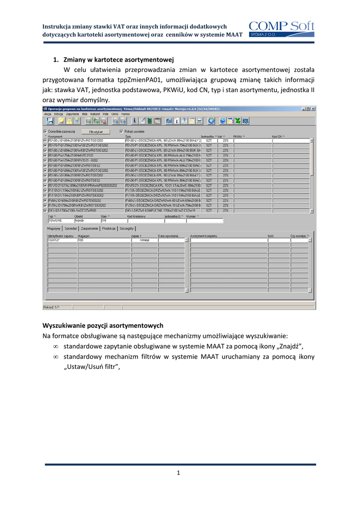 Instrukcja zmiany stawki VAT oraz innych informacji dodatkowych dotyczących kartoteki asortymentowej oraz cenników w systemie MAAT 1. Zmiany w kartotece asortymentowej W celu ułatwienia przeprowadzania zmian w kartotece asortymentowej została przygotowana formatka tppZmienPA01, umożliwiająca grupową zmianę takich informacji jak: stawka VAT, jednostka podstawowa, PKWiU, kod CN, typ i stan asortymentu, jednostka II oraz wymiar domyślny. Wyszukiwanie pozycji asortymentowych Na formatce obsługiwane są następujące mechanizmy umożliwiające wyszukiwanie: • standardowe zapytanie obsługiwane w systemie MAAT za pomocą ikony „Znajdź”, • standardowy mechanizm filtrów w systemie MAAT uruchamiany za pomocą ikony „Ustaw/Usuń filtr”, 1 Instrukcja zmiany stawki VAT oraz innych informacji dodatkowych dotyczących kartoteki asortymentowej oraz cenników w systemie MAAT • przy użyciu mechanizmu filtrowania etykiet indeksu, wywoływanego za pomocą przycisku „Filtr etykiet”. Umożliwia on ograniczenie wyników wyszukiwania wg wartości dla wybranych składowych indeksu. Dodatkowe parametry: • „Domyślnie zaznaczaj” – gdy ten parametr jest zaznaczony, wówczas zwrócone wyniki zapytania zostaną automatycznie zaznaczone. W celu zaznaczenia/odznaczenia wybranych pozycji asortymentowych należy kliknąć na checkbox znajdujący się obok danej pozycji. Opcja zaznaczenia/odznaczenia wszystkich wyświetlonych pozycji asortymentowych jest dostępna z menu kontekstowego nad polami checkbox. • „Pokaż usunięte” - gdy ten parametr jest zaznaczony, wówczas wyświetlone zostaną również pozycje asortymentowe, które znajdują się w stanie USUN. 2 Instrukcja zmiany stawki VAT oraz innych informacji dodatkowych dotyczących kartoteki asortymentowej oraz cenników w systemie MAAT Zmiana informacji dodatkowych Zmiana informacji dodatkowych możliwa jest dla wybranej pozycji asortymentowej lub grupowo dla wszystkich zaznaczonych pozycji. Dla takich informacji jak: stawka VAT, jednostka podstawowa, PKWiU, kod CN, typ i stan asortymentu, jednostkę II oraz wymiar domyślny dostępne są kontekstowo dwie opcje, umożliwiające zmianę danej wartości dla wybranej pozycji asortymentowej lub wszystkich zaznaczonych pozycji. Na przykład w celu zmiany jednostki podstawowej należy wybrać kontekstowo opcję „Zmień jednostkę dla pozycji” lub „Zmień jednostkę dla zaznaczonych pozycji”. Następnie zostanie wyświetlona lista wartości ze zdefiniowanymi jednostkami w systemie. Po wybraniu odpowiedniej jednostki należy zapisać zmiany za pomocą ikony „Zapisz”. W analogiczny sposób przeprowadzane są zmiany dla pozostałych informacji w kartotece asortymentowej. Informacje dodatkowe: • jednostkę podstawową asortymentu można zmieniać tylko dla indeksów, które nie mają zapasu na żadnym magazynie. Jeżeli istnieje zapas system zablokuje możliwość wykonania takiej zmiany, • stan asortymentu zmieniany jest poprzez rejestr zmian stanów – wywoływane jest dodatkowe okno na którym rejestrowana jest zmiana stanu i powód zmiany stanu, który musi zostać wypełniony. 3 Instrukcja zmiany stawki VAT oraz innych informacji dodatkowych dotyczących kartoteki asortymentowej oraz cenników w systemie MAAT 2. Zmiany w cennikach Do przeprowadzania zmian w cennikach została przygotowana formatka spZmVat01, umożliwiająca m.in.: • tworzenie kopii cenników wraz z automatyczną modyfikacją stawek VAT, • aktualizację programów sprzedaży, • grupową aktualizację stawki VAT dla wybranych pozycji asortymentowych. Zakładka „Cenniki” Na zakładce „Cenniki” wyświetlane są aktywne cenniki na wskazany dzień (data aktywności). Listę cenników można ograniczyć przy pomocy standardowych mechanizmów wyszukiwania dostępnych w systemie MAAT (ikona „Znajdź”). Dodatkowo można wykorzystać dostępne parametry filtrowania: • „Ukryj cenniki posiadające kopię” – cenniki dla których została utworzona kopia nie będą wyświetlone, • „Ukryj cenniki, które są kopią” – cenniki, które były utworzone podczas operacji kopiowania nie będą wyświetlone, • „Pokaż cenniki występujące w aktywnych programach sprzedaży” – cenniki, które nie występują w aktywnych programach sprzedaży nie będą wyświetlone. 4 Instrukcja zmiany stawki VAT oraz innych informacji dodatkowych dotyczących kartoteki asortymentowej oraz cenników w systemie MAAT Lista cenników przedstawia następujące informacje: • nazwę i opis cennika, • daty obowiązywania cennika „od – do”, • typ cennika, • stan cennika, • opcja VAT – przy tworzeniu kopii cennika możemy wybrać jedną z następujących opcji według której zostanie przypisana stawka VAT przy pozycjach asortymentowych w cenniku: o „Bez zmian” – stawki VAT zostaną przeniesione z cennika źródłowego, o „Z kartoteki asort.” – stawka VAT zostanie przeniesiona z kartoteki asortymentowej, o „Zwiększ VAT o 1%” – stawka VAT zostanie zwiększona o 1 punkt procentowy w stosunku do pozycji źródłowej, • postfix – tekst, który zostanie dodany do nazwy tworzonej kopii cennika (domyślna wartość NOWY, można zastosować inne oznaczenia np. OD_2011) • waluta cennika, • programy sprzedaży w których wybrany cennik występuje. Legenda określa: • kolor niebieski – cennik posiada kopię, • kolor zielony – cennik jest kopią, • kolor pomarańczowy – cennik występuje w programach sprzedaży. Zaznaczanie i odznaczanie cenników odbywa się za pomocą pola checkbox przy danym cenniku poprzez pojedyncze zaznaczenie/odznaczenie lub z menu kontekstowego dla wyświetlonych cenników. Ustawienia pól „Opcja VAT” oraz „Postfix” mogą być dokonywane zbiorczo z menu kontekstowego dla zaznaczonych pozycji. Tworzenie kopii cennika/cenników W celu utworzenia kopii cennika/cenników należy zaznaczyć cennik/cenniki dla których mają być