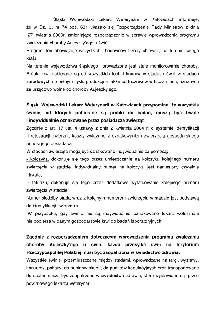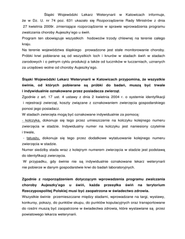 Śląski Wojewódzki Lekarz Weterynarii w Katowicach informuje, że w Dz. U. nr 74 poz. 631 ukazało się Rozporządzenie Rady Ministrów z dnia 27 kwietnia 2009r. zmieniające rozporządzenie w sprawie wprowadzenia programu zwalczania choroby Aujeszky’ego u świń. Program ten obowiązuje wszystkich hodowców trzody chlewnej na terenie całego kraju. Na terenie województwa śląskiego prowadzone jest stałe monitorowanie choroby. Próbki krwi pobierane są od wszystkich loch i knurów w stadach świń w stadach zarodowych i o pełnym cyklu produkcji a także od tuczników w tuczarniach, uznanych za urzędowo wolne od choroby Aujeszky’ego. Śląski Wojewódzki Lekarz Weterynarii w Katowicach przypomina, że wszystkie świnie, od których pobierane są próbki do badań, muszą być trwale i indywidualnie oznakowane przez posiadacza zwierząt. Zgodnie z art. 17 ust. 4 ustawy z dnia 2 kwietnia 2004 r. o systemie identyfikacji i rejestracji zwierząt, koszty związane z oznakowaniem zwierzęcia gospodarskiego ponosi jego posiadacz. W stadach zwierzęta mogą być oznakowane indywidualnie za pomocą: - kolczyka, dokonuje się tego przez umieszczenie na kolczyku kolejnego numeru zwierzęcia w stadzie. Indywidualny numer na kolczyku jest naniesiony czytelnie i trwale, - tatuażu, dokonuje się tego przez dodatkowe wytatuowanie kolejnego numeru zwierzęcia w stadzie. Numer siedziby stada wraz z kolejnym numerem zwierzęcia w stadzie jest podstawą do identyfikacji zwierzęcia. W przypadku, gdy świnie nie są indywidualnie oznakowane lekarz weterynarii nie pobierze w danym gospodarstwie krwi do badań laboratoryjnych. Zgodnie z rozporządzeniem dotyczącym wprowadzenia programu zwalczania choroby Aujeszky’ego u świń, każda przesyłka świń na terytorium Rzeczypospolitej Polskiej musi być zaopatrzona w świadectwo zdrowia. Wszystkie świnie przemieszczane między stadami, wprowadzane na targi, wystawy, konkursy, pokazy, do punktów skupu, do punktów kopulacyjnych oraz transportowane do rzeźni muszą być zaopatrzone w świadectwa zdrowia, które wystawiane są przez powiatowego lekarza weterynarii. Świadectwo zdrowia wystawiane przez Powiatowego Lekarza Weterynarii powinno zawierać następujące informacje: 1) numer świadectwa; 2) określenie organu wydającego świadectwo; 3) liczbę zwierząt; 4) numery identyfikacyjne zwierząt; 5) pochodzenie zwierząt; 6) przeznaczenie zwierząt, jeżeli jest możliwe do określenia; 7) środek transportu i jego numer rejestracyjny; 8) informację o spełnieniu przez świnie wymagań zdrowotnych określonych w przepisach ustawy z dnia 11 marca 2004 r. o ochronie zdrowia zwierząt oraz zwalczaniu chorób zakaźnych zwierząt i w przepisach wykonawczych wydanych na jej podstawie; 9) informację o występowaniu choroby Aujeszky’ego w stadzie pochodzenia zwierząt; 10) datę, pieczęć i podpis właściwego urzędowego lekarza weterynarii. Każdy, kto zakupi świnie na targu, ma obowiązek posiadać świadectwo zdrowia, potwierdzające pochodzenie świni. W przypadku gdy rolnik wprowadzi do gospodarstwa świnie bez świadectwa zdrowia zwierząt, traci prawo do ewentualnego odszkodowania w przypadku stwierdzenia wyniku dodatniego badania w kierunku choroby Aujeszky’ego. Do stada zarodowego oraz o pełnym cyklu produkcji, które uzyskało status potencjalnie wolny, seronegatywny lub wolny od choroby Aujeszky’ego mogą być wprowadzane świnie lub ich materiał biologiczny pochodzące ze stad o równorzędnym lub wyższym statusie epizootycznym w odniesieniu do choroby Aujeszky’ego. Do tuczarni, która uzyskała status seronegatywny lub wolny od choroby Aujeszky’ego mogą być wprowadzane świnie tylko ze stad o równorzędnym lub wyższym statusie epizootycznym w odniesieniu do choroby Aujeszky’ego. Do stada zarodowego, o pełnym cyklu produkcji oraz tuczarni uznanych za urzędowo wolne od choroby Aujeszky’ego, mogą być wprowadzane świnie lub ich materiał biologiczny pochodzące ze stad o statusie urzędowo wolnym lub wolnym od choroby Aujeszky’ego. Jeżeli rolnik wprowadzi do stada świnie o niższym statusie epizootycznym w stosunku do choroby Aujeszky’ego niż status stada jaki posiada jego stado, stado traci status stada wolnego od choroby Aujeszky’ego, a rolnik traci prawo do ewentualnego odszkodowania w przypadku stwierdzenia wyniku dodatniego badania w kierunku choroby Aujeszky’ego. Powiatowy lekarz weterynarii właściwy ze względu na miejsce położenia stada, do którego wprowadzono świnie lub materiał biologiczny pochodzący od świń, niespełniający wymagań zdrowotnych określonych w programie, lub w przypadku materiału biologicznego, w odrębnych przepisach, albo gdy dla wprowadzonych do stada świń lub materiału biologicznego nie wystawiono świadectwa zdrowia, nadaje temu stadu, w drodze decyzji, status stada podejrzanego o zakażenie wirusem choroby Aujeszky’ego oraz: 1) zakazuje: a) przemieszczania z i do stada świń oraz ich nasienia i zarodków, b) wystawiania świadectw zdrowia dla świń znajdujących się w stadzie oraz ich nasienia i zarodków; 2) przeprowadza badanie serologiczne w kierunku choroby Aujeszky’ego wszystkich świń w stadzie (za przeprowadzenie badań pobiera się od posiadacza zwierząt opłaty). Uchylanie się przez rolnika od obowiązków zapisanych w rozporządzeniu będzie skutkowało zawieszeniem statusów stad, rolnik nie będzie mógł wprowadzać nowych sztuk do stada i sprzedawać trzody chlewnej do innych gospodarstw. W przypadku zawieszenia statusu stada trzoda chlewna może być sprzedawana tylko do rzeźni i musi być zaopatrzona w świadectwo zdrowia wystawione przez powiatowego lekarza weterynarii (świadectwo zdrowia z czerwonym paskiem). Program jest finansowany z budżetu państwa (hodowca nie ponosi kosztów dojazdów lekarza, pobrania krwi i badań laboratoryjnych). W przypadku gdy hodowca nie wyraża zgody na przeprowadzanie badań w stadach świń