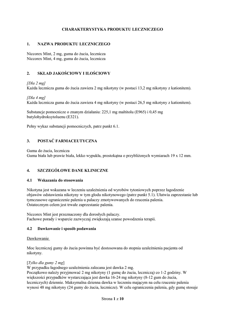 CHARAKTERYSTYKA PRODUKTU LECZNICZEGO 1. NAZWA PRODUKTU LECZNICZEGO Niccorex Mint, 2 mg, guma do żucia, lecznicza Niccorex Mint, 4 mg, guma do żucia, lecznicza 2. SKŁAD JAKOŚCIOWY I ILOŚCIOWY [Dla 2 mg] Każda lecznicza guma do żucia zawiera 2 mg nikotyny (w postaci 13,2 mg nikotyny z kationitem). [Dla 4 mg] Każda lecznicza guma do żucia zawiera 4 mg nikotyny (w postaci 26,5 mg nikotyny z kationitem). Substancje pomocnicze o znanym działaniu: 225,1 mg maltitolu (E965) i 0,45 mg butylohydroksytoluenu (E321). Pełny wykaz substancji pomocniczych, patrz punkt 6.1. 3. POSTAĆ FARMACEUTYCZNA Guma do żucia, lecznicza Guma biała lub prawie biała, lekko wypukła, prostokątna o przybliżonych wymiarach 19 x 12 mm. 4. SZCZEGÓŁOWE DANE KLINICZNE 4.1 Wskazania do stosowania Nikotyna jest wskazana w leczeniu uzależnienia od wyrobów tytoniowych poprzez łagodzenie objawów odstawienia nikotyny w tym głodu nikotynowego (patrz punkt 5.1). Ułatwia zaprzestanie lub tymczasowe ograniczenie palenia u palaczy zmotywowanych do rzucenia palenia. Ostatecznym celem jest trwałe zaprzestanie palenia. Niccorex Mint jest przeznaczony dla dorosłych palaczy. Fachowe porady i wsparcie zazwyczaj zwiększają szanse powodzenia terapii. 4.2 Dawkowanie i sposób podawania Dawkowanie Moc leczniczej gumy do żucia powinna być dostosowana do stopnia uzależnienia pacjenta od nikotyny. [Tylko dla gumy 2 mg] W przypadku łagodnego uzależnienia zalecana jest dawka 2 mg. Początkowo należy przyjmować 2 mg nikotyny (1 gumę do żucia, leczniczą) co 1-2 godziny. W większości przypadków wystarczająca jest dawka 16-24 mg nikotyny (8-12 gum do żucia, leczniczych) dziennie. Maksymalna dzienna dawka w leczeniu mającym na celu rzucenie palenia wynosi 48 mg nikotyny (24 gumy do żucia, lecznicze). W celu ograniczenia palenia, gdy gumę stosuje Strona 1 z 10 się w przerwach między papierosami, maksymalna dawka dzienna wynosi 48 mg nikotyny (24 gumy do żucia, lecznicze). Rzucenie palenia tytoniu Czas leczenia ma charakter indywidualny. Leczenie zwykle trwa 3 miesiące. Po upływie tego czasu należy stopniowo zmniejszać liczbę zużywanych gum. Leczenie należy przerwać, gdy dzienna dawka została zredukowana do 2-4 mg nikotyny (1-2 leczniczych gum do żucia). Generalnie nie zaleca się regularnego stosowania gumy Niccorex Mint przez okres dłuższy niż 6 miesięcy. W pewnych przypadkach dłuższe leczenie może być jednak wymagane, by uniknąć nawrotu łaknienia tytoniu. Należy posiadać w zapasie kilka gum do żucia, leczniczych gdyż łaknienie tytoniu może pojawić się nagle. Jeśli nie udało się rzucić palenia tytoniu po 6 miesiącach leczenia, zaleca się zasięgnięcie opinii lekarza. [Tylko dla gumy 4 mg] W przypadku ciężkiego uzależnienia od nikotyny (wynik testu FTND /testu uzależnienia od nikotyny Fagerstrӧma/ ≥ 6 lub wypalanie ≥ 20 papierosów dziennie) lub w przypadku niepowodzenia leczenia za pomocą gumy o zawartości 2 mg nikotyny zaleca się stosowanie gumy do żucia, leczniczej zawierającej 4 mg nikotyny. Początkowo należy przyjmować 4 mg nikotyny (1 gumę do żucia leczniczą) co 1-2 godziny. W większości przypadków wystarczająca jest dawka 32-48 mg nikotyny (8-12 gum leczniczych) dziennie. Maksymalna dzienna dawka w leczeniu mającym na celu rzucenie palenia wynosi 64 mg nikotyny (16 gum do żucia, leczniczych). W celu ograniczenia palenia, gdy gumę stosuje się w przerwach między papierosami, maksymalna dawka dzienna wynosi 48 mg nikotyny (12 gum do żucia, leczniczych). Rzucenie palenia tytoniu Czas leczenia ma charakter indywidualny. Leczenie zwykle trwa 3 miesiące. Po upływie tego czasu należy stopniowo zmniejszać liczbę zużywanych gum. Leczenie należy przerwać, gdy dzienna dawka została zredukowana do 4-8 mg nikotyny (1-2 gum do żucia, leczniczych). Generalnie nie zaleca się regularnego stosowania gumy Niccorex Mint przez okres dłuższy niż 6 miesięcy. W pewnych przypadkach dłuższe leczenie może być jednak wymagane, by uniknąć nawrotu łaknienia tytoniu. Należy posiadać w zapasie kilka gum, gdyż łaknienie tytoniu może pojawić się nagle. Jeśli nie udało się rzucić palenia tytoniu po 6 miesiącach leczenia, zaleca się zasięgnięcie opinii lekarza. Odpowiednie doradztwo i wsparcie mogą zwiększyć skuteczność leczenia. Ograniczenie palenia tytoniu Produkt Niccorex Mint należy stosować w czasie pomiędzy wypalanymi papierosami w celu zmniejszenia łaknienia tytoniu i w ten sposób wydłużenia czasu bez palenia. Papierosy powinny być stopniowo zastępowane gumami leczniczymi z nikotyną. Jeśli w ciągu 6 miesięcy leczenia nie udało się ograniczyć liczby wypalanych papierosów o co najmniej 50%, należy zasięgnąć porady profesjonalisty. Należy podjąć próbę rzucenia palenia, kiedy tylko pojawi się motywacja ku temu, ale nie później niż 4 miesiące od rozpoczęcia leczenia. W tym celu należy stopniowo zmniejszać liczbę stosowanych gum do żucia, leczniczych na przykład zmniejszając liczbę o jedną gumę co 2-5 dni. Jeżeli w ciągu 4 miesięcy od rozpoczęcia leczenia nie jest możliwa zdecydowana próba rzucenia palenia, należy skonsultować się z lekarzem specjalistą. Nie zaleca się stosowania gumy do żucia Niccorex Mint przez okres dłuższy niż 6 miesięcy. Strona 2 z 10 Niektórzy byli palacze mogą wymagać dłuższego okresu leczenia, aby uniknąć powrotu do palenia. Niewykorzystane gumy należy zachować na wypadek nagłego pojawienia się głodu nikotynowego. Odpowiednie doradztwo i wsparcie mogą zwiększyć skuteczność leczenia. Stosowanie produktu Niccorex Mint u dzieci Niccorex Mint nie powinien być stosowany przez dzieci poniżej 18 roku życia, chyba że lekarz zdecydował inaczej. Skuteczność i bezpieczeństwo stosowania produktu Niccorex Mint u dzieci poniżej 18 roku życia nie zostały ustalone. Sposób podawania Podanie na śluzówkę jamy ustnej. Każdą leczniczą g