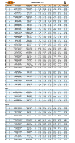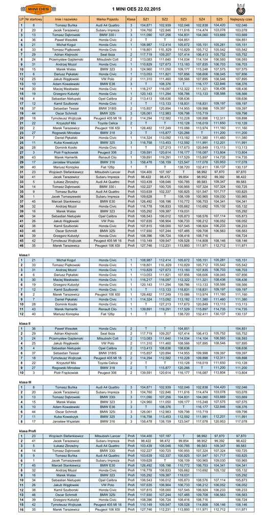 1 MINI OES 22.02.2015 LP Nr startowy 1 2 3 4 5 6 7 8 9 10 11 12 13 14 15 16 17 18 19 20 21 22 23 24 25 26 27 28 29 30 31 32 33 34 35 36 37 38 39 40 41 42 43 44 45 46 Imie i nazwisko Marka Pojazdu Klasa SZ1 SZ2 SZ3 SZ4 SZ5 Najlepszy czas 8 20 13 36 21 33 29 24 31 15 6 25 10 30 19 4 12 37 44 18 22 2 27 7 11 28 3 43 17 40 23 41 5 14 9 1 45 32 16 34 26 38 46 39 42 35 Tomasz Buńka Jacek Tarazewicz Tomasz Dąbrowski Paweł Wesołek Michał Kogut Tomasz Piątkowski Adrian Klejnocki Przemysław Gajdemski Andrzej Mozol Marek Walas Dariusz Pękalski Jakub Węgłowski Adam Kowalewski Maciej Masłowiec Grzegorz Kubzdyl Sebastian Nietupski Kamil Szulborski Sebastian Tessar Oscar Schmidt Tymoteusz Wojtczak Krzysztof Miś Marek Tarazewicz Rogowski Mirosław Daniel Pękalski Kuba Kowalczyk Dominik Kosiło Piotr Frąckowiak Marek Hamerlik Jarosław Wszelaki Mariusz Konopka Wojciech Stefankiewicz Jacek Tarazewicz Łukasz Zbrzeźny Tomasz Dąbrowski Tomasz Buńka Jacek Tomaszewski Marceli Stankiewicz Andrzej Mozol Marek Walas Sebastian Nietupski Jakub Węgłowski Kamil Szulborski Oscar Schmidt Grzegorz Kubzdyl Tymoteusz Wojtczak Marek Tarazewicz Audi A4 Quattro Subaru Impreza BMW 330 i Honda Civic Honda Civic Honda Civic Seat Ibiza Mitsubishi Colt Honda Civic BMW 323 Honda Civic VW Polo BMW E36 Honda Civic Honda Civic Opel Calibra Honda Civic BMW 318IS BMW 325i Peugeot 405 MI 16 Toyota Celica Peugeot 106 XSI BMW 318 Honda Civic BMW 325 Honda Civic Peugeot 306 Renault Clio BMW 316 Fiat 126p Mitsubishi Lancer Subaru Impreza Audi A4 Quattro BMW 330 i Audi A4 Quattro Subaru Impreza BMW E30 Honda Civic BMW 323 Opel Calibra VW Polo Honda Civic BMW 325i Honda Civic Peugeot 405 MI 16 Peugeot 106 XSI 3 3 3 2 1 1 2 2 1 3 1 2 3 1 1 2 1 2 3 2 2 1 2 1 3 1 2 1 3 1 Profi Profi Profi Profi Profi Profi Profi Profi Profi Profi Profi Profi Profi Profi Profi Profi 104,871 104,760 111,090 T 108,987 118,801 117,719 113,083 110,829 124,960 113,053 111,310 T 116,217 120,143 113,413 T 115,857 126,061 114,294 T 126,482 T 114,324 116,758 T 139,591 139,891 158,478 T 104,400 98,422 103,439 102,227 103,639 109,628 126,492 116,778 105,292 106,543 107,635 107,815 117,930 108,396 110,149 127,746 102,939 122,846 107,256 T 112,414 110,,829 109,207 111,640 127,673 111,050 111,821 111,460 108,376 116,097 111,294 108,636 113,133 120,894 112,983 112,582 T 117,249 115,877 113,092 113,453 127,213 120,614 119,291 138,159 T 107,187 98,472 108,046 100,725 102,337 T 108,196 106,833 109,387 106,012 106,904 108,000 107,244 106,724 109,547 112,231 102,046 111,616 104,831 104,851 105,672 110,829 107,414 114,034 113,183 109,177 107,856 108,566 T 112,322 108,786 108,636 118,831 114,955 109,798 110,228 110,128 115.086 120,266 113,182 112,592 117,673 116,177 117,529 123,547 138,720 T 99,854 100,785 100,955 100,825 108,109 110,772 105,662 119,031 105,873 106,733 107,545 107,485 108,416 109,528 113,893 102,838 114,474 104,060 104,420 103,078 103,669 105,151 105,712 106,413 114,104 107,835 115,248 108,606 107,895 116,177 111,321 113,133 105,281 105,542 105,752 106,593 106,703 107,575 108,045 108,546 122,846 108,436 108,566 118,831 109,998 115,719 109,898 116,019 113,974 T 111,380 111,991 120,849 116,087 115,897 117,078 132,411 98,992 98,952 99,583 107,324 101,547 100,965 106,753 110,692 109,197 109,397 108,576 106,212 106,924 109,708 108,716 114,808 111,971 107,114 106,052 106,233 102,046 103,078 103,669 104,851 105,151 105,542 105,752 106,593 106,703 107,575 107,856 107,895 108,376 108,436 108,566 108,636 109,197 109,397 109,798 109,898 110,128 111,160 111,200 111,380 111,991 113,113 113,804 114,735 117,078 130,137 97,870 98,422 99,583 100,725 100,825 100,965 104,341 105,132 105,292 105,873 106,052 106,233 106,563 106,724 108,146 111,971 21 33 31 6 30 19 12 2 7 28 43 40 Michał Kogut Tomasz Piątkowski Andrzej Mozol Dariusz Pękalski Maciej Masłowiec Grzegorz Kubzdyl Kamil Szulborski Marek Tarazewicz Daniel Pękalski Dominik Kosiło Marek Hamerlik Mariusz Konopka Honda Civic Honda Civic Honda Civic Honda Civic Honda Civic Honda Civic Honda Civic Peugeot 106 XSI Honda Civic Honda Civic Renault Clio Fiat 126p 1 1 1 1 1 1 1 1 1 1 1 1 108,987 118,801 110,829 113,053 116,217 120,143 T 126,482 114,324 T 139,891 T 112,414 110,,829 127,673 111,821 116,097 111,294 113,133 117,249 113,092 127,213 119,291 T 105,672 110,829 113,183 107,856 112,322 108,786 118,831 115.086 113,182 117,673 117,529 138,720 105,151 105,712 107,835 108,606 111,321 113,133 118,831 113,974 111,380 120,849 115,897 132,411 105,281 105,542 106,703 108,045 108,436 108,566 109,197 111,160 111,460 113,113 36 29 24 25 4 37 18 22 27 3 Paweł Wesołek Adrian Klejnocki Przemysław Gajdemski Jakub Węgłowski Sebastian Nietupski Sebastian Tessar Tymoteusz Wojtczak Krzysztof Miś Rogowski Mirosław Piotr Frąckowiak Honda Civic Seat Ibiza Mitsubishi Colt VW Polo Opel Calibra BMW 318IS Peugeot 405 MI 16 Toyota Celica BMW 318 Peugeot 306 2 2 2 2 2 2 2 2 2 2 T 117,719 113,083 111,310 113,413 115,857 114,294 T T 139,591 T 109,207 111,640 111,460 108,636 120,894 112,582 T 115,877 120,614 104,851 107,414 114,034 108,566 108,636 114,955 110,228 110,128 120,266 116,177 106,413 114,104 107,895 105,752 106,593 108,546 109,998 109,898 116,019 T 116,087 109,397 112,311 111,650 111,200 113,804 8 20 13 15 10 44 11 17 Tomasz Buńka Jacek Tarazewicz Tomasz Dąbrowski Marek Walas Adam Kowalewski Oscar Schmidt Kuba Kowalczyk Jarosław Wszelaki Audi A4 Quattro Subaru Impreza BMW 330i BMW 323 BMW E36 BMW 325i BMW 325 BMW 316 3 3 3 3 3 3 3 3 104,871 104,760 111,090 124,960 T 126,061 116,758 158,478 102,939 122,846 107,256 111,050 108,376 112,983 113,453 138,159 102,046 111,616 104,831 109,177 T 109,798 112,592 123,547 102,838 114,474 104,060 115,248 116,177 115,719 111,991 117,078 104,420 103,078 103,669 107,575 122,846 Wojciech Stefankiewicz Jacek Tarazewicz Łukasz Zbrzeźny Tomasz Dąbrowski Tomasz Buńka Jacek Tomaszewski Marceli Stankiewicz Andrzej Mozol Marek Walas Sebastian Nietupski Jakub Węgłowski Kamil Szulborski O