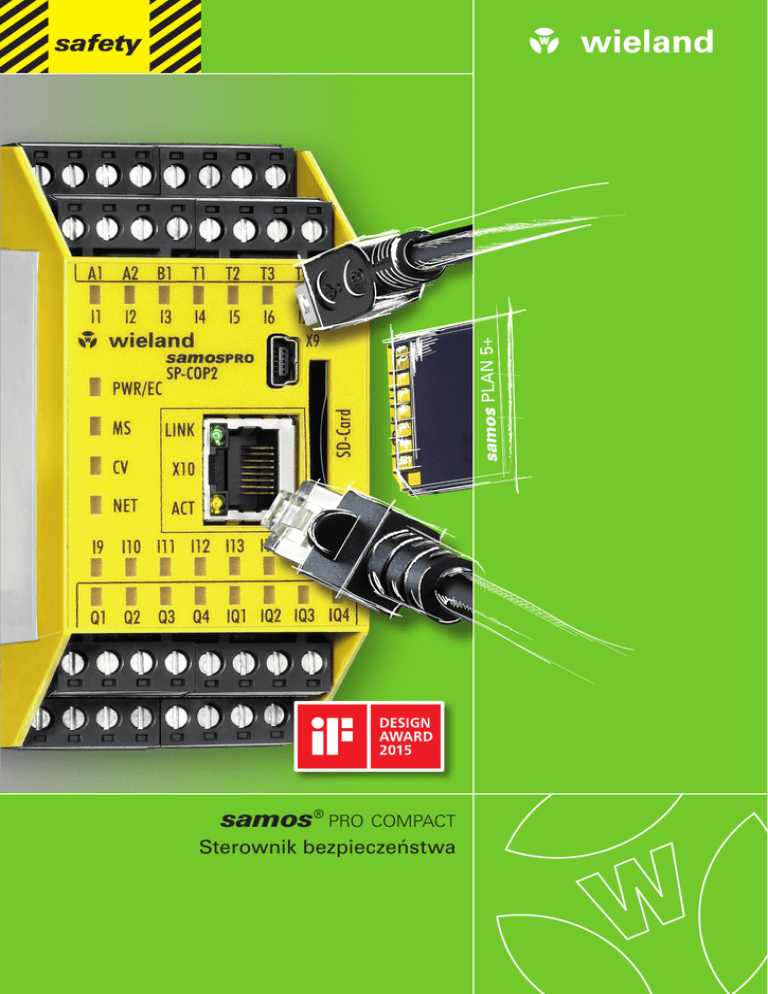 safety samos® pro compact Sterownik bezpieczeństwa samos® pro compact Wielkość od zawsze miała duże znaczenie.... W szafie sterującej we wszystkich gałęziach przemysłu aż do dzisiaj. KIEDYŚ 2 DZISIAJ samos® pro compact samos® pro compact Kontrola bezpieczeństwa nowej generacji Od dzisiaj i w przyszłości! Ilustracja Oryginalne wymiary 45 mm JUTRO samos® pro compact innowacyjny-kompaktowy-bezpieczny: Narzędzie samos®PLAN5+ stworzone z myślą o samos® pro compact do planowania projektowego proponuje użytkownikom całkowite wsparcie w ciągu całego cyklu życiowego maszyny. • Obszerna biblioteka niezawodnych, certyfikowanych bloków funkcyjnych • Konfigurowalna dokumentacja projektowa za dotknięciem przycisku • Zintegrowana symulacja i analiza logiczna funkcji bezpieczeństwa • Wygodna integracja w środowisku sieciowym np. Ethernet • Diagnoza i zdalna obsługa dla większej przejrzystości 3 samos® pro compact Uniwersalne i przyszłościowe Moc w małym rozmiarze 45 mm Szerokość obudowy 16 bezpiecznych wejść, 4 wyjścia i 4 przełączalne bezpieczne wejścia/wyjścia, całkowita szerokość modułu 45 mm rozwiązują wiele zadań z zakresu bezpieczeństwa – kontrola bezpieczeństwa nowej generacji do zastosowania w dziedzinie automatyki dziś i w przyszłości. W sieci Protokoły przemysłowej sieci Ethernet dostępne są już od samego początku, a ilość bramek sieciowych może być dobierana dowolnie w zależności od potrzeb i okoliczności – zintegrowane połączenie w najbardziej zróżnicowanej sieci przemysłowej stanowi zdecydowany atrybut systemu. Modułowa rozbudowa W celu wykorzystania wszechstronności aplikacji istnieje możliwość poszerzenia systemu o dodatkowe moduły do 116 bezpiecznych wejść i 56 bezpiecznych wyjść – idealne warunki do zastosowania w elastycznej, bezpiecznej automatyce nawet w przypadku większych maszyn oraz systemów. 4 samos® pro compact Certyfikowana wiedza Wszechstronna biblioteka certyfikowanych, wypróbowanych i przetestowanych bloków funkcyjnych ułatwia uruchomienie wszystkich funkcji bezpieczeństwa – ponad 40 różnych funkcjonalności dostępnych w każdej chwili bez konieczności dodatkowego programowania. Ogólnodostępny Zdalna obsługa przebiega w łatwy sposób wewnątrz systemu i nie wymaga nakładu dodatkowej pracy, co jest typowe w przypadku innych systemów – ze zintegrowaną diagnozą online oraz dziennikiem błędów systemu jakiekolwiek problemy w ogólnej obsłudze zostają szybko zlokalizowane dzięki czemu konieczność wykonywania kosztownych połączeń nie ma miejsca. Indywidualne dopasowanie Nawet czujniki i bloki funkcyjne dopasowane indywidualnie do potrzeb użytkownika mogą zostać zdefiniowane i zarządzane za pomocą biblioteki – żaden z systemów nie ma w swojej ofercie tak dalece sprecyzowanej wielofunkcyjności. 5 samos® pro compact Komunikatywny i pełen mocy Zintegrowany interfejs Zintegrowane USB oraz interfejs sieci Ethernet umożliwiają dopasowany do potrzeb Klienta dostęp do systemu – oznacza to większą przejrzystość zarówno w przypadku planowania projektowego, jak i obsługi. Stworzony do zastosowania w najsurowszych warunkach Niezwykle szeroki zakres temperatury pracy od - 25 °C do +65 °C zapewnia bezpieczeństwo wszystkich aplikacji – zastosowanie nawet przy ekstremalnych warunkach roboczych po raz pierwszy stało się możliwe. Wysoka moc przełączania MOC PRZEŁĄCZANIA 6 Wysoce odporne wyjścia PNP oraz obciążalność 4 A dla każdego pojedynczego wyjścia systemu – żadna inna kontrola bezpieczeństwa nie gwarantuje tego rodzaju wydajności. Tak wysoka wydajność jest alternatywą dla styczników i przekaźników. samos® pro compact Prosta komunikacja Wygodne w obsłudze narzędzie sprawia, że cała przemysłowa sieć Ethernet i wszystkie protokoły sieciowe są łatwe w użytkowaniu – nigdy wcześniej komunikacja przemysłowa nie była tak prosta. @ Stosowanie bez ograniczeń Wszystkie wejścia i wyjścia oraz aż do 300 bloków funkcyjnych może zostać zaimplementowanych do każdego projektu przy zachowaniu całkowitej dowolności – idealne kryterium dla rozwiązania prostych, a jednocześnie kompleksowych zadań z dziedziny bezpieczeństwa. NO * LIMIT * Bez ograniczeń Ochrona własnych projektów Dodatkowo narzędzie oferuje możliwość zaprojektowania indywidualnych bloków funkcyjnych oraz zintegrowaną ochronę ekspertyzy dla projektów – cechy na próżno poszukiwane w pozostałych systemach. 7 samos® pro compact Prosty i niezawodny Wymienna pamięć programu Wymienna karta SP-COP w formacie SD dysponuje łatwo dostępną pamięcią o pojemności 512 MB do programów użytkowych – nieskomplikowana obsługa projektów to oszczędność czasu w trakcie uruchamiania, powielania oraz serwisu, gdy jest on wymagany. Optyczny wyświetlacz funkcji za pośrednictwem LED Wszystkie wejścia i wyjścia systemu posiadają wizualizację stanu dzięki diodom LED dla każdego elementu sterownika – wizualizacja statusu operacyjnego maszyny nigdy wcześniej nie była ani szybsza, ani bardziej zrozumiała. Elastyczna technologia połączeń Wszystkie moduły systemu dostępne są w komplecie ze złączami śrubowymi lub typu push-in, co oznacza większą ilość możliwości do wykorzystania przez użytkownika i technologię połączeń. 8 samos® pro compact Doskonała symulacja procesu Funkcja symulacji w połączeniu ze zintegrowanym analizatorem logicznym umożliwia weryfikację zaprogramowanych funkcji bezpieczeństwa już na komputerze użytkownika – pomaga to w rozwiązywaniu problemów, sprzyja oszczędności cennego czasu w trakcie wdrażania oprogramowania do maszyny i podnosi ogólne bezpieczeństwo funkcjonalne. Zintegrowana dokumentacja Funkcja dokumentacji generuje dostosowany do potrzeb Klienta raport projektu jedynie za dotknięciem klawisza – najistotniejsza część dokumentacji maszyny pozostaje 