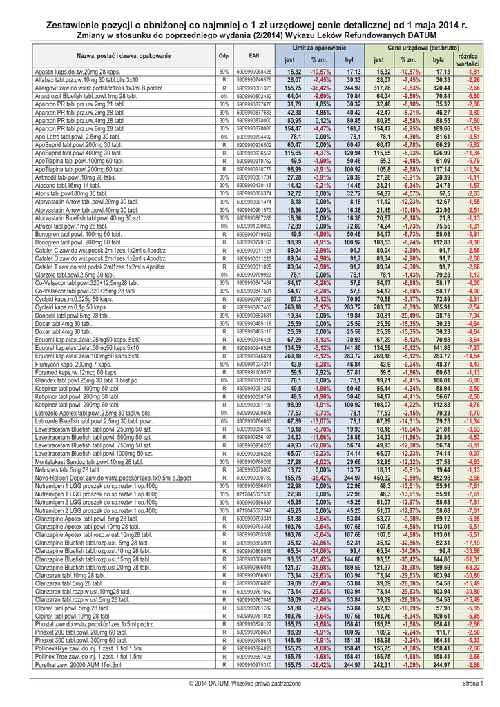 Zestawienie pozycji o obniżonej co najmniej o 1 zł urzędowej cenie detalicznej od 1 maja 2014 r. Zmiany w stosunku do poprzedniego wydania (2/2014) Wykazu Leków Refundowanych DATUM Limit za opakowanie Nazwa, postać i dawka, opakowanie Agastin kaps.doj.tw.20mg 28 kaps. Alfabax tabl.prz.uw.10mg 30 tabl.blis.3x10 Allergovit zaw.do wstrz.podskór1zes.1x3ml B podtrz. Anastrozol Bluefish tabl.powl.1mg 28 tabl. Aparxon PR tabl.prz.uw.2mg 21 tabl. Aparxon PR tabl.prz.uw.2mg 28 tabl. Aparxon PR tabl.prz.uw.4mg 28 tabl. Aparxon PR tabl.prz.uw.8mg 28 tabl. Apo-Letro tabl.powl. 2,5mg 30 tabl. ApoSuprid tabl.powl.200mg 30 tabl. ApoSuprid tabl.powl.400mg 30 tabl. ApoTiapina tabl.powl.100mg 60 tabl. ApoTiapina tabl.powl.200mg 60 tabl. Astmodil tabl.powl.10mg 28 tabs. Atacand tabl.16mg 14 tabl. Atoris tabl.powl.80mg 30 tabl. Atorvastatin Arrow tabl.powl.20mg 30 tabl. Atorvastatin Arrow tabl.powl.40mg 30 tabl. Atorvastatin Bluefish tabl.powl.40mg 30 szt. Atrozol tabl.powl.1mg 28 tabl. Bonogren tabl.powl. 100mg 60 tabl. Bonogren tabl.powl. 200mg 60 tabl. Catalet C zaw.do wst.podsk.2ml1zes.1x2ml s.4podtrz Catalet D zaw.do wst.podsk.2ml1zes.1x2ml s.4podtrz Catalet T zaw.do wst.podsk.2ml1zes.1x2ml s.4podtrz Clarzole tabl.powl.2,5mg 30 tabl. Co-Valsacor tabl.powl.320+12,5mg28 tabl. Co-Valsacor tabl.powl.320+25mg 28 tabl. Cyclaid kaps.m.0,025g 50 kaps. Cyclaid kaps.m.0,1g 50 kaps. Donectil tabl.powl.5mg 28 tabl. Doxar tabl.4mg 30 tabl. Doxar tabl.4mg 30 tabl. Equoral kap.elast.żelat.25mg50 kaps. 5x10 Equoral kap.elast.żelat.50mg50 kaps.5x10 Equoral kap.elast.żelat100mg50 kaps.5x10 Flumycon kaps. 200mg 7 kaps. Foramed kaps.tw.12mcg 60 kaps. Glandex tabl.powl.25mg 30 tabl. 3 blist.po Ketipinor tabl.powl. 100mg 60 tabl. Ketipinor tabl.powl. 200mg 30 tabl. Ketipinor tabl.powl. 200mg 60 tabl. Letrozole Apotex tabl.powl.2,5mg 30 tabl.w blis. Letrozole Bluefish tabl.powl.2,5mg 30 tabl. powl. Levetiracetam Bluefish tabl.powl. 250mg 50 szt. Levetiracetam Bluefish tabl.powl. 500mg 50 szt. Levetiracetam Bluefish tabl.powl. 750mg 50 szt. Levetiracetam Bluefish tabl.powl.1000mg 50 szt. Montelukast Sandoz tabl.powl.10mg 28 tabl. Nebispes tabl.5mg 28 tabl. Novo-Helisen Depot zaw.do wstrz.podskór1zes.1x9,5ml s.3podt Nutramigen 1 LGG proszek do sp.roztw.1 op.400g Nutramigen 1 LGG proszek do sp.roztw.1 op.400g Nutramigen 2 LGG proszek do sp.roztw.1 op.400g Nutramigen 2 LGG proszek do sp.roztw.1 op.400g Olanzapine Apotex tabl.powl. 5mg 28 tabl. Olanzapine Apotex tabl.powl.10mg 28 tabl. Olanzapine Apotex tabl.rozp.w ust.10mg28 tabl. Olanzapine Bluefish tabl.rozp.ust. 5mg 28 tabl. Olanzapine Bluefish tabl.rozp.ust.10mg 28 tabl. Olanzapine Bluefish tabl.rozp.ust.15mg 28 tabl. Olanzapine Bluefish tabl.rozp.ust.20mg 28 tabl. Olanzaran tabl.10mg 28 tabl. Olanzaran tabl.5mg 28 tabl. Olanzaran tabl.rozp.w ust.10mg28 tabl. Olanzaran tabl.rozp.w ust.5mg 28 tabl. Olpinat tabl.powl. 5mg 28 tabl. Olpinat tabl.powl.10mg 28 tabl. Phostal zaw.do wstrz.podskór1zes.1x5ml podtrz. Pinexet 200 tabl.powl. 200mg 60 tabl. Pinexet 300 tabl.powl. 300mg 60 tabl. Pollinex+Rye zaw. do inj. 1 zest. 1 fiol 1,5ml Pollinex Tree zaw. do inj. 1 zest. 1 fiol.1,5ml Purethal zaw. 20000 AUM 1fiol.3ml Odp. EAN 50% R R 0% 30% 30% 30% 30% 0% R R R R 30% 30% 30% 30% 30% 30% 0% R R R R R 0% 30% 30% R R 30% 30% R R R R 50% R 0% R R R 0% 0% R R R R 30% R R 30% 30% 30% 30% R R R R R R R R R R R R R R R R R R R 5909990068425 5909990746576 5909990001323 5909990802432 5909990877676 5909990877683 5909990878000 5909990878086 5909990794492 5909990936502 5909990936557 5909990910762 5909990910779 5909990881734 5909990430116 5909990885374 5909990961474 5909990961573 5909990887286 5909991090029 5909990719853 5909990720163 5909990011124 5909990011223 5909990011025 5909990799923 5909990847464 5909990847501 5909990787289 5909990787463 5909990683581 5909990485116 5909990485116 5909990946426 5909990946525 5909990946624 5909991034214 5909991109523 5909990812202 5909990081233 5909990058754 5909990081196 5909990908608 5909990794683 5909990956180 5909990956197 5909990956203 5909990956258 5909990780266 5909990673865 5909990000739 5909990586851 8712045027530 5909990586837 8712045027547 5909990793341 5909990793365 5909990793389 5909990865901 5909990865956 5909990866021 5909990866045 5909990766901 5909990766895 5909990767052 5909990767045 5909990781782 5909990781805 5909990820122 5909990788651 5909990788675 5909990684823 5909990687428 5909990975310 jest % zm. był 15,32 28,07 155,75 64,04 31,79 42,38 80,95 154,47 78,1 60,47 115,65 49,5 98,99 27,28 14,42 32,72 8,18 16,36 16,36 72,89 49,5 98,99 89,04 89,04 89,04 78,1 54,17 54,17 67,3 269,18 19,84 25,59 25,59 67,29 134,59 269,18 43,9 59,5 78,1 49,5 49,5 98,99 77,53 67,89 18,18 34,33 49,93 65,07 27,28 13,72 155,75 22,98 22,98 45,25 45,25 51,88 103,76 103,76 35,12 65,54 93,55 121,37 73,14 39,09 73,14 39,09 51,88 103,76 155,75 98,99 148,49 155,75 155,75 155,75 -10,57% -7,45% -36,42% -9,60% 4,85% 4,85% 0,12% -4,47% 0,00% 0,00% -4,37% -1,90% -1,91% -3,91% -0,21% 0,00% 0,00% 0,00% 0,00% 0,00% -1,90% -1,91% -2,90% -2,90% -2,90% 0,00% -6,28% -6,28% -5,12% -5,12% 0,00% 0,00% 0,00% -5,13% -5,12% -5,12% -6,28% 2,92% 0,00% -1,90% -1,90% -1,91% -0,73% -13,07% -8,78% -11,66% -12,00% -12,23% -8,02% 0,00% -36,42% 0,00% 0,00% 0,00% 0,00% -3,64% -3,64% -3,64% -32,86% -34,06% -35,42% -35,98% -29,63% -27,40% -29,63% -27,40% -3,64% -3,64% -1,68% -1,91% -1,91% -1,68% -1,68% -36,42% 17,13 30,33 244,97 70,84 30,32 40,42 80,85 161,7 78,1 60,47 120,94 50,46 100,92 28,39 14,45 32,72 8,18 16,36 16,36 72,89 50,46 100,92 91,7 91,7 91,7 78,1 57,8 57,8 70,93 283,72 19,84 25,59 25,59 70,93 141,86 283,72 46,84 57,81 78,1 50,46 50,46 100,92 78,1 78,1 19,93 38,86 56,74 74,14 29,66 13,72 244,97 22,98 22,98 45,25 45,25 53,84 107,68 107,68 52,31 99,4 144,86 189,59 103,94 53,84 103,94 53,84 53,84 107,68 158,41 100,92 151,38 158,41 158,41 244,97 © 2014 DATUM. Wszelkie prawa zastrzeżone Cena urzędowa (det.brutto) różnica jest % zm. była wartości 15,32 -10,57% 17,13 -1,81 28,
