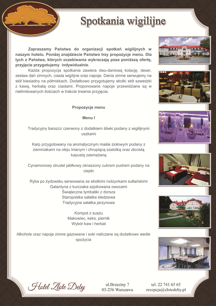 Zapraszamy Państwa do organizacji spotkań wigilijnych w naszym hotelu. Poniżej znajdziecie Państwo trzy propozycje menu. Dla tych z Państwa, których oczekiwania wykraczają poza poniższą ofertę, przyjęcie przygotujemy indywidualnie. Każda propozycja spotkania zawiera dwu-daniową kolację, deser, zestaw dań zimnych, ciasta wigilijne oraz napoje. Dania zimne serwujemy na stół biesiadny na półmiskach. Dodatkowo przygotujemy słodki stół szwedzki z kawą, herbatą oraz ciastami. Proponowane napoje przewidziane są w nielimitowanych ilościach w trakcie trwania przyjęcia. Propozycje menu Menu I Tradycyjny barszcz czerwony z dodatkiem śliwki podany z wigilijnymi uszkami Karp przygotowany na aromatycznym maśle ziołowym podany z ziemniakami na oleju lnianym i chrupiącą szalotką oraz złocistą kapustą zasmażaną Cynamonowy strudel jabłkowy okraszony cukrem pudrem podany na ciepło Ryba po żydowsku serwowana ze słodkimi rodzynkami sułtańskimi Galantyna z kurczaka szpikowana owocami Świąteczne tymbaliki z dorsza Staropolska sałatka śledziowa Tradycyjna sałatka jarzynowa Kompot z suszu Makowiec, keks, piernik Wybór kaw i herbat Alkohole oraz napoje zimne gazowane i soki naliczane są dodatkowo wedle spożycia Menu II Zupa z grzybów leśnych podawana z łazankami Chrupiące filety z dorsza bałtyckiego podawane na musie kaparowo cytrynowym z dodatkiem ziemniaków i grzybów w towarzystwie pieczonych warzyw o korzennym aromacie Domowy sernik w otoczeniu darów lasu Wigilijne pierogi z kapustą i grzybami Tatar z łososia norweskiego na postumencie z sałatki ziemniaczanej Rolada szpinakowa nadziewana łososiem Śledź pod pierzynką okraszony czerwonym pieprzem Ryba po grecku w otoczeniu cytryn Domowy pasztet z musem żurawinowym Sałatka z tuńczyka z dodatkiem pikli Makowiec, keks, piernik Wybór owoców Kompot z suszu Wybór napoi zimnych gazowanych i soków Wybór kaw i herbat Alkohole naliczane są dodatkowo wedle spożycia *W ramach organizacji przyjęcia zapewniamy indywidualną obsługę oraz świąteczny wystrój stołu. Dodatkowo proponujemy Open-bar I Wino białe / Wino czerwone / Grzaniec galicyjski / Piwo Żywiec / Piwo Królewskie Open-bar II Wino białe / Wino czerwone / Grzaniec galicyjski / Piwo Żywiec / Piwo Królewskie / Wódka Wyborowa / Wódka Gorzka Żołądkowa Open-bar III Wino białe / Wino czerwone / Grzaniec galicyjski / Piwo Żywiec / Piwo Królewskie / Wódka Wyborowa / Wódka Gorzka Żołądkowa / Whisky JW Red Label / Whisky Passport Open-bar IV Wino białe / Wino czerwone / Grzaniec galicyjski / Piwo Żywiec / Piwo Królewskie / Wódka Wyborowa / Wódka Gorzka Żołądkowa / Whisky JW Red Label / Whisky Passport / Kamikadze / Wściekły pies / Cuba Libre / Mojito / Whisky Sour / Tequila Sunrise Wybór dwóch zup i dwóch dań głównych w trakcie trwania spotkania Goście mają możliwość wyboru jednej spośród dwóch przygotowanych zup oraz jednego z dwóch przygotowanych dań głównych Dodatkowe danie gorące podane w trakcie trwania spotkania Starter (zimna przekąska serwowana) / Przystawka gorąca / Danie w kokilce / Danie talerzowe / Dania serwowane w bemarach Wybór mini deserów na stół szwedzki (panna cotta, tiramisu, mus czekoladowy z wiśniami, krem brulee) Zapytania ofertowe i rezerwacje W razie pytań lub chęci rezerwacji miejsc prosimy o kontakt; [email protected] Życzymy Państwu wesołych Świąt Bożego Narodzenia oraz szczęśliwego Nowego Roku!!! Menu wigilijne Zupy Wigilijny barszcz z uszkami Grzybowa z łazankami Kremowa zupa łososiowa ze szpinakowymi kluseczkami Danie główne Karp smażony na maśle z ziołami Dorsz w sosie kaparowo-cytrynowym Duszony karp po staropolsku z młodą cebulką oraz grzybami leśnymi Morszczuk w panierce migdałowej Przystawki gorące Pierogi z kapustą i grzybami Pierogi z soczewicą Mini krokiety z pieczarkami Przystawki zimne Tatar z łososia na ziemniaczanej sałatce Tatar ze śledzia w otoczeniu pikli Rolada szpinakowa z łososiem Tymbaliki z dorsza Śledzie pod pierzynką Ryba po żydowsku, na słodko z rodzynkami Ryba po grecku Domowy pasztet z żurawiną Deski mięs pieczonych z piklami Galantyna z kurczaka z owocami Tradycyjna sałatka jarzynowa Sałatka śledziowa Sałatka z tuńczyka Desery Patera ciast świątecznych (makowiec, keks, piernik) Kutia z miodem i orzechami