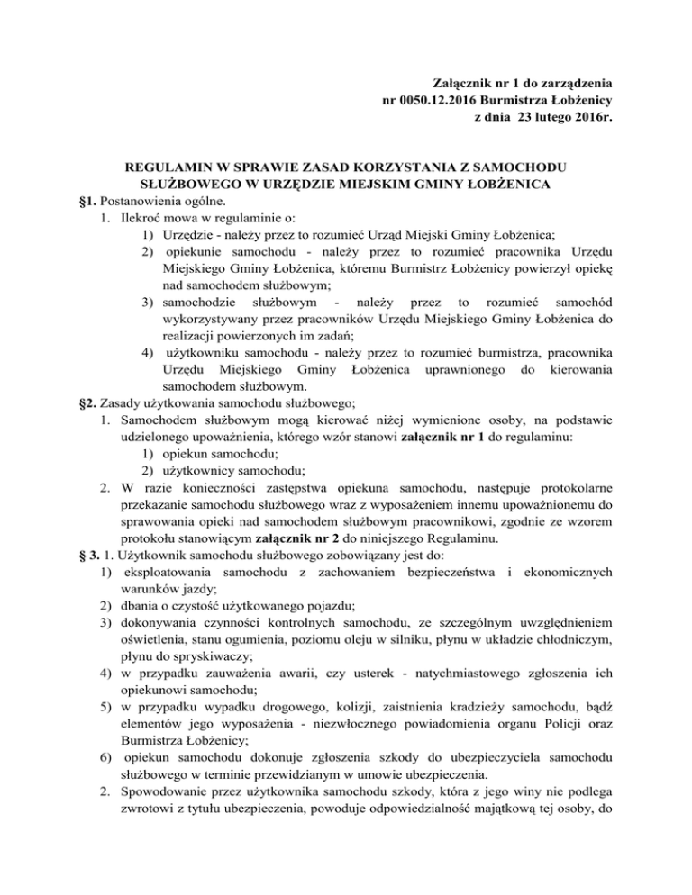 Załącznik nr 1 do zarządzenia nr 0050.12.2016 Burmistrza Łobżenicy z dnia 23 lutego 2016r. REGULAMIN W SPRAWIE ZASAD KORZYSTANIA Z SAMOCHODU SŁUŻBOWEGO W URZĘDZIE MIEJSKIM GMINY ŁOBŻENICA §1. Postanowienia ogólne. 1. Ilekroć mowa w regulaminie o: 1) Urzędzie - należy przez to rozumieć Urząd Miejski Gminy Łobżenica; 2) opiekunie samochodu - należy przez to rozumieć pracownika Urzędu Miejskiego Gminy Łobżenica, któremu Burmistrz Łobżenicy powierzył opiekę nad samochodem służbowym; 3) samochodzie służbowym - należy przez to rozumieć samochód wykorzystywany przez pracowników Urzędu Miejskiego Gminy Łobżenica do realizacji powierzonych im zadań; 4) użytkowniku samochodu - należy przez to rozumieć burmistrza, pracownika Urzędu Miejskiego Gminy Łobżenica uprawnionego do kierowania samochodem służbowym. §2. Zasady użytkowania samochodu służbowego; 1. Samochodem służbowym mogą kierować niżej wymienione osoby, na podstawie udzielonego upoważnienia, którego wzór stanowi załącznik nr 1 do regulaminu: 1) opiekun samochodu; 2) użytkownicy samochodu; 2. W razie konieczności zastępstwa opiekuna samochodu, następuje protokolarne przekazanie samochodu służbowego wraz z wyposażeniem innemu upoważnionemu do sprawowania opieki nad samochodem służbowym pracownikowi, zgodnie ze wzorem protokołu stanowiącym załącznik nr 2 do niniejszego Regulaminu. § 3. 1. Użytkownik samochodu służbowego zobowiązany jest do: 1) eksploatowania samochodu z zachowaniem bezpieczeństwa i ekonomicznych warunków jazdy; 2) dbania o czystość użytkowanego pojazdu; 3) dokonywania czynności kontrolnych samochodu, ze szczególnym uwzględnieniem oświetlenia, stanu ogumienia, poziomu oleju w silniku, płynu w układzie chłodniczym, płynu do spryskiwaczy; 4) w przypadku zauważenia awarii, czy usterek - natychmiastowego zgłoszenia ich opiekunowi samochodu; 5) w przypadku wypadku drogowego, kolizji, zaistnienia kradzieży samochodu, bądź elementów jego wyposażenia - niezwłocznego powiadomienia organu Policji oraz Burmistrza Łobżenicy; 6) opiekun samochodu dokonuje zgłoszenia szkody do ubezpieczyciela samochodu służbowego w terminie przewidzianym w umowie ubezpieczenia. 2. Spowodowanie przez użytkownika samochodu szkody, która z jego winy nie podlega zwrotowi z tytułu ubezpieczenia, powoduje odpowiedzialność majątkową tej osoby, do pełnej kwoty wysokości spowodowanej szkody. Osoby kierujące samochodem służbowym podpisują deklarację odpowiedzialności materialnej zgodnie z załącznikiem nr 3 3. Koszty wynikające z naruszenia przepisów o ruchu drogowym, a także nieuiszczenia opłaty z tytułu postoju w strefie płatnego parkowania pokrywa użytkownik samochodu. 4. Użytkownikowi samochodu zabrania się udostępniania pojazdu osobom nieupoważnionym. 5. Po godzinach pracy lub po wykonaniu zadań związanych z działalnością Urzędu Miejskiego Gminy Łobżenica, użytkownik samochodu jest zobowiązany do parkowania pojazdu służbowego w następujących miejscach: 1) w garażach lub miejscach parkingowych stanowiących własność Urzędu Miejskiego Gminy Łobżenica; 2) miejscach garażowych lub zamkniętej posesji będącej w dyspozycji użytkownika samochodu, 3) na parkingach strzeżonych. 6. Opiekun samochodu dokonuje zakupu paliwa, a także części zamiennych, materiałów eksploatacyjnych oraz usług niezbędnych w tym mycie i czyszczenie samochodu służbowego. 7. W przypadku dłuższych wyjazdów zakupów wymienionych w ustępie 6 dokonuje użytkownik samochodu. 8. Zakupione paliwo zostaje zaewidencjonowane w karcie drogowej. 9. Korzystanie z samochodu służbowego po godzinach pracy, w święta i dni wolne od pracy może odbywać się w przypadkach wykonywania obowiązków służbowych wynikających z zakresu kompetencji i wynikających ze zdarzeń losowych każdorazowo akceptowanych przez Burmistrza Łobżenicy lub osobę przez niego upoważnioną. § 4. 1. Podstawą do korzystania z przejazdu samochodem służbowym stanowi pisemne zgłoszenie zapotrzebowania, którego wzór stanowi załącznik nr 4 do regulaminu. 2. Zapotrzebowanie powinno być złożone u pracownika Sekretariatu, po uzgodnieniu wyjazdu z Burmistrzem Łobżenicy, Zastępcą Burmistrza Łobżenicy, Kierownikiem Referatu lub innym uprawnionym pracownikiem. 3. W przypadku wyjazdu planowanego na inny dzień, pracownik Sekretariatu wpisuje zapotrzebowanie do grafiku miesięcznego stanowiącego Załącznik nr 5 do niniejszego regulaminu. 4. Karta drogowa, dokumenty samochodu, ubezpieczenie oraz kluczyki wydawane są użytkownikowi samochodu przez pracownika Sekretariatu przed wyjazdem. 5. Kontrolę nad zasadnością wyjazdów samochodem służbowym sprawuje Burmistrz Łobżenicy, Zastępca Burmistrza Łobżenicy, Kierownik Referatu lub inny upoważniony pracownik. § 5. 1. Ewidencjonowanie przejazdów samochodu służbowego dokonywane jest według poniższych zasad: 1) prowadzone jest przez użytkownika samochodu na karcie drogowej, której wzór stanowi załącznik nr 6 do regulaminu, 2) w kartach drogowych wpisuje się daty oraz godziny wyjazdu i powrotu, daty i ilości kupowanego paliwa, liczbę przejechanych kilometrów w ciągu dnia z podaniem trasy przejazdu; 4) po zdaniu przez użytkownika samochodu karty drogowej, pracownik Sekretariatu na bieżąco wpisuje stan licznika oraz liczbę przejechanych kilometrów w rejestrze wydanych kart drogowych, który stanowi załącznik nr 7 do regulaminu. 2. Karta drogowa jest wystawiana odrębnie dla każdego użytkownika samochodu na każdy dzień pracy pojazdu. 3.W wyjątkowych sytuacjach (np. kilkudniowej delegacji), karta drogowa wypełniana jest na czas trwania całego wyjazdu. 4. Do wyjazdów poza teren gminy na czas dłuższy niż 8 godzin dodatkowo wymagana jest delegacja służbowa. § 6. 1. Rozliczenie przebiegu samochodu służbowego oraz zużycia paliwa dokonywane jest przez pracownika Sekretariatu 