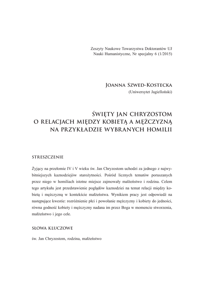 Zeszyty Naukowe Towarzystwa Doktorantów UJ Nauki Humanistyczne, Nr specjalny 6 (1/2015) Joanna Szwed-Kostecka (Uniwersytet Jagielloński) ŚWIĘTY JAN CHRYZOSTOM O RELACJACH MIĘDZY KOBIETĄ A MĘŻCZYZNĄ NA PRZYKŁADZIE WYBR ANYCH HOMILII STRESZCZENIE Żyjący na przełomie IV i V wieku św. Jan Chryzostom uchodzi za jednego z najwybitniejszych kaznodziejów starożytności. Pośród licznych tematów poruszanych przez niego w homiliach istotne miejsce zajmowały małżeństwo i rodzina. Celem tego artykułu jest przedstawienie poglądów kaznodziei na temat relacji między kobietą i mężczyzną w kontekście małżeństwa. Wynikiem pracy jest odpowiedź na następujące kwestie: rozróżnienie płci i powołanie mężczyzny i kobiety do jedności, równa godność kobiety i mężczyzny nadana im przez Boga w momencie stworzenia, małżeństwo i jego cele. SŁOWA KLUCZOWE św. Jan Chryzostom, rodzina, małżeństwo 10 6 Joa nn a Sz w e d -K o s t e c k a INFOR M ACJE O AUTORCE Joanna Szwed-Kostecka Instytut Filologii Klasycznej Wydział Filologiczny Uniwersytet Jagielloński e-mail: [email protected] Żyjący na przełomie IV i V wieku, pochodzący z Antiochii Jan, biskup Konstantynopola, uważany jest za jednego z najwybitniejszych kaznodziejów starożytnego Kościoła. Swoje umiejętności wyniósł ze szkoły słynnego pogańskiego retora Libaniusza, który w Janie widział swojego następcę. Zdolny uczeń postanowił jednak poświęcić swoje życie Bogu, najpierw jako pustelnik i asceta, później jako kapłan w Antiochii, a od 397 roku jako biskup Konstantynopola1. Małżeństwo i rodzina stanowiły ważne tematy w rozważaniach staro- żytnych filozofów, a później w nauczaniu Ojców Kościoła2. Wśród nich wyróżnić można dwa stanowiska. Jedni, jak Demokryt, Epikur3 czy Teofrast4, uważali małżeństwo za instytucję, która niesie ze sobą wiele obciążeń. Życie we wstrzemięźliwości było największą cnotą dla stoików. Podobnie uważali neopitagorejczycy oraz neoplatonicy, którzy 1 Por. PG 51, 301. Na temat życia i twórczości św. Jana Chryzostoma powstało wiele opracowań, między innymi: J. N. D. Kelly, Złote usta. Jan Chryzostom – asceta, kaznodzieja, biskup, tłum. K. Krawczyk, przekład przejrzała i poprawiła M. Cielecka, Bydgoszcz 2012; M. Simonetti, La letteratura cristiana antica greca e latina, Milano 1969, s. 305–315. 2 Por. P. Nehring, Dlaczego dziewictwo jest lepsze niż małżeństwo, Toruń 2005. 3 O czym informuje nas Klemens Aleksandryjski, Stromata, II, 138, 1. 4 Por. Hieronim, Adversus Iovinianum, I, 47, 276. Ś w i ę t y J a n C h r y z o s t om o r e l ac j ac h . . . uważali, że ciało należy poddawać surowej ascezie. Pozytywnie małżeństwo oceniali między innymi Platon5 czy też Plutarch. Wraz z szerzeniem się religii chrześcijańskiej biskupi dokładali starań, aby uregulować kwestię zawierania małżeństwa, stąd też homilie, traktaty teologiczne i filozoficzne poruszające ten temat, a także przepisy i regulacje w kanonach synodów i soborów powszechnych6. Małżeństwo oraz dziewictwo znajdowały się w kręgu zainteresowań autorów chrześcijańskich. Klemens Aleksandryjski nie tylko uznał wartość małżeństwa, którego podstawowy cel widział w prokreacji, ale jako jedyny autor starożytności chrześcijańskiej życie w małżeństwie uznawał za doskonalsze od dziewiczego7. Tertulian był wielkim zwolennikiem dziewictwa8, podobnie jego uczeń Cyprian9. Dziewictwo cenił wyżej niż małżeństwo także Orygenes10, zalety życia w czystości wysławiał w swoim dialogu zatytułowanym Uczta Metody z Olimpu, choć wychwala w nim także życie małżeńskie. Św. Jan Chryzostom uważał dziewictwo za największą cnotę, kwestii tej poświęcił utwór De virginitate. Uznawał on jednak małżeństwo i wielokrotnie wypowiadał się na ten temat w swoich homiliach głoszonych wiernym11. 5 Platon, Prawa, IV, 721C. 6 Por. Kanony Wschodniego Kościoła starożytnego dotyczące małżeństwa i rodziny, zebrał i tłum. H. Papricki, „Vox Patrum” 5 (1985), s. 321–344. 7 Klemens Aleksandryjski, Paedagogus, II, 94, 1; idem, Stromata, II, 137, 3. Por. A. Baron, Świętość a ideały człowieka, Kraków 2013, s. 259–260. 8 Por. Tertulian, Ad uxorem; dem, Adversus Marcionem; idem, De virginibus velandis. 9 Por. Cyprian, De habitu virginum. 10 Zob. H. Crouzel, Virginité et mariage selon Origène, Paris 1963. 11 Zob. także: A. Bober, Rodzina kościołem domowym według św. Jana Chryzostoma, „Vox Patrum” 5 (1985), s. 193–200; M. Falanga, Il pensiero pedagogico di Giovanni 10 7 10 8 Joa nn a Sz w e d -K o s t e c k a Wśród opracowań tego zagadnienia, do których udało mi się dotrzeć, należy wymienić tom czasopisma „Vox Patrum” poświęcony kwestii rodziny i małżeństwa12. Znajdziemy tam między innymi artykuł ks. Piotra Szczura13, w którym autor koncentruje się na przedstawieniu celów małżeństwa w nauczaniu św. Jana Chryzostom, czy też artykuł ks. Dariusza Zagórskiego poświęcony zagadnieniu nierozerwalności małżeństw14. W antologii tekstów św. Jana Chryzostoma O małżeństwie, wychowaniu dzieci i ascezie znajdziemy obszerny wstęp do przekładu 20. homilii na List do Efezjan15. Nie stanowi on jednak systematycznego opracowania zagadnienia małżeństwa, a jedynie szczegóCrisostomo, Bari 1984; S. Longosz, Rodzina wczesnochrześcijańska kościołem domowym wg Jana Chryzostoma, „Roczniki Teologiczne” 51 (2004), s. 27–56; A. Monaci Castagno, Paideia classica ed esercizio pastorale nel IV secolo. Il concetto di „synesis” nell’opera di Giovanni Crisostomo, “Rivista di Storia e Letteratura Religiosa” 26 (1990), s. 429–459; C. P. Roth, St. John Chrysostom on Marriage and Family Life, Crestwood NY 1986; C. Scaglione, Ideale coniugale e familiare in Giovanni Crisostomo, [w:] Etica sessuale e matrimoniale nel cristanesimo delle origini, ed. R. Cantalam