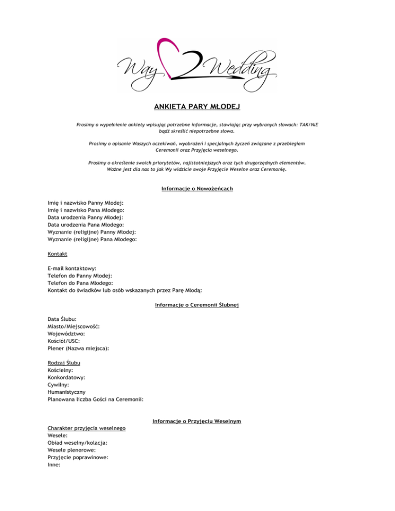 ANKIETA PARY MŁODEJ Prosimy o wypełnienie ankiety wpisując potrzebne informacje, stawiając przy wybranych słowach: TAK/NIE bądź skreślić niepotrzebne słowa. Prosimy o opisanie Waszych oczekiwań, wyobrażeń i specjalnych życzeń związane z przebiegiem Ceremonii oraz Przyjęcia weselnego. Prosimy o określenie swoich priorytetów, najistotniejszych oraz tych drugorzędnych elementów. Ważne jest dla nas to jak Wy widzicie swoje Przyjęcie Weselne oraz Ceremonię. Informacje o Nowożeńcach Imię i nazwisko Panny Młodej: Imię i nazwisko Pana Młodego: Data urodzenia Panny Młodej: Data urodzenia Pana Młodego: Wyznanie (religijne) Panny Młodej: Wyznanie (religijne) Pana Młodego: Kontakt E-mail kontaktowy: Telefon do Panny Młodej: Telefon do Pana Młodego: Kontakt do świadków lub osób wskazanych przez Parę Młodą: Informacje o Ceremonii Ślubnej Data Ślubu: Miasto/Miejscowość: Województwo: Kościół/USC: Plener (Nazwa miejsca): Rodzaj Ślubu Kościelny: Konkordatowy: Cywilny: Humanistyczny Planowana liczba Gości na Ceremonii: Informacje o Przyjęciu Weselnym Charakter przyjęcia weselnego Wesele: Obiad weselny/kolacja: Wesele plenerowe: Przyjęcie poprawinowe: Inne: Miejsce wesela ( nazwa obiektu, jeśli jest już wybrane): Miasto/Miejscowość: Województwo: Styl obiektu weselnego (jeśli nie został jeszcze wybrany): Dworek: Pałac: Sala hotelowa: Restauracja: Folwark: Karczma: Elegancki obiekt weselny: Dom weselny: Namiot weselny: Inne: Planowana liczba Gości weselnych: Motyw przewodni ślubu i wesela: Kolor przewodni ślubu i wesela: Zakres Usług oferowanych przez WAY 2 WEDDING Prosimy o zaznaczenie TAK, jeśli potrzebujecie pomocy w danym temacie lub MAMY, jeśli już dany temat jest wykonany Miejsce przyjęcia weselnego Typowanie lokalizacji czyli przedstawienie oferty 3 obiektów : ( jeśli miejsce nie zostało jeszcze wybrane) Oprawa Florystyczna Bukiet dla Panny Młodej: Bukiet dla Świadkowej/Druhny: Butonierka dla Pana Młodego: Butonierka dla Świadka/ Drużby: Wianek dla Panny Młodej: Wianuszki/Bukieciki dla małych Druhenek: Płatki róży (świeże): Bukiety dla Rodziców ( tradycyjna forma podziękowania): Inne: Dekoracja miejsca przyjęcia (sala): Dekoracja miejsca ceremonii ( kościół/ USC/ plener) : Dekoracja auta : Inne: Wizerunek Panny Młodej Makijaż: Fryzura: Manicure: Pedicure: Pobyt w SPA: Usługa rekomendacji sprawdzonego salonu sukni ślubnych: Rodzaj/kolor biżuterii/dodatków Panny Młodej (srebro,złoto): Inne: Wizerunek Pana Młodego Fryzura: Manicure: Pedicure: Pobyt w SPA: Inne: Usługa rekomendacji sprawdzonego salonu z garniturami: Wizerunek Świadkowej/Druhny/Mamy/Siostry Makijaż: Fryzura: Inne: Zaproszenia ślubne/Papeteria ślubna: Zaproszenia: Winietki: Podziękowania dla Gości: Tablica z rozmieszczeniem Gości na sali (Table Plan) Karty menu: Księga Gości: Pudełko na koperty: Inne: Oprawa muzyczna Ceremonii: Oprawa muzyczna w kościele/USC/plener: Tercet smyczkowy: Duet: Inne: Oprawa muzyczna Przyjęcia Weselnego: Oprawa muzyczna przy obiedzie: (opcja w przypadku wybrania przez Parę Młodą obiadu/kolacji weselnej) Zespół Muzyczny: DJ: Inne: Fotografia ślubna Fotoreportaż: Sesja plenerowa: Sesja narzeczeńska: Videofilmowanie Reportaż video: Sesja video plenerowa: Sesja video narzeczeńska: Transport Młodej Pary: Auto Retro: Auto Premium: Limuzyna: Transport Gości weselnych Autobus Miejski: Autokar rejsowy: Bus: Limuzyny: Inne: Pojazd dostępny w godzinach: Wstępna planowa trasa przejazdu: Planowana ilość osób do transportu: Noclegi dla Gości Ilość osób: Ilość dób hotelowych: Atrakcje dodatkowe na Przyjęciu Weselnym Fotobudka: Program artystyczny: Pokazy barmańskie: Pokaz Fajerwerków: Balony szczęścia led: Balony szczęścia z helem: Pokazy tańca: Pokaz iluzjonistyczny: Koncert smyczkowy: Słodki stół: Wiejski stół: Tort weselny (inny niż w ofercie obiektu): Inne: Usługi dodatkowe Koordynacja dnia ślubu: Opieka/Animator dla dzieci podczas Przyjęcia Weselnego: Kurs Tańca: Tuby strzelające konfetti: Koszyk SOS (koszyk z najpotrzebniejszymi artykułami dla gości stojący w łazienkach): Organizacja obrączek: Pudełko na obrączki: Świeczki na tort/ statuetki na tort: Inne: W przypadku posiadania przez Was przydatnych dla nas informacji na fotografiach, wycinkach z magazynów, stronach www oraz jakichkolwiek materiałów kojarzącym się Wam z Waszą uroczystością weselną lub inspirujących Was prosimy zabierzcie je ze sobą na nasze pierwsze spotkanie. O firmie Way 2 Wedding dowiedzieliśmy się z : Dziękujemy za wypełnienie ankiety. Do zobaczenia na spotkaniu. Małgorzata Tomaszewska Marta Pasternacka Konsultant Ślubny/ Event Manager Tel. 601 864 259 Konsultant Ślubny/ Event Manager Tel. 537 752 502 Organizator Ślubów, Wesel i imprez okolicznościowych