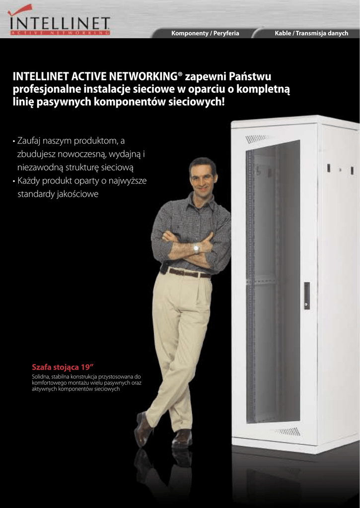 Komponenty / Peryferia Kable / Transmisja danych INTELLINET ACTIVE NETWORKING® zapewni Państwu profesjonalne instalacje sieciowe w oparciu o kompletną linię pasywnych komponentów sieciowych! • Zaufaj naszym produktom, a zbudujesz nowoczesną, wydajną i niezawodną strukturę sieciową • Każdy produkt oparty o najwyższe standardy jakościowe Szafa stojąca 19” Solidna, stabilna konstrukcja przystosowana do komfortowego montażu wielu pasywnych oraz aktywnych komponentów sieciowych www.akcesoriakomputerowe.pl Akcesoria biurowe Sieci aktywne Sieci pasywne 98 Akcesoria do szaf 103 Gniazdka natynkowe / podtynkowe 102 Kable na szpulach Szafa wisząca 19” Konstrukcyjnie przystosowana do instalacji na ścianie, a także dzięki tylnej ścianie istnieje możliwość postawienia jej na podłodze 105 Narzędzia i zestawy narzędziowe 101 Patch kable 109 Patch kable światłowodowe 100 Patch panele 108 Testery kabli 96 Szafy stojące 19” 99 Szafy wiszące 10” 97 Szafy wiszące 19” 104 Wtyki Patch panel Cat6 Ekranowany patch panel najwyższej jakości Zestaw narzędziowy instalatora sieci Wszystko, czego potrzebuje każdy instalator sieci, zapakowane w stylowej, solidnej, metalowej walizce Patch kabel światłowodowy Szeroki wybór złącz, a wszystko to w doskonałej cenie oraz jakości Komponenty / Peryferia Kable / Transmisja danych Szafy stojące 19” Konstrukcja przystosowana do montażu patch paneli, aktywnych komponentów sieciowych, serwerów, central telefonicznych, itp. Produkowane w rozmiarach 24 - 42U Głębokość: 600 mm, 800 mm oraz 900 mm Szerokość: 600 mm lub 800 mm Standardowy kolor: Ral 7035 (biały) Stabilna konstrukcja nośna szafy, całkowicie rozkręcalna Przód szafy: drzwi szklane z klamką, zamek typu „klik” Tył szafy: drzwi metalowe na klucz Boki szafy: metalowe osłony zamykane na klucz Dach i podłoga szafy: możliwość wyprowadzenia kabli oraz instalacja paneli wentylacyjnych Możliwość zainstalowania nawet do 9 wentylatorów w suficie Przedni profil 19” ocynkowany Zestaw uziemiający Stopki poziomujące Wymiary szaf stojących 19” 001102 001103 001105 001104 001094 31,00 Przełącznik zarządzalny, modularny str. 76 Zestaw narzędziowy instalatora sieci str. 107 96 42U 600/600 42U 600/800 42U 800/800 42U 600/900 Profil B 19" 42U $ $ $ $ $ 001100 24U 600/600 001101 24U 600/800 001099 Profil B 19" 24U $ 31,0031,00 001110 001111 001114 001115 $ Podstawa do szafy - cokół 100 mm 600/600 Podstawa do szafy - cokół 100 mm 600/800 Podstawa do szafy - cokół 100 mm 600/900 Podstawa do szafy - cokół 100 mm 800/800 www.akcesoriakomputerowe.pl Akcesoria biurowe Sieci aktywne Sieci pasywne Szafy wiszące 19” Konstrukcyjnie przystosowane do instalacji na ścianę Dzięki tylnej ścianie istnieje możliwość postawienia szafki na ziemi, bez dostępu do elementów aktywnych przez osoby niepowołane Pojemność szafki umożliwia montaż w nich aktywnych elementów sieci LAN, pasywnych elementów typu patch panele, centralek telefonicznych, czy małych serwerów Spawana konstrukcja szafy Standardowy kolor: Ral 7035 (biały) Drzwi zamykane na klucz Wprowadzenie kabli od góry lub dołu szafy Przepusty kablowe osłonięte zaślepkami Regulowana głębokość profili 19” Profile 19” ocynkowane W szafie dzielonej tylna część zamykana na klucz (100 mm) Wymiary szaf wiszących 19” 001093 6U 400 mm 31,00 001106 9U 450 mm 001107 12U 450 mm 001108 15U 450 mm Wymiary szaf wiszących 19” dzielonych 001120 6U 600 mm 001121 9U 600 mm 001122 12U 600 mm Patch kabel Cat5e UTP str. 101 Tester okablowania RJ-45 str. 108 97 Komponenty / Peryferia Kable / Transmisja danych Akcesoria do szaf 19” A. 001131 Panel wentylacyjny 1U, 2 wentylatory z termostatem 001080 Panel wentylacyjny 1U, 3 wentylatory z termostatem B. 001113 Panel wentylacyjny sufitowy, 3 wentylatory z termostatem 001112 Panel wentylacyjny sufitowy, 2 wentylatory z termostatem C. 001116 Organizer kablowy 1U 001128 Organizer kablowy 2U D. 001117 Panel zaślepiający 1U 001118 Panel zaślepiający 2U 001129 Panel zaślepiający 3U E. 014620 F. A B C Panel zasilający, 8 gniazd z włącznikiem, 1U 014613 Panel zasilający, 9 gniazd, 1U G. 001071 Komplet elementów montażowych, 4 szt. 001094 Profil B 42U 19” $ 001099 Profil B 24U 19” $ 001110 Podstawa do szafy - cokół 100 mm 600/600 H. 001111 Podstawa do szafy - cokół 100 mm 600/800 001114 Podstawa do szafy - cokół 100 mm 600/900 001115 Podstawa do szafy - cokół 100 mm 800/800 001130 Przepust kablowy szczotkowy D E G H F 98 www.akcesoriakomputerowe.pl Akcesoria biurowe Sieci aktywne 001095 Półka 2U 220 mm $ 001096 Półka 2U 350 mm $ 001123 Półka 2U 450 mm $ 001098 Półka 1U 480 mm, 4 uchwyty, do 80 kg B. 001097 Półka 1U 660 mm, 4 uchwyty, do 80 kg C. 001124 Półka pod klawiaturę, składana, 1U A. Sieci pasywne A B C Szafy wiszące 10” oraz akcesoria D. 001083 001082 001119 001125 G. 001126 H. 513050 E. F. 6U 6U, metalowe drzwi Półka 1U 200 mm $ Organizer kablowy 1U $ Panel zaślepiający 1U $ Patch panel 12-portowy, 1U, Cat5e D E F Przełącznik 10/100 Smart, desktop str. 81 G Router do modemów DSL/kablowych str. 86 H 99 Komponenty / Peryferia Patch panele nieekranowane Patch panel 19”, Cat5e 513548 16 x RJ-45, 1U, nieekranowany Ä 27,00 513555 24 x RJ-45, 1U, nieekranowany Ä 35,00 513562 32 x RJ-45, 2U, nieekranowany Ä 59,00 513579 48 x RJ-45, 2U, nieekranowany Patch panel 19”, Cat6 519526 16 x RJ-45, 1U, nieekranowany Ä 59,00 520959 24 x RJ-45, 1U, nieekranowany Ä 79,00 Ä 99,00 Patch panele ekranowane Patch panel 19”, Cat5e 503747 16 x RJ-45, 1U, ekranowany 503754 24 x RJ-45, 1U, ekranowany 503761 32 x RJ-45, 2U, ekranowany Patch kabel Cat5e UTP str. 101 Patch panel 19”, Cat6 560276 24 x RJ-45, 1U, ekranowany $ 56,00 Serwer pamięci masowej str. 87 100 $ 31,00 Kable / Transmisja danych www.akcesoriakomputerowe.pl Akcesoria biurowe Sieci aktywne Sieci pasywne Patch kable Cat6 UTP 0,5 m / 1 m / 1,5 