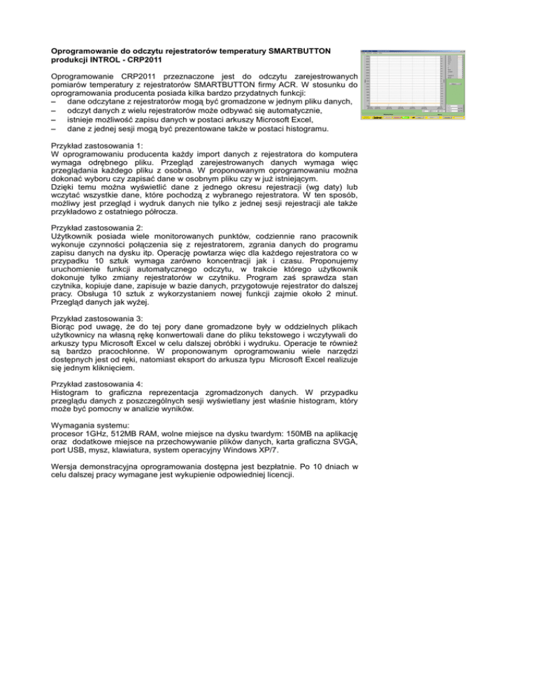 Oprogramowanie do odczytu rejestratorów temperatury SMARTBUTTON produkcji INTROL - CRP2011 Oprogramowanie CRP2011 przeznaczone jest do odczytu zarejestrowanych pomiarów temperatury z rejestratorów SMARTBUTTON firmy ACR. W stosunku do oprogramowania producenta posiada kilka bardzo przydatnych funkcji: – dane odczytane z rejestratorów mogą być gromadzone w jednym pliku danych, – odczyt danych z wielu rejestratorów może odbywać się automatycznie, – istnieje możliwość zapisu danych w postaci arkuszy Microsoft Excel, – dane z jednej sesji mogą być prezentowane także w postaci histogramu. Przykład zastosowania 1: W oprogramowaniu producenta każdy import danych z rejestratora do komputera wymaga odrębnego pliku. Przegląd zarejestrowanych danych wymaga więc przeglądania każdego pliku z osobna. W proponowanym oprogramowaniu można dokonać wyboru czy zapisać dane w osobnym pliku czy w już istniejącym. Dzięki temu można wyświetlić dane z jednego okresu rejestracji (wg daty) lub wczytać wszystkie dane, które pochodzą z wybranego rejestratora. W ten sposób, możliwy jest przegląd i wydruk danych nie tylko z jednej sesji rejestracji ale także przykładowo z ostatniego półrocza. Przykład zastosowania 2: Użytkownik posiada wiele monitorowanych punktów, codziennie rano pracownik wykonuje czynności połączenia się z rejestratorem, zgrania danych do programu zapisu danych na dysku itp. Operację powtarza więc dla każdego rejestratora co w przypadku 10 sztuk wymaga zarówno koncentracji jak i czasu. Proponujemy uruchomienie funkcji automatycznego odczytu, w trakcie którego użytkownik dokonuje tylko zmiany rejestratorów w czytniku. Program zaś sprawdza stan czytnika, kopiuje dane, zapisuje w bazie danych, przygotowuje rejestrator do dalszej pracy. Obsługa 10 sztuk z wykorzystaniem nowej funkcji zajmie około 2 minut. Przegląd danych jak wyżej. Przykład zastosowania 3: Biorąc pod uwagę, że do tej pory dane gromadzone były w oddzielnych plikach użytkownicy na własną rękę konwertowali dane do pliku tekstowego i wczytywali do arkuszy typu Microsoft Excel w celu dalszej obróbki i wydruku. Operacje te również są bardzo pracochłonne. W proponowanym oprogramowaniu wiele narzędzi dostępnych jest od ręki, natomiast eksport do arkusza typu Microsoft Excel realizuje się jednym kliknięciem. Przykład zastosowania 4: Histogram to graficzna reprezentacja zgromadzonych danych. W przypadku przeglądu danych z poszczególnych sesji wyświetlany jest właśnie histogram, który może być pomocny w analizie wyników. Wymagania systemu: procesor 1GHz, 512MB RAM, wolne miejsce na dysku twardym: 150MB na aplikację oraz dodatkowe miejsce na przechowywanie plików danych, karta graficzna SVGA, port USB, mysz, klawiatura, system operacyjny Windows XP/7. Wersja demonstracyjna oprogramowania dostępna jest bezpłatnie. Po 10 dniach w celu dalszej pracy wymagane jest wykupienie odpowiedniej licencji.