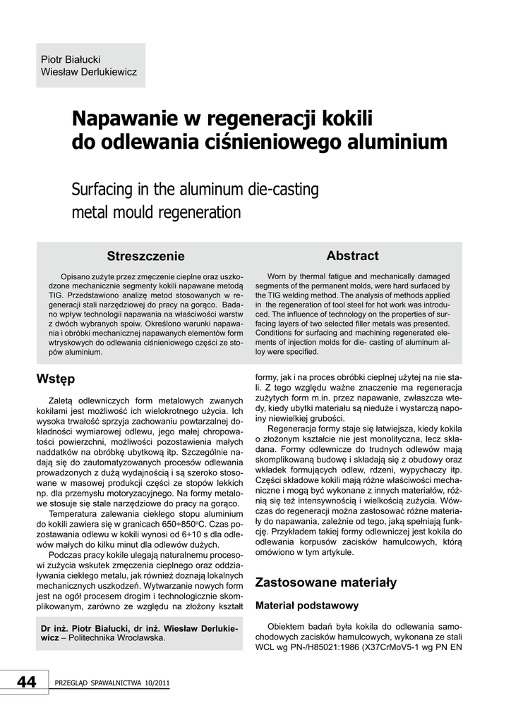 Piotr Białucki Wiesław Derlukiewicz napawanie w regeneracji kokili do odlewania ciśnieniowego aluminium surfacing in the aluminum die-casting metal mould regeneration Streszczenie Abstract Opisano zużyte przez zmęczenie cieplne oraz uszkodzone mechanicznie segmenty kokili napawane metodą TIG. Przedstawiono analizę metod stosowanych w regeneracji stali narzędziowej do pracy na gorąco. Badano wpływ technologii napawania na właściwości warstw z dwóch wybranych spoiw. Określono warunki napawania i obróbki mechanicznej napawanych elementów form wtryskowych do odlewania ciśnieniowego części ze stopów aluminium. Worn by thermal fatigue and mechanically damaged segments of the permanent molds, were hard surfaced by the TIG welding method. The analysis of methods applied in the regeneration of tool steel for hot work was introduced. The influence of technology on the properties of surfacing layers of two selected filler metals was presented. Conditions for surfacing and machining regenerated elements of injection molds for die- casting of aluminum alloy were specified. Wstęp Zaletą odlewniczych form metalowych zwanych kokilami jest możliwość ich wielokrotnego użycia. Ich wysoka trwałość sprzyja zachowaniu powtarzalnej dokładności wymiarowej odlewu, jego małej chropowatości powierzchni, możliwości pozostawienia małych naddatków na obróbkę ubytkową itp. Szczególnie nadają się do zautomatyzowanych procesów odlewania prowadzonych z dużą wydajnością i są szeroko stosowane w masowej produkcji części ze stopów lekkich np. dla przemysłu motoryzacyjnego. Na formy metalowe stosuje się stale narzędziowe do pracy na gorąco. Temperatura zalewania ciekłego stopu aluminium do kokili zawiera się w granicach 650÷850oC. Czas pozostawania odlewu w kokili wynosi od 6÷10 s dla odlewów małych do kilku minut dla odlewów dużych. Podczas pracy kokile ulegają naturalnemu procesowi zużycia wskutek zmęczenia cieplnego oraz oddziaływania ciekłego metalu, jak również doznają lokalnych mechanicznych uszkodzeń. Wytwarzanie nowych form jest na ogół procesem drogim i technologicznie skomplikowanym, zarówno ze względu na złożony kształt Dr inż. Piotr Białucki, dr inż. Wiesław Derlukiewicz– Politechnika Wrocławska. 44 Przegląd sPawalnictwa 10/2011 formy, jak i na proces obróbki cieplnej użytej na nie stali. Z tego względu ważne znaczenie ma regeneracja zużytych form m.in. przez napawanie, zwłaszcza wtedy, kiedy ubytki materiału są nieduże i wystarczą napoiny niewielkiej grubości. Regeneracja formy staje się łatwiejsza, kiedy kokila o złożonym kształcie nie jest monolityczna, lecz składana. Formy odlewnicze do trudnych odlewów mają skomplikowaną budowę i składają się z obudowy oraz wkładek formujących odlew, rdzeni, wypychaczy itp. Części składowe kokili mają różne właściwości mechaniczne i mogą być wykonane z innych materiałów, różnią się też intensywnością i wielkością zużycia. Wówczas do regeneracji można zastosować różne materiały do napawania, zależnie od tego, jaką spełniają funkcję. Przykładem takiej formy odlewniczej jest kokila do odlewania korpusów zacisków hamulcowych, którą omówiono w tym artykule. Zastosowanemateriały Materiałpodstawowy Obiektem badań była kokila do odlewania samochodowych zacisków hamulcowych, wykonana ze stali WCL wg PN-/H85021:1986 (X37CrMoV5-1 wg PN EN ISO 4957:2002, 1.2343 wg DIN). Zawartość pierwiastków stopowych w stali przedstawiono w tablicy I. Jest to stal narzędziowa chromowo-molibdenowa stosowana na narzędzia do pracy na gorąco. Wykonuje się z niej głównie formy do odlewania pod ciśnieniem stopów cynku, magnezu i aluminium, a także wkładki matrycowe, nożyce i gilotyny do cięcia na gorąco, elementy pras i form do tłoczenia metali lekkich, wkładki do formowania tworzyw sztucznych itp. Cechą stali WCL jest mała wrażliwość na gwałtowne zmiany temperatury, a przez to mała skłonność do powstawania powierzchniowej siatki pęknięć. Wytrzymuje silne nagrzewanie się powierzchni roboczej spowodowane np. stosunkowo długim kontaktem z obrabianym materiałem. Ma też bardzo dużą hartowność, jest odporna na odpuszczanie i zachowuje wytrzymałość w wysokiej temperaturze [1]. Cenną właściwością stali WCL jest mały wpływ obróbki cieplnej na zmianę wymiarów obrabianej części (ok. 0,02%), co pozwala wykonywać z niej części na gotowo przed obróbką cieplną. Dobra podatność na polerowanie ma korzystny wpływ na dokładność przylegania części w formie oraz na efekt estetyczny wyrobu. Podobnie jak inne stale narzędziowe do pracy na gorąco, również stal WCL należy do materiałów o bardzo ograniczonej spawalności i tylko w wyjątkowych przypadkach, takich jak naprawy narzędzia, może zachodzić konieczność połączenia jej z innymi gatunkami stali. Procesy spawalnicze związane z napawaniem regeneracyjnym zużytych narzędzi ewentualnie napoiny o specjalnych właściwościach mogą być zastosowane również do produkcji narzędzi nowych. Technologia napawania form odlewniczych ze stali narzędziowej do pracy na gorąco musi uwzględniać warunki pracy napoin w wysokiej temperaturze, aby ich trwałość nie była mniejsza od materiału podstawowego. Dobre właściwości do pracy w takich warunkach stale narzędziowe uzyskują dzięki odpowiedniej obróbce cieplnej (rys. 1), ale ciepło procesu spawania zmienia te właściwości. Dlatego narzędzia po napawaniu poddaje się najczęściej ponownej obróbce cieplnej, aby otrzymać pierwotne właściwości. Z tego względu najbardziej odpowiednim spoiwem jest takie, które ma podobny skład chemiczny jak materiał podstawowy, aby obróbka cieplna po napawaniu była właściwa dla obu materiałów – napoiny i materiału podstawowego. Niektórzy producenci opracowują spoiwa do konkretnego gatunku stali, np. elektroda EWNL przeznaczona jest do 
