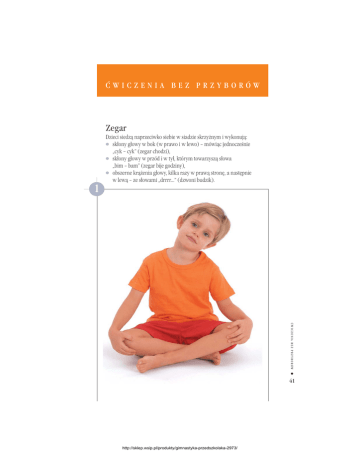 ĆWICZENIA BEZ PRZYBORÓW Zegar Dzieci siedzą naprzeciwko siebie w siadzie skrzyżnym i wykonują: ● skłony głowy w bok (w prawo i w lewo) – mówiąc jednocześnie „cyk – cyk” (zegar chodzi), ● skłony głowy w przód i w tył, którym towarzyszą słowa „bim – bam” (zegar bije godziny), ● obszerne krążenia głowy, kilka razy w prawą stronę, a następnie w lewą – ze słowami „drrrr...” (dzwoni budzik). 1 ĆWICZENIA BEZ PRZYBORÓW ● 41 http://sklep.wsip.pl/produkty/gimnastyka-przedszkolaka-2973/ Budowanie domu Dzieci siedzą w siadzie skrzyżnym i „budują dom”. Podnoszą jedną rękę i ustawiają dłoń równolegle do podłogi nad głową – to jest „parter”. Następnie nad głową, nad pierwszą dłonią ustawiają drugą dłoń – „pierwsze piętro”. Tak kolejno „budują” piętra do maksymalnego wyciągnięcia rąk w górę. Na koniec „budują dach” – łącząc w górze palce obu dłoni. ● ĆWICZENIA BEZ PRZYBORÓW 2 42 http://sklep.wsip.pl/produkty/gimnastyka-przedszkolaka-2973/ Kwiatek rośnie Dzieci siedzą w siadzie skrzyżnym z tułowiem pochylonym do przodu i dłońmi opartymi o podłogę. Na hasło „kwiatek rośnie” powoli prostują tułów i wyciągają ręce jak najwyżej w górę. Na hasło „kwiatek więdnie” powoli wracają do pozycji wyjściowej. 3 ĆWICZENIA BEZ PRZYBORÓW ● 43 http://sklep.wsip.pl/produkty/gimnastyka-przedszkolaka-2973/ Start rakiety 4 Dzieci siedzą w siadzie skrzyżnym, trzymając ręce w pozycji „skrzydełek”. Ich ręce są „rakietami” na wyrzutni. Wspólnie odliczają: „3, 2, 1, start”. Na słowo „start” wykonują energiczny wyprost rąk w górę – „rakieta startuje” i utrzymują ręce przez chwilę w maksymalnym wyciągnięciu w górę. Następnie uginają ręce, przenosząc je do pozycji „skrzydełek” – „druga rakieta szykuje się do startu”. 44 ● ĆWICZENIA BEZ PRZYBORÓW http://sklep.wsip.pl/produkty/gimnastyka-przedszkolaka-2973/ Lornetki 5 Dzieci leżą na podłodze na brzuchach. Trzymając ręce nad podłogą, układają palce dłoni tak, aby powstało kółko, i przenoszą dłonie do oczu. W ten sposób tworzą „lornetki”, przez które patrzą przed siebie. Rybki na piasku Dzieci leżą na podłodze na brzuchach. Naśladując rybę wyjętą z wody, unoszą i opuszczają na podłogę wyprostowane i złączone nogi. 6 ĆWICZENIA BEZ PRZYBORÓW http://sklep.wsip.pl/produkty/gimnastyka-przedszkolaka-2973/ ● 45 Odpowiadanie ruchami głowy Dzieci siedzą w siadzie skrzyżnym. Nauczycielka zadaje pytania, np.: Czy teraz jest noc? Czy teraz jest dzień? Czy chodzisz do szkoły? Czy lubisz słodycze? itp. Dzieci na pytania nauczycielki odpowiadają ruchami głowy: ● skłon głowy w przód i w tył, gdy odpowiedź brzmi „tak” (ruch potakiwania), ● skręty głowy w prawo i w lewo, gdy odpowiedź brzmi „nie” (ruch przeczenia). ● ĆWICZENIA BEZ PRZYBORÓW 7 46 http://sklep.wsip.pl/produkty/gimnastyka-przedszkolaka-2973/ Wiatraki Dzieci klęczą (lub stoją) naprzeciwko siebie i wykonują wyprostowanymi rękoma obszerne krążenia. Krążenia rąk mogą być: ● symetryczne lub asymetryczne, ● wolne lub szybkie, ● w przód lub w tył. Można połączyć krążenia rąk z głośnym dmuchaniem naśladującym wiatr poruszający skrzydła wiatraka. 8 Bociany 9 Dzieci chodzą po pokoju, trzymając ręce wyciągnięte w bok i wysoko unosząc kolana. Naśladują chodzące po łące bociany. ĆWICZENIA BEZ PRZYBORÓW ● 47 http://sklep.wsip.pl/produkty/gimnastyka-przedszkolaka-2973/ 10 Dziadek i żołnierz Dzieci chodzą po pokoju. Na hasło „dziadek” naśladują zgarbionego, zmęczonego staruszka. Na hasło „żołnierz” naśladują dziarskiego, wysokiego, wyprostowanego, wysportowanego żołnierza. Czas naśladowania żołnierza powinien być znacznie dłuższy niż naśladowania dziadka. Zrywanie jabłek Dzieci chodzą po pokoju. Co pewien czas stają na palcach i wyciągają jedną rękę jak najwyżej, jakby usiłowały zerwać wysoko wiszące jabłko. Jabłka powinny być „zrywane” raz prawą, raz lewą ręką. ● ĆWICZENIA BEZ PRZYBORÓW 11 48 http://sklep.wsip.pl/produkty/gimnastyka-przedszkolaka-2973/ Marsz wielkoludów Dzieci chodzą we wspięciu na palcach, udając „wielkoludy”. Do wspięcia na palce można dołączyć maksymalne wyciągnięcie wyprostowanych rąk w górę. 12 Przywitanie stóp Dzieci siedzą naprzeciwko siebie z nogami ugiętymi. Równocześnie unoszą jedną nogę, dotykając się podeszwami stóp (nogi „witają się”). 13 ĆWICZENIA BEZ PRZYBORÓW ● 49 http://sklep.wsip.pl/produkty/gimnastyka-przedszkolaka-2973/ Gra na bębenku – gra na pianinie 14 ● ĆWICZENIA BEZ PRZYBORÓW Dzieci siedzą z nogami ugiętymi. Unoszą nogi nad podłogę i rytmicznie, lekko uderzają piętami o podłogę, jakby grały na bębenku. Następnie zginają podeszwowo stopy i dotykając lekko palcami stóp do podłogi, naśladują grę na pianinie. Ruchom nóg może towarzyszyć rytm podawany przez nauczycielkę lub wspólnie śpiewana piosenka. 50 http://sklep.wsip.pl/produkty/gimnastyka-przedszkolaka-2973/ 15 Toczący się pień Dzieci leżą na podłodze z wyprostowanymi i złączonymi nogami i rękoma ułożonymi na podłodze przy głowie. Wykonują 3 obroty w jedną stronę, a następnie 3 obroty w drugą stronę. Wielbłądy Dzieci chodzą po pokoju na czworakach z wyprostowanymi nogami i wysoko uniesionymi biodrami, udając wielbłądy. 16 ĆWICZENIA BEZ PRZYBORÓW ● 51 http://sklep.wsip.pl/produkty/gimnastyka-przedszkolaka-2973/