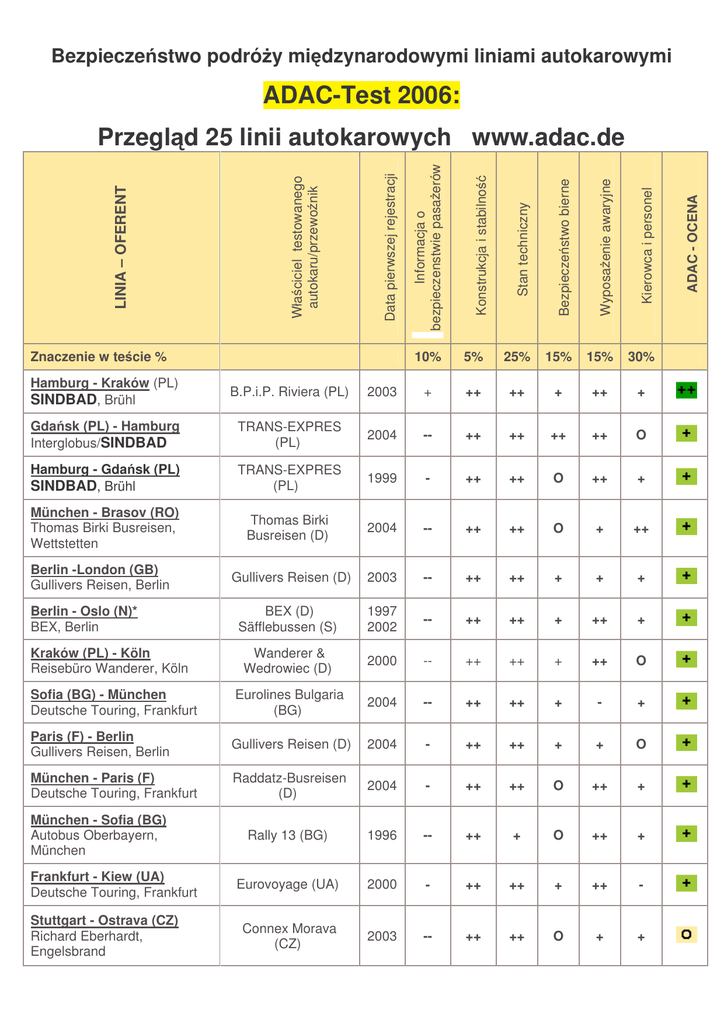 Bezpiecze stwo podró y mi dzynarodowymi liniami autokarowymi ADAC-Test 2006: Wyposa enie awaryjne Kierowca i personel 5% 25% 15% 15% 30% Hamburg - Kraków (PL) SINDBAD, Brühl B.P.i.P. Riviera (PL) 2003 + ++ ++ + ++ + Gda sk (PL) - Hamburg Interglobus/SINDBAD TRANS-EXPRES (PL) 2004 -- ++ ++ ++ ++ O Hamburg - Gda sk (PL) SINDBAD, Brühl TRANS-EXPRES (PL) 1999 - ++ ++ O ++ + München - Brasov (RO) Thomas Birki Busreisen, Wettstetten Thomas Birki Busreisen (D) 2004 -- ++ ++ O + ++ Gullivers Reisen (D) 2003 -- ++ ++ + + + BEX (D) Säfflebussen (S) 1997 2002 -- ++ ++ + ++ + Wanderer & Wedrowiec (D) 2000 -- ++ ++ + ++ O Sofia (BG) - München Deutsche Touring, Frankfurt Eurolines Bulgaria (BG) 2004 -- ++ ++ + - + Paris (F) - Berlin Gullivers Reisen, Berlin Gullivers Reisen (D) 2004 - ++ ++ + + O München - Paris (F) Deutsche Touring, Frankfurt Raddatz-Busreisen (D) 2004 - ++ ++ O ++ + Rally 13 (BG) 1996 -- ++ + O ++ + Eurovoyage (UA) 2000 - ++ ++ + ++ - Connex Morava (CZ) 2003 -- ++ ++ O + + Berlin -London (GB) Gullivers Reisen, Berlin Berlin - Oslo (N)* BEX, Berlin Kraków (PL) - Köln Reisebüro Wanderer, Köln München - Sofia (BG) Autobus Oberbayern, München Frankfurt - Kiew (UA) Deutsche Touring, Frankfurt Stuttgart - Ostrava (CZ) Richard Eberhardt, Engelsbrand ADAC - OCENA Bezpiecze stwo bierne 10% Konstrukcja i stabilno Stan techniczny Znaczenie w te cie % Informacja o bezpieczenstwie pasa erów Data pierwszej rejestracji Wła ciciel testowanego autokaru/przewo nik LINIA – OFERENT Przegl d 25 linii autokarowych www.adac.de Frankfurt - Warszawa (PL)* Reisebüro Eurotrans, Herne EUROTRANS (PL) 2003 2001 -- + ++ + O + Gda sk (PL) - Saarbrücken Reiseagentur I. Koza, Saarbrücken GROMADA TRANSPORT (PL) 1998 -- ++ ++ - + ++ Berlin - Neapel (I)* Gullivers Reisen, Berlin Gullivers Reisen (D) Reiseunternehmen G. Bayer (D) 2003 2003 -- ++ ++ + + O Stuttgart - Lissabon (P)* Reisebüro Ibero, Frankfurt a.M. Auto Viacao do Tamega (P) Intercars (F) k.A. k.A. -- ++ + O ++ O Brasov (RO) - Frankfurt Interconnect Services, Offenbach a.M. Double T (RO) 2003 -- ++ ++ + ++ -- Omnibusbetrieb Pletl (D) 1994 1999 -- ++ + O O - Prijedor (BIH)- München Deutsche Touring, Frankfurt a.M. Bakic Reisen (D) 1989 -- ++ ++ -- O - Warszawa (PL) - Frankfurt Deutsche Touring, Frankfurt a.M. Omnibusunternehme n Lenhard (D) 2000 -- ++ + + O - Istanbul (TR) - Stuttgart Deutsche Touring, Frankfurt a.M. Ulusoy Seyahat Nakliyat (TR) 1999 -- -- O + -- + München - Kaunas (LT) BAVARIA REISEDIENST, München ECOLINES (LV) 1994 -- ++ ++ O O -- München - Prijedor (BIH) Optima Tours, München VD Tours (BIH) 1982 -- ++ + -- -- + Stuttgart - Odessa (UA)* Kraft Reisen, Karlsruhe Kraft Reisen (D) 1993 2003 -- -- O -- O - Frankfurt - Brasov (RO)* Reisebüro Schinker, Wiehl * Przesiadka do innego autokaru k.A. = brak danych ++ bardzo dobra, + dobra, O przeci tna, - dostateczna, -- niedostateczna ADAC-OCENA Bardzo dobra Dobra Przeci tna Dostateczna niedostateczna