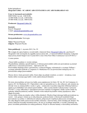 Kabel głośnikowy Skogrand Cables - SC AIR/SC AIR CENTAURUS A/SC AIR MARKARIAN 421 Ceny (w koronach norweskich): 8400 NOK/2 m (ok. 1100 EUR) 16 000 NOK/2 m (ok. 2100 EUR) 29 000 NOK/2 m (ok. 3800 EUR) Producent: Skogrand Cables SC Kontakt: Knut P. Skogrand e-mail: [email protected] Strona producenta: www.skograndcables.com Kraj pochodzenia: Norwegia Tekst: Wojciech Pacuła Zdjęcia: Wojciech Pacuła Data publikacji: 1. stycznia 2012, No. 93 We wstępie do opisu budowy swoich kabli, właściciel firmy Skogrand Cables SC, pan Knut P. Skogrand (i tak rozwiązała się zagadka nazwy) pisze tak: „w naszych kablach stosujemy wyłącznie najczystszą miedź Single Core Crystal (SCC) oraz Ultra Pure Ohno Continuous Cast (UP-OCC).” A zaraz potem: „Nasze kable są jedyne w swoim rodzaju. Wynaleźliśmy unikalny sposób budowy, w którym przewodniki solid-core prowadzone są niemal całkowicie w otoczeniu powietrza – stąd nazwa SC Air. Przewodniki dotykają rurek z powietrzem, w których biegną, wykonanych z czystego Teflonu i czystego jedwabiu (jedwab w Centaurus A i Markarian 421) na powierzchni mniejszej niż 1% powierzchni całego przewodnika.” Mocne słowa i duża pewność siebie. Knut zdaje się jednak wiedzieć, co mówi – świadczą o tym bardzo dobre recenzje jego kabli i wielu zadowolonych klientów. Do testu otrzymaliśmy od razu trzy kable, poza najtańszym Air Intro: SC Air, SC Air Centaurus A i topowy SC Air Markarian 421. Poprosiłem o taki set specjalnie po to, aby zobaczyć, jak zmienia się dźwięk wraz ze zmianą kabla o oczko w górę – ostatecznie wszystkie mają dość zbliżoną budowę i oparte są na dokładnie tym samym przewodniku – ultra czystej miedzi wykonywanej w procesie UP-OCC, a więc odlewanej w specjalnym procesie (zamiast wyciągania), dzięki czemu ustala się unikalny układ krystaliczny metalu. Zamiast wielu małych kryształów mamy pojedyncze, ultradługie kryształy. Te trzy kable różnią się między sobą w kilku detalach. Obydwa biegi tańszego kabla prowadzone są razem – żyły gorąca i zimna są ze sobą skręcone, podczas kiedy w droższych modelach biegi prowadzone są osobno w oddzielnych rurkach, połączonych wspólnym płaszczem zewnętrznym. Na całej długości kabli zamocowano krótkie elementy z drewna balsy, które działają jak damper. Na Konce nałożono koszulki termokurczliwe, ale nie ze zwykłego materiału, a wysoko cenionego np. przez Acrolinka poliolefinu (to rodzaj polimeru). Wtyki to złocone banany o niewielkiej zawartości metalu, tj. z niewielkimi kołnierzami. Dwa tańsze kable wykończone są siateczką PTE, zaś najdroższy specjalną, półprzezroczystą rurka z wysoką zawartością jedwabiu (o ile dobrze zrozumiałem – firma pisze o „Pure Silk Brocade Cable Sleeve” Na stronie firmowej znajdziemy opis własności mechanicznych i elektrycznych zarówno drewna balsy, jak i czystego Teflonu (”virgin PTFE”), z czego 99% jest dla mnie niezrozumiała, a niemal nic nie jest przydatne – nie jestem chemikiem czy fizykiem… Może jednak państwo będziecie mieli więcej do powiedzenia w tej mierze. Warto powiedzieć, ze kable przychodzą w znakomitych case’ach – plastikowych, hermetycznie zamykanych. Tak powinny być sprzedawane wszystkie high-endowe produkty!!! Na dzień 07.12.2011 przelicznik na polskie złote wynosi 0,5797 i np. 29 000 koron norweskich to 16 811,30 polskich złotych. Na dole strony internetowej producenta znajdziemy konwerter walut – jest w nim ujęty również PLN („Polish Zloty”). Do ceny należy doliczyć także cło w danym kraju i koszty przesyłki. ODSŁUCH Nagrania wykorzystane w teście (wybór): • Cold Cave, Cherish The Light Years, Matador Records/Hostess, O:E9212J, CD (2011). • David Sylvian, Sleepwalkers, P-Vine Records, PVCP-8790, CD (2011). • Dinah Washington, After Hours With Miss “D”, EmArcy/Verve, Verve Master Edition, 760562, CD (2004). • Jean Michel Jarre, Téo&Téa, Aero Productions/Warner Bros, 2564699766, CD+DVD (2007). • Marilyn Moore, Moody Marilyn Moore, Bethlehem/JVC, VICJ-61467, mini LP, K2HD CD (2007). • Melody Gardot, My One And Only Thrill, Verve/Universal, 1796783, CD (2009). • Miles Davis, Seven Steps To Heaven, Columbia/Sony Music/Analogue Productions, CAPJ8851, SACD/CD (2010). • Nosowska, 8, Supersam Music, SM 01, CD (2011); recenzja TUTAJ. • Radiohead, The King of Limbs, Ticker Tape Ltd., TICK-001CDJ, Blu-spec CD (2011). • Wes Montgomery & Wynton Kelly Trio, Smokin’ at the Half Note, Verve, 2103476, Verve Master Edition, CD (2005). Japońskie wersje płyt dostępne na CD Japan. SC Air Markarian 421 Jedną z popularniejszych metod zgrywania systemu audio jest dobieranie jego poszczególnych komponentów w taki sposób, aby jedne korygowały błędy, wady, albo po prostu niepożądane w danym kontekście cechy innych. Dla przykładu – mamy wyraziste, nieco jasne kolumny – żeby je utemperować, aplikujemy im raczej ciepły, ale na pewno nie analityczny wzmacniacz i jakieś neutralne źródło. Ewentualne poprawki przeprowadzamy dobranymi odpowiednio kablami. To ma sens i bardzo ładnie się sprawdza. Ale tylko do pewnego momentu. Kiedy bowiem przechodzimy na poziom, który umownie nazywamy high-endem, ta metoda przestaje się sprawdzać. Nie da się w high-endzie niczego „poprawić” kolejnym elementem w torze, a co najwyżej zepsuć. W dobrym systemie każde ogniwo wspomaga wszystkie inne, współgra z nimi, wspiera je i pomaga im pokazać się z jak najlepszej strony. Z tego powodu za każdym razem, kiedy testuję kable głośnikowe chylę czoła przed ludźmi z Tary Labs – używany przeze mnie kabel Omega Onyx za każdym razem pokazuje, co taki kabel robić powinien, a czego nie. Nie mówię przy tym, że to najlepszy kabel na świecie – nie o to chodzi. Nie ma czegoś takiego, jak „najlepszy” – jest co najwyżej „wysokiej klasy”, a reszta zależy od preferencji i konkretnego syste