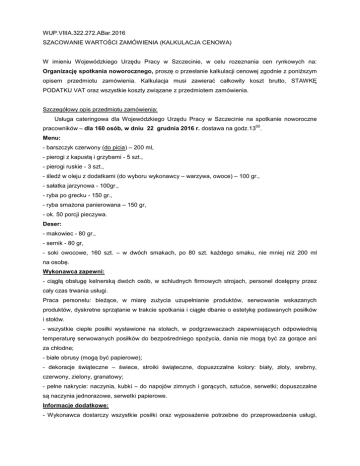 WUP.VIIIA.322.272.ABar.2016 SZACOWANIE WARTOŚCI ZAMÓWIENIA (KALKULACJA CENOWA) W imieniu Wojewódzkiego Urzędu Pracy w Szczecinie, w celu rozeznania cen rynkowych na: Organizację spotkania noworocznego, proszę o przesłanie kalkulacji cenowej zgodnie z poniższym opisem przedmiotu zamówienia. Kalkulacja musi zawierać całkowity koszt brutto, STAWKĘ PODATKU VAT oraz wszystkie koszty związane z przedmiotem zamówienia. Szczegółowy opis przedmiotu zamówienia: Usługa cateringowa dla Wojewódzkiego Urzędu Pracy w Szczecinie na spotkanie noworoczne 00 pracowników – dla 160 osób, w dniu 22 grudnia 2016 r. dostawa na godz.13 . Menu: - barszczyk czerwony (do picia) – 200 ml, - pierogi z kapustą i grzybami - 5 szt., - pierogi ruskie - 3 szt., - śledź w oleju z dodatkami (do wyboru wykonawcy – warzywa, owoce) – 100 gr., - sałatka jarzynowa - 100gr., - ryba po grecku - 150 gr., - ryba smażona panierowana – 150 gr, - ok. 50 porcji pieczywa. Deser: - makowiec - 80 gr., - sernik - 80 gr, - soki owocowe, 160 szt. – w dwóch smakach, po 80 szt. każdego smaku, nie mniej niż 200 ml na osobę. Wykonawca zapewni: - ciągłą obsługę kelnerską dwóch osób, w schludnych firmowych strojach, personel dostępny przez cały czas trwania usługi. Praca personelu: bieżące, w miarę zużycia uzupełnianie produktów, serwowanie wskazanych produktów, dyskretne sprzątanie w trakcie spotkania i ciągłe dbanie o estetykę podawanych posiłków i stołów. - wszystkie ciepłe posiłki wystawione na stołach, w podgrzewaczach zapewniających odpowiednią temperaturę serwowanych posiłków do bezpośredniego spożycia, dania nie mogą być za gorące ani za chłodne; - białe obrusy (mogą być papierowe); - dekoracje świąteczne – świece, stroiki świąteczne, dopuszczalne kolory: biały, złoty, srebrny, czerwony, zielony, granatowy; - pełne nakrycie: naczynia, kubki – do napojów zimnych i gorących, sztućce, serwetki; dopuszczalne są naczynia jednorazowe, serwetki papierowe. Informacje dodatkowe: - Wykonawca dostarczy wszystkie posiłki oraz wyposażenie potrzebne do przeprowadzenia usługi, z takim wyprzedzeniem czasowym aby usługa mogła rozpocząć się o zaplanowanej godzinie; - każde z serwowanych dań będzie ustawione/ ułożone w kilku miejscach na każdym ze stołów, - posiłki będą serwowane w holu na pierwszym piętrze budynku, na stołach konferencyjnych udostępnionych przez Zamawiającego; - stoły na posiłki ciepłe - 4 sztuki o rozmiarze 180x100 cm, wymagana dekoracja na stołach: stroiki świąteczne; - stół na ciasta i soki, tzw.: „deserowy” – zapewnia Zamawiający - o rozmiarze ok. 200x100 cm, krótsze boki stołu okrągłe, wymagana dekoracje na stole: świeczki/ świeczniki (nie mogą powodować prawdopodobieństwa poparzenia osób korzystających z cateringu - powinny być osłonięte, lub ustawione w specjalnych naczyniach) oraz stroiki świąteczne; - Wykonawca zapewnia czystą, nie zniszczoną, nie wyszczerbioną zastawę, sztućce i naczynia lub nową, nie używaną zastawę sztućców plastikowych; - wszystkie posiłki serwowane w formie bufetu szwedzkiego; - Zamawiający zapewnia, na cały czas trwania spotkania i jego przygotowań, zaplecze kuchenne z dostępem do wody i prądu, które znajduje się na tym samym piętrze, na którym odbędzie się poczęstunek; - uprzątnięcie naczyń i odbiór wszystkich niezbędnych rzeczy do przeprowadzenia usługi, nastąpi po zakończeniu usługi, tego samego dnia lub w dniu następnym, do godziny 10:00 (miejsce przechowania rzeczy zostanie wskazane przez Wykonawcę). Oferta powinna zawierać cenę brutto i wskazanie wysokości podatku VAT. KALKULACJĘ CENOWĄ NALEŻY KIEROWAĆ NA ADRES MAILOWY: [email protected] do dnia 7 listopada 2016 r., do godziny 10:00. ZAZNACZAM, IŻ ROZEZNANIE CENOWE (SZACOWANIE WARTOŚCI ZAMÓWIENIA) STANOWI ELEMENT ANALIZY RYNKU I NIE JEST ZAMÓWIENIEM W ROZUMIENIU USTAWY PRAWO ZAMÓWIEŃ PUBLICZNYCH, A OTRZYMANE OD PAŃSTWA OFERTY NIE POWODUJĄ ŻADNYCH ZOBOWIĄZAŃ. Po ustaleniu przez Zamawiającego szacunkowej wartości zamówienia, informacja o właściwym postępowaniu zamieszczona będzie na stronie internetowej Urzędu