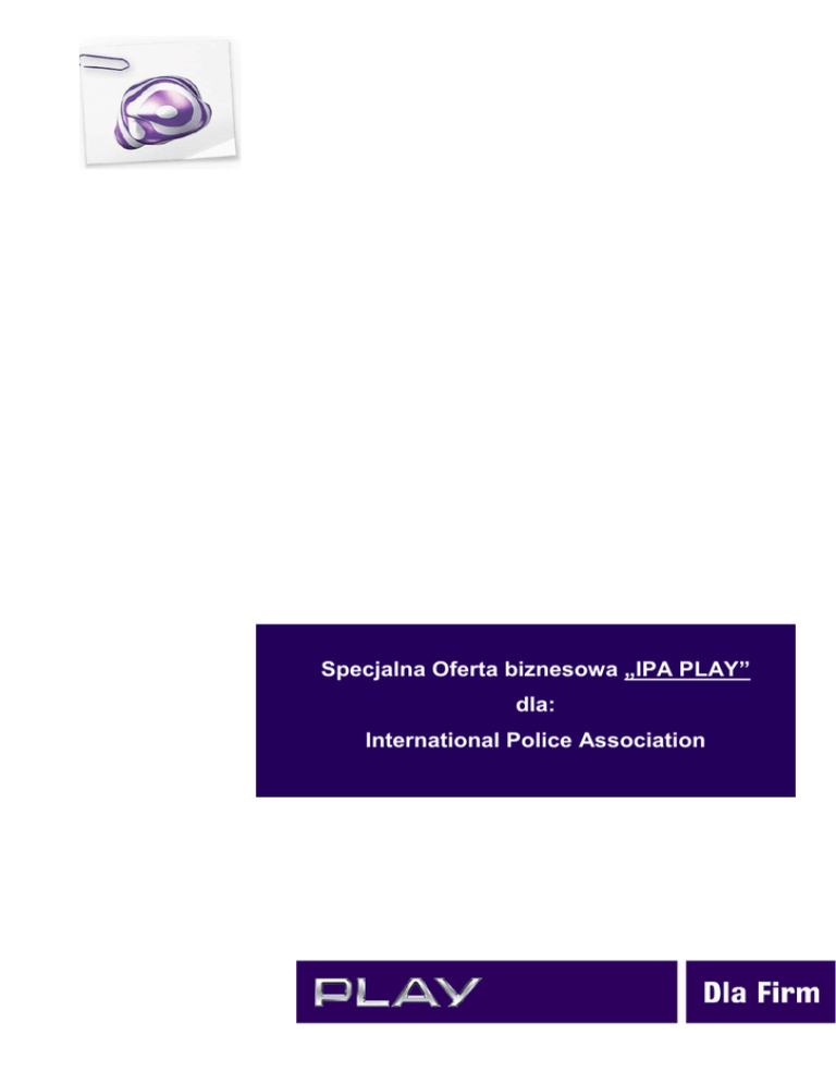 Specjalna Oferta biznesowa „IPA PLAY” dla: International Police Association Szanowni Państwo W związku z decyzją zarządu International Police Association odnośnie zmiany operatora sieci komórkowej na P4 Sp. z o.o. ( PLAY), przedstawiamy Państwu specjalną ofertę „IPA PLAY” dla członków IPA, oraz ich rodzin. Zalety oferty: Specjalne ceny abonamentów Największe ilości minut na rynku Połączenia ze wszystkimi numerami w Play , oraz numerami stacjonarnymi za darmo MMS w cenie SMS Pakiet internetu w telefonie w pierwszym miesiącu za darmo, w kolejnych odpłatnośd : o 5 PLN Brutto za 25 MB o 10 PLN Brutto za 100 MB o 20 PLN Brutto za 250 MB o 35 PLN Brutto za 500 MB Możliwośd zachowania dotychczasowego numeru Oferta z telefonem (24 msc), lub bez telefonu (12msc) Darmowy dostęp do konta (billing, rachunki i płatności, włączanie i wyłącznie usług) indywidualnie dla każdego użytkownika 2 Poniżej cennik oferty bez telefonu i z telefonem. Ceny zawarte w cennikach są cenami Brutto i zawierają 23% podatek VAT Oferta specjalna dla INTERNATIONAL POLICE ASSOCIACION bez telefonu 12 msc Taryfy Abonament Rabat na Abonament na czas nieokreślony Abonament po zniżce Maksymalna liczba minut do wszystkich w ramach abonamentu Cena minuty na stacjonarne Biznes 30 Biznes 60 Biznes 90 Biznes 160 36,9 PLN 73,8 PLN 110,7 PLN 196,8 PLN Brutto Brutto Brutto Brutto 30% 40% 25,8 PLN 44,3 PLN 55,4 PLN 98,4 PLN Brutto Brutto Brutto Brutto 150 minut 450 minut 750 minut 1333 minuty 50% 0 gr Cena minuty do Play Cena minuty w abonamencie i poza Pakiet Internet 0,25 gr 0,22 gr Brutto Brutto 25 MB 3 Taryfy Oferta specjalna dla INTERNATIONAL POLICE ASSOCIACION z telefonem na okres 24 msc Biznes 30 Biznes 60 Biznes 90 Biznes 160 Abonament Rabat na Abonament na czas nieokreślony Abonament po zniżce Maksymalna liczba minut do wszystkich w ramach abonamentu Cena minuty na stacjonarne Biznes 300 36,9 PLN 73,8 PLN 110,7 PLN 196,8 PLN 369 PLN Brutto Brutto Brutto Brutto Brutto 10% 28% 32,50% 41,50% 46% 33,2 PLN 53,2 PLN 74,7 PLN 115,1 PLN 199,3 PLN Brutto Brutto Brutto Brutto Brutto 175 minut 525 minut 917 minut 1556 minuty 2778 minut 0 gr Cena minuty do Play Cena minuty w abonamencie i poza 0,25 gr 0,22 gr Brutto Brutto Pakiet Internet 25 MB 100 MB W razie pytań pozostajemy do dyspozycji Marta Kosno 503 641 663 Hubert Ostatek 790 031 209 4