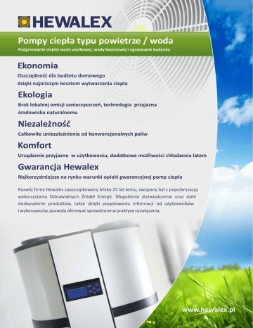 Pompy ciepła typu powietrze / woda Podgrzewanie ciepłej wody użytkowej, wody basenowej i ogrzewanie budynku Ekonomia Oszczędność dla budżetu domowego dzięki najniższym kosztom wytwarzania ciepła Ekologia Brak lokalnej emisji zanieczyszczeń, technologia przyjazna środowisku naturalnemu Niezależność Całkowite uniezależnienie od konwencjonalnych paliw Komfort Urządzenie przyjazne w użytkowaniu, dodatkowe możliwości chłodzenia latem Gwarancja Hewalex Najkorzystniejsze na rynku warunki opieki gwarancyjnej pomp ciepła Rozwój firmy Hewalex zapoczątkowany blisko 25 lat temu, związany był z popularyzacją wykorzystania Odnawialnych Źródeł Energii. Długoletnie doświadczenie oraz stałe doskonalenie produktów, także dzięki pozyskiwaniu informacji od użytkowników i wykonawców, pozwala oferować sprawdzone w praktyce rozwiązania. www.hewalex.pl Pompa ciepła PCWU 3,8H-A3 Podgrzewanie ciepłej wody użytkowej Pompa ciepła PCWU 3,8H-A3 przeznaczona jest do podgrzewania ciepłej wody użytkowej we współpracy z istniejącym podgrzewaczem o pojemności od 100 do 300 litrów. Natychmiastowy efekt – obniżenie rachunków za ciepłą wodę użytkową Współczynnik efektywności pracy pompy ciepła COP wynosi dla średnich warunków do 3,8 (A7/W30) co oznacza, że z 1 kW zużywanej energii elektrycznej, uzyskuje się wówczas 3,8 kW ciepła. Tym samym rachunki za podgrzewanie wody użytkowej ulegają obniżeniu, szczególnie wyraźnie w porównaniu do podgrzewania jej grzałką lub bojlerem elektrycznym. Wydajność 3,8 kW ciepła przy zużyciu 1 kW energii elektrycznej Wysoka wydajność, wysoki komfort użytkowania COP 3,8 Skraplacz pompy ciepła jest wykonany jako wymiennik płaszczowo-rurowy. Układ ten wykluczający pośrednie wymienniki ciepła charakteryzuje się najwyższą możliwą efektywnością pracy (o ok. 15% wyższą np. niż przy zastosowaniu wężownicy). Zastosowana moc pompy ciepła (jedna z największych na rynku w segmencie pomp ciepła do wody użytkowej) pozwala na szybkie ogrzanie ok. 80 litrów wody w ciągu godziny. Standardowo będzie więc wystarczała na potrzeby 4-6 osobowej rodziny. 700 litrów dziennie Dzienna wydajność do 700 litrów ciepłej wody użytkowej Maksymalne ułatwienie montażu – podłączenie do istniejącego podgrzewacza wody Szczególną zaletę pompy ciepła stanowi konstrukcja umożliwiająca bezpośredni przepływ wody użytkowej. Dzięki temu możliwe jest jej podłączenie pompy ciepła do istniejącego podgrzewacza wody o pojemności od 100 do 300 litrów. Wbudowana pompa obiegowa zapewnia przepływ wody użytkowej pomiędzy podgrzewaczem a pompą ciepła, co maksymalnie ułatwia i skraca prace instalacyjne. 100-300 litrów Podłączenie do podgrzewaczy wody 100-300 litrów Chłodzenie w standardzie Chłodzenie o 5-8oC przez kilka godzin dziennie Powietrze wychodzące z pompy ciepła ma wydatek 5003 800 m /h i jest schłodzone o około 5-8°C. Dlatego w okresach letnich może być wykorzystywane jako darmowe medium schładzające takie pomieszczenia, jak np. pralnia, spiżarnia, fitness, itp.. Poza schładzaniem uzyskuje się efekt usuwania wilgoci z pomieszczenia. Możliwe jest także podłączenie pompy ciepła do układu centrali wentylacyjnej z rekuperatorem. Podstawowe parametry pompy ciepła Model PCWU 3,8H-A3 Moc grzewcza kW 3,8 Moc zasilania pompy ciepła (średnia) kW 1 Współczynnik efektywności COP (A7/W30-35) Zasilanie 3,8 V~/Hz Max. temp. ogrzewania wody o Przepływ powietrza 3 Średnica króćców powietrza Hałas (mierzony 2m od źródła) Wymiary urządzenia (dł. / szer. / wys.) PCWU 3,8H-A3 Uchwyt ścienny C Dodatkowy efekt chłodzenia pomieszczeń 230/50 60 m /h 500/800 mm ø158 dB(A) 30 mm 710/530/440 Cena netto 4 090 zł Nr katalogowy 91.10.01 Cena netto 260 zł Nr katalogowy 90.00.08 Uchwyt ścienny Zapewnia wygodę i estetykę zabudowy pompy ciepła w pomieszczeniu. Dodatkowo uchwyt zapewnia tłumienie drgań pochodzących od pracy sprężarki. Podgrzewacz CWU z pompą ciepła PCWU 200K-2.3kW, PCWU 300K-2.3kW i PCWU 300SK-2.3kW. Podgrzewanie ciepłej wody użytkowej Podgrzewacz z pompą ciepła przeznaczony jest do podgrzewania ciepłej wody użytkowej samodzielnie lub we współpracy z innym źródłem ciepła, np. kotłem gazowym. Niższe koszty, wyższy komfort Analogicznie do pompy ciepła PCWU 3,8H-A3 (bez podgrzewacza), uzyskuje się zmniejszenie kosztów podgrzewania wody użytkowej, wysoki komfort w dostarczaniu do 700 litrów wody dziennie oraz możliwość dodatkowego chłodzenia pomieszczeń powietrzem usuwanym z pompy ciepła. Wężownice grzewcze Funkcjonalność rozwiązań technicznych i możliwości współpracy Wbudowana 1 lub 2 wężownice grzewcze o powierzchni 1 m2 Podgrzewacz posiada wbudowaną jedną lub dwie wężownice. W pompie ciepła PCWU 300SK-2,3 kW, skraplacz przeniesiono wyżej, aby pozostawić chłodną strefę pracy dla instalacji solarnej. Druga wężownica pozwala podłączyć także kocioł grzewczy. 2 mm NOWOŚĆ 2013 Podgrzewacz ze stali nierdzewnej Odporność na korozję i zachowanie warunków higienicznych Zasobnik wody użytkowej zintegrowany z pompą ciepła został wykonany z wysokogatunkowej stali nierdzewnej o grubości 2 mm. Dodatkowo jest on chroniony aktywną anodą tytanową. Funkcja wygrzewu antybakteryjnego dodatkowo zapewnia higieniczne warunki podgrzewania wody. Zaawansowane funkcje sterownika Innowacyjne rozwiązanie w zakresie sterownika pozwala zarządzać podgrzewaniem wody użytkowej z różnych źródeł ciepła, także w trybie optymalizacji kosztów eksploatacji. Sterownik posiada 9 gotowych schematów instalacji, których pracę można wygodnie nadzorować na dużym ekranie, a także przy pomocy systemu zdalnego nadzoru – bezpośrednio z poziomu witryny internetowej. Ponadstandardowe okresy gwarancji Urządzenia mogą być objęte nawet 3letnim okresem gwarancji na moduły pompy ciepła i 5-letnim dla podgrzewaczy wody