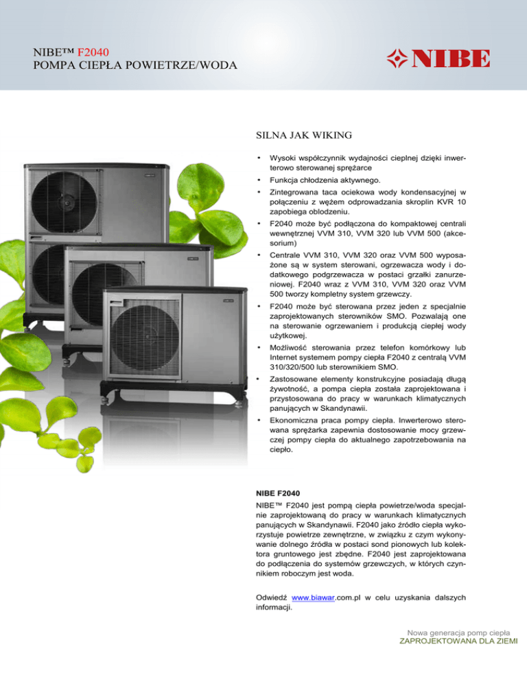 NIBE™ F2040 POMPA CIEPŁA POWIETRZE/WODA SILNA JAK WIKING • Wysoki współczynnik wydajności cieplnej dzięki inwerterowo sterowanej sprężarce • Funkcja chłodzenia aktywnego. • Zintegrowana taca ociekowa wody kondensacyjnej w połączeniu z wężem odprowadzania skroplin KVR 10 zapobiega oblodzeniu. • F2040 może być podłączona do kompaktowej centrali wewnętrznej VVM 310, VVM 320 lub VVM 500 (akcesorium) • Centrale VVM 310, VVM 320 oraz VVM 500 wyposażone są w system sterowani, ogrzewacza wody i dodatkowego podgrzewacza w postaci grzałki zanurzeniowej. F2040 wraz z VVM 310, VVM 320 oraz VVM 500 tworzy kompletny system grzewczy. • F2040 może być sterowana przez jeden z specjalnie zaprojektowanych sterowników SMO. Pozwalają one na sterowanie ogrzewaniem i produkcją ciepłej wody użytkowej. • Możliwość sterowania przez telefon komórkowy lub Internet systemem pompy ciepła F2040 z centralą VVM 310/320/500 lub sterownikiem SMO. • Zastosowane elementy konstrukcyjne posiadają długą żywotność, a pompa ciepła została zaprojektowana i przystosowana do pracy w warunkach klimatycznych panujących w Skandynawii. • Ekonomiczna praca pompy ciepła. Inwerterowo sterowana sprężarka zapewnia dostosowanie mocy grzewczej pompy ciepła do aktualnego zapotrzebowania na ciepło. NIBE F2040 NIBE™ F2040 jest pompą ciepła powietrze/woda specjalnie zaprojektowaną do pracy w warunkach klimatycznych panujących w Skandynawii. F2040 jako źródło ciepła wykorzystuje powietrze zewnętrzne, w związku z czym wykonywanie dolnego źródła w postaci sond pionowych lub kolektora gruntowego jest zbędne. F2040 jest zaprojektowana do podłączenia do systemów grzewczych, w których czynnikiem roboczym jest woda. Odwiedź www.biawar.com.pl w celu uzyskania dalszych informacji. Nowa generacja pomp ciepła ZAPROJEKTOWANA DLA ZIEMI JAK DZIAŁA NIBE™ F2040 Zasada działania Konserwacja Poniżej podano uproszczoną wersję zasady działania urządzenia. Powietrze zewnętrzne jest zasysane do pompy ciepła, gdzie natrafia na układ zamknięty, zawierający czynnik chłodniczy, który charakteryzuje się bardzo niską temperaturą wrzenia. F2040 jest wyposażona w sprzęt sterowania i monitoringu, jednakże nadal konieczne są niektóre zewnętrzne prace konserwacyjne. Odparowany w parowniku czynnik chłodniczy kierowany jest do sprężarki. W wyniku sprężania gazu rośnie ciśnienie oraz znacznie wzrasta jego temperatura. Następnie, przy użyciu skraplacza, ciepło jest przekazywane do układu grzewczego. W skraplaczu gazu ulega skropleniu i w postaci ciekłej dopływa do zaworu rozprężnego, w którym następuje redukcja ciśnienia, a wraz z nim temperatury. Ochłodzony czynnik wpływa do parownika zamykając cykl pracy. W ciągu roku sprawdzaj regularnie, czy kratka wlotowa nie zostały zatkane przez liście, śnieg lub cokolwiek innego. Silny wiatr połączony z dużymi opadami śniegu może zablokować wlot i wylot kratek powietrznych. Upewnij się, że na kratkach nie zgromadził się śnieg. W ciągu roku taca ociekowa wody kondensacyjnej i rura odpływowa może wymagać oczyszczania z liści i podobnych zanieczyszczeń. W razie konieczności obudowę zewnętrzną można wyczyścić używając mokrej szmatki. Należy postępować ostrożnie, aby nie zarysować pompy ciepła podczas czyszczenia. Unikaj pryskania wodą na kratkę lub na boki, aby woda nie dostawała się do środka F2040. Unikaj kontaktu pompy ciepła z alkalicznymi czynnikami czyszczącymi. Nie pozwalaj na nawarstwianie się śniegu i/lub oblodzenie. Podłączenie systemu grzewczego oraz c.w.u. Strona czynnika grzewczego i ciepłej wody użytkowej musi być wyposażona w elementy zabezpieczające zgodnie z obowiązującymi przepisami. Objaśnienie symboli EB15 Jednostka wewnętrzna (VVM 310) 2 NIBE F2040 EB101 Pompa ciepła (F2040) Inne informacje FL10 Zawór bezpieczeństwa CM1 Naczynie przeponowe HQ1 Filtr cząstek stałych EB1 Grzałka zanurzeniowe QM1 Zawór czerpalny FL1 Zawór bezpieczeństwa, c.w.u. Zawór bezpieczeństwa, c.o. QM40 Zawór odcinający FL2 QM41 Zawór odcinający QM40 Zawór odcinający RN10 Zawór równoważący RM1 Zawór zwrotny DOSTAWA I OBSŁUGA NIBE™ F2040 Transport i przechowywanie F2040 powinna być transportowana i przechowywana w pozycji pionowej. Sterowanie F2040 jest sterowana inwerterowo. Podłączona jednostka wewnętrzna obsługuje wszystkie funkcje konieczne dla pracy pompy ciepła. Kontrolowane są odpowiednio: odszranianie, zatrzymanie przy temperaturze maksymalnej/minimalnej, podłączenie podgrzewacza sprężarki, jak również umożliwienie podgrzewania tacy ociekowej, monitorowanie ochrony silnika i wyłączników ciśnienia. Zintegrowany sterownik jest ustawiony podczas instalacji i może być używany w trakcie eksploatacji. W normalnych warunkach pracy, właściciel domu nie musi mieć dostępu do sterownika. Poziomy ciśnienia dźwięku Pompa ciepła F2040 jest zazwyczaj ustawiana obok ściany domu, co powoduje bezpośrednie przenoszenie się dźwięku, co należy uwzględnić. Z tego powodu podczas ustawiania zawsze należy wybierać stronę skierowaną w najmniej czułe otoczenie. Na poziom hałasu mają wpływ ściany, cegły, różnice w poziomie podłoża itp. i dlatego powinny być traktowane jako wartości wskaźnikowe. F2040 dostosowuje prędkość wentylatora w zależności od temperatury otoczenia i temperatury parowania. Typ F2040-8 F2040-12 F2040-16 Lw(A) 54 57 68 Maksymalny poziom dźwięku przy 2 m* dB(A) 40 43 54 Maksymalny poziom dźwięku przy 6 m* dB(A) 30,5 33,5 44,5 Maksymalny poziom dźwięku przy 10 m* dB(A) 26 29 40 Natężenie dźwięku, zgodnie z EN 12102 przy 7/45 Prędkość wentylatora * Wolne pole NIBE F2040 3 DOSTAWA I OBSŁUGA NIBE™ F2040 Wyposażenie F2040-8 4 NIBE F2040 Elementy elektryczne F2040-8 DOSTAWA I OBSŁUGA NIBE™ F2040 Lista podzespołów Przyłącza rurowe Podzespoły chłodzące QM35 Zawór serwi