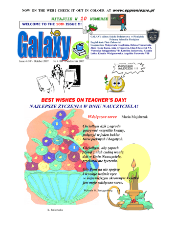 NOW ON THE WEB ! CHECK IT OUT IN COLOUR AT WITAJCIE W 10 www.sppieniezno.pl NUMERZE !!! WELCOME TO THE 10th ISSUE !!! GALAXY editor: Szkoła Podstawowa w PienięŜnie Primary School in PienięŜno English text: Piotr śukowski Cooperation: Małgorzata Czaplińska, Helena Frankowska Also: Iwona Bacza, Ania Gregorczyk, Eliza Choszczyk VA, Weronika Szniggenberg VB, Karolina Jankowska, Klaudia Letka, Klaudia Wielguszewska, Angelika Turowska VIB Issue 4 /10/ - October 2007 Nr 4 /10/ - PaŜdziernik 2007 BEST WISHES ON TEACHER’S DAY! NAJLEPSZE śYCZENIA W DNIU NAUCZYCIELA! Wdzięczne serce Maria Majchrzak Chciałbym dziś z ogrodu pozrywać wszystkie kwiaty, połączyć w jeden bukiet barw pięknych i bogatych. Chciałbym, aby zapach płynął z nich cudną wonią dziś w Dniu Nauczyciela, przekazał me Ŝyczenia. Gdy Pani na nie spojrzy i w swoje weźmie ręce w najmniejszym skromnym kwiatku jest moje wdzięczne serce. Wybrała W. Szniggenberg K. Jankowska śYCZENIA / WISHES Oto życzenia dla pań i panów pracujących w naszej szkole, które odebrali od Was nasi wysłannicy: • • Wszystkim nauczycielom, pracownikom administracji i obsługi najserdeczniejsze życzenia wszelkiej pomyślności przesyła redakcja gazetki szkolnej GALAXY ! Wszystkiego dobrego, dużo zdrowia, szczęścia pomyślności Ŝyczą pani Wiesławie Skubiszewskiej uczniowie z klasy II B! • W Dniu Nauczyciela wszystkiego najlepszego, duŜo zdrowia i szczęścia Ŝyczy pani Małgorzacie Czaplińskiej klasa III A! • Wszystkiego najlepszego, duŜo szczęścia i zdrowia dla naszej pani Doroty Bałandy Ŝyczą wychowankowie z klasy III B! • Z okazji Dnia Edukacji Narodowej wychowankowie pani Joanny Mokrzyckiej składają najserdeczniejsze życzenia zdrowia i wiele dobrego na wszystkie dni ! • Wszystkiego najlepszego w Dniu Nauczyciela od kl. VB dla pana Piotra Żukowskiego ! A. Gregorczyk Harvest Festiwal / DoŜynki 2007 W tym roku odbyły się kolejne DoŜynki Gminne. Zaprezentowaliśmy tam nasze zdjęcia, dyplomy i prace plastyczne. Autorami niektórych prac wykonanych pod kierunkiem pani Małgorzaty Czaplińskiej były: Daria Grzybowska, Ania Demkowicz oraz Ilona Jankowska. This year it took place the next District Harvest Festival. We presented our photographs, diplomas and works. The works were made under Mrs Małgorzata Czaplińska’s direction. Some authors were: Daria Grzybowska, Ania Demkowicz and Ilona Jankowska. . Nasze stoisko prezentowało się okazale... Our stand was impressive... Zaskoczył nas Kamil Szymak, który wspaniale zaprezentował się na scenie wraz z dziewczętami z zespołu ,,Muzyczne Dzieciaki’’ pani Jolanty Szocik. We were surprised by Kamil Szymak who made a wonderful appearance on stage along with the girls from the band ,,Music Kids’’ under Mrs Jolanta Szocik’s direction. Kamil i ,,Muzyczne Dzieciaki’’ w akcji Kamil and ,,Music Kids’’ in action 2 CULTURE CORNER / KĄCIK CIK KULTURALNY Today: The Rolling Stones - The greatest rock and roll band in the world Dzisiaj: The Rolling Stones – największy rock and rollowy zespoł świata K.Letka, K. Wielguszewska 1960s - somewhere in Africa 1960s: Bill, Mick, Keith and Charlie 1970s: Mick and Keith 2000s: Charlie, Keith, Mick and Ron The Rolling Stones are an English rock and roll band. The band was formed in London in 1962 by original leader Brian Jones, but eventually led by the songwriting partnership of singer Mick Jagger and guitarist Keith Richards. Pianist Ian Stewart, drummer Charlie Watts and bassist Bill Wyman completed the early lineup in 1963. They gave their first performance in London at the Marquee Club, on 12th July 1962. Their first great hit was I Wanna Be Your.Man. During the 1969 American tour, tour manager Sam Cutler introduced them as "The Greatest Rock and Roll Band in the World". Guitarist Brian Jones died in 1969 and was replaced by 21-year-old Mick Taylor. After Taylor quit in 1974, guitarist Ron Wood was asked to take his place. Bill Wyman retired in 1993 being replaced by Darryl Jones. The band have released 55 albums. They have sold more than 200 million albums worldwide. In 1989 the Rolling Stones were inducted into the American Rock and Roll Hall of Fame. They recorded many hits, such as: I Wanna Be Your Man, Paint in Black, Satisfaction, Ruby Tuesday, Brown Sugar, Lady Jane, Angie, Wild Horses. Glossary was formed – powstał was replaced by – został zastąpiony przez eventually led by – ostatecznie poprowadzony przez quit - porzucił songwriting partnership – spółka autorska was asked to take his place – był poproszony o zajęcie jego miejsca drummer - perkusista retired – przeszedł na emeryturę completed the early lineup – uzupełnili wczesny skład being - będąc gave their first performance – dali swój pierwszy występ have released - wydali during - podczas have sold more than – sprzedali więcej niŜ tour - trasa worldwide – na świecie introduced them as – przedstawił ich jako were inducted into – zostali wprowadzeni do 3 HUM UR A. Turowska * Na lekcji geografii nauczycielka pyta Jasia: - Jasiu, czy znasz Kanał Sueski? - Nie, na naszym osiedlu nie ma jeszcze kablówki! During the Geography lesson a teacher asks Sean: - Johnny, do you know the Suez Canal? - No, I don’t, we haven’t got a cable TV on our housing estate, yet! ***************************************************** W czasie klasówki z biologii nauczycielka groźnie mówi do Jasia -Jasiu, nie ściągaj! -Ale ja nie ściągam! -Mógłbyś przynajmniej nie kłamać! Sama widziałam jak liczyłeś sobie Ŝebra! During a biology test a teacher says menacingly to Johnny: - Don’t cheat, Johnny! - But I’m not cheating! -You could at least not to lie! But I have seen you counting your ribs! ***************************************************** Pani od historii pyta Stasia: - Stasiu, co robił król Waza? Stasiu na to: - Jak sama nazwa mówi Waza lubił zupy... A History teacher asks Stan: -
