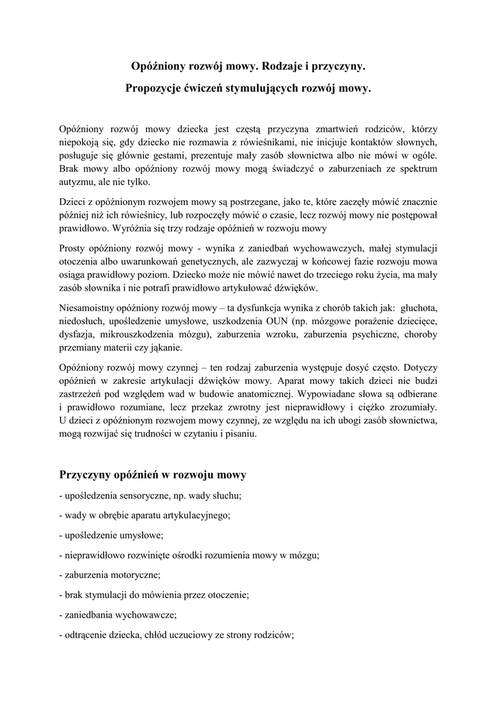 Opóźniony rozwój mowy. Rodzaje i przyczyny. Propozycje ćwiczeń