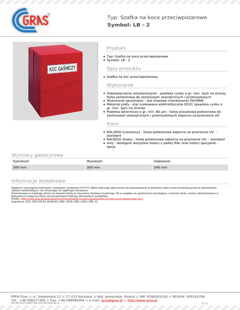 Typ: Szafka na koce przeciwpożarowe Symbol: LB - 2 Produkt Typ: Szafka na koce przeciwpożarowe Symbol: LB - 2 Opis produktu Szafka na koc przeciwpożarowy Wykonanie Zabezpieczenie antykorozyjnie - powłoka cynku o gr. min. 3μm na stronę; farba poliestrowa do zastosowań zewnętrznych i przemysłowych Wykonanie opcjonalne - stal stopowa (nierdzewna) OH18N9 Materiał szafy - stal cynkowana elektrolitycznie DC01 (powłoka cynku o gr. min. 3μm na stronę) Powłoka lakiernicza o gr. min. 80 μm - farba proszkowa poliestrowa do zastosowań zewnętrznych i przemysłowych odporna na promienie UV Kolor RAL3000 (czerwony) - farba poliestrowa odporna na promienie UV. standard RAL9010 (biały) - farba poliestrowa odporna na promienie UV. - standard Inny - dostępne wszystkie kolory z palety RAL oraz kolory specjalne. opcja Wymiary gabarytowe Szerokość Wysokość Głębokość 200 mm 300 mm 240 mm Informacje dodatkowe Zgodnie z wymogami rynkowymi i prawnymi, producent P.P.P.H. GRAS zastrzega sobie prawo do wprowadzania w dowolnej chwili zmian konstrukcyjnych w oferowanych szafach hydrantowych, nie zmieniając ich ogólnego characteru. Prezentowana w katalogu oferta nie stanowi oferty w rozumieniu Kodeksu Cywilnego. Ze w względu na ograniczenia wynikające z techniki druku, kolory reprodukowane w dokumencie mogą się różnić od rzeczywistych kolorów oferowanych produktów. Źródło: http://www.gras.pl/gpl/pl/Szafy-ochronne/Szafki-na-koce-ppoz/Szafka-na-koce-przeciwpozarowe-LB-2 Sygnatura: GTS: 2017-03-01 19:58:45 | NID: 1570 | OID: 1245 | VID: 11 PPPH Gras ● ul. Sławieńska 12 ● 77-231 Korzybie ● Woj. pomorskie, Poland ● NIP: 8390201293 ● REGON: 005318706 Tel.: +48.598577303 ● Fax: +48.598586304 ● e-mail: [email protected] ● http://www.gras.pl GTS: 2017-03-01 19:58:45 | NID: 1570 | OID: 1245 | VID: 11 1/1