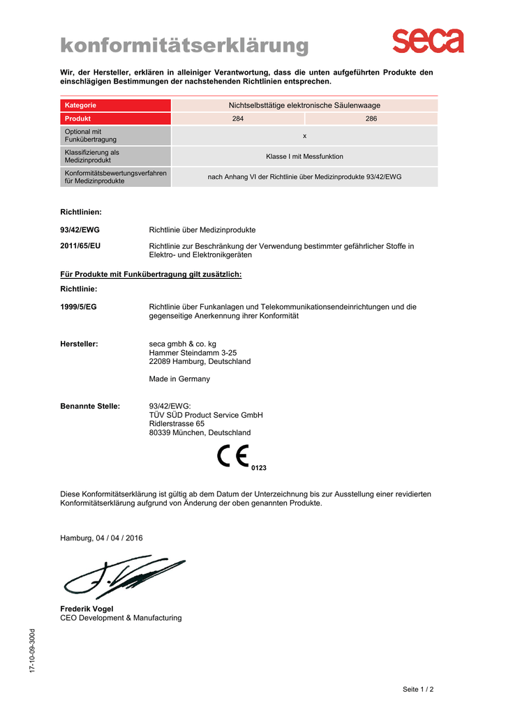 konformitätserklärung Wir, der Hersteller, erklären in alleiniger Verantwortung, dass die unten aufgeführten Produkte den einschlägigen Bestimmungen der nachstehenden Richtlinien entsprechen. Kategorie Nichtselbsttätige elektronische Säulenwaage Produkt 284 286 Optional mit Funkübertragung x Klassifizierung als Medizinprodukt Klasse I mit Messfunktion Konformitätsbewertungsverfahren für Medizinprodukte nach Anhang VI der Richtlinie über Medizinprodukte 93/42/EWG Richtlinien: 93/42/EWG Richtlinie über Medizinprodukte 2011/65/EU Richtlinie zur Beschränkung der Verwendung bestimmter gefährlicher Stoffe in Elektro- und Elektronikgeräten Für Produkte mit Funkübertragung gilt zusätzlich: Richtlinie: 1999/5/EG Richtlinie über Funkanlagen und Telekommunikationsendeinrichtungen und die gegenseitige Anerkennung ihrer Konformität Hersteller: seca gmbh & co. kg Hammer Steindamm 3-25 22089 Hamburg, Deutschland Made in Germany Benannte Stelle: 93/42/EWG: TÜV SÜD Product Service GmbH Ridlerstrasse 65 80339 München, Deutschland 0123 Diese Konformitätserklärung ist gültig ab dem Datum der Unterzeichnung bis zur Ausstellung einer revidierten Konformitätserklärung aufgrund von Änderung der oben genannten Produkte. Hamburg, 04 / 04 / 2016 17-10-09-300d Frederik Vogel CEO Development & Manufacturing Seite 1 / 2 konformitätserklärung Anhang Angewandte harmonisierte Normen, nationale Normen oder andere normativen Dokumente: EN 60601-1 Medizinische elektrische Geräte - Allgemeine Festlegungen für die Sicherheit EN 60601-1-2 Medizinische elektrische Geräte – Elektromagnetische Verträglichkeit Für Produkte mit Funkübertragung gilt zusätzlich: Angewandte harmonisierte Normen, nationale Normen oder andere normativen Dokumente: Elektromagnetische Verträglichkeit und Funkspektrumangelegenheiten (ERM) – 2,4GHz EN 301 489-1 Elektromagnetische Verträglichkeit und Funkspektrumangelegenheiten (ERM) - Gemeinsame Technische Anforderungen EN 301 489-17 Elektromagnetische Verträglichkeit und Funkspektrumangelegenheiten (ERM) - Spezifische Bedingungen für Breitband-Datenübertragungssysteme 17-10-09-300d EN 300 328 Seite 2 / 2 declaration of conformity We, the manufacturer, declare in sole responsibility that the products mentioned below are in conformity with the respective regulations of the following directives. Category Non-automatic electronic column scales Product 284 286 Optional wireless transmission x Classification medical device Conformity assessment procedure for medical devices Class I with measuring function in accordance with Annex VI of the Medical Devices Directive 93/42/EEC Directives: 93/42/EEC Directive concerning medical devices 2011/65/EU Directive on the restriction of the use of certain hazardous substances in electrical and electronic equipment The following additionally applies to products with wireless transmission: Directive: 1999/5/EC Directive on radio equipment and telecommunications terminal equipment and the mutual recognition of their conformity Manufacturer: seca gmbh & co. kg Hammer Steindamm 3-25 22089 Hamburg, Germany Made in Germany Notified Body: 93/42/EEC: TÜV SÜD Product Service GmbH Ridlerstrasse 65 80339 Munich, Germany 0123 This declaration of conformity is valid from the date of signature until a revised declaration of conformity is issued due to modification of the above-mentioned products. Hamburg, 04 / 04 / 2016 17-10-09-300d Frederik Vogel CEO Development & Manufacturing Page 1 / 2 declaration of conformity Annex Applied harmonised standards, national standards or other normative documents: EN 60601-1 Medical electrical equipment - General requirements for basic safety and essential performance EN 60601-1-2 Medical electrical equipment - Electromagnetic compatibility The following additionally applies to products with wireless transmission: Applied harmonised standards, national standards or other normative documents: Electromagnetic compatibility and Radio spectrum Matters (ERM) - 2,4GHz EN 301 489-1 Electromagnetic compatibility and Radio spectrum Matters (ERM) - Common technical requirements EN 301 489-17 Electromagnetic compatibility and Radio spectrum Matters (ERM) - Specific conditions for Broadband Data Transmission Systems 17-10-09-300d EN 300 328 Page 2 / 2 declaración de conformidad Nosotros, el fabricante, declaramos bajo nuestra responsabilidad exclusiva que los productos citados posteriormente cumplen las disposiciones pertinentes de las siguientes directivas. Categoría Pesapersonas electrónica no automática de columna Producto 284 286 Opcional con transmisión inalámbrica x Clasificación productos sanitarios Clase I con función de medición Procedimiento de evaluación de la conformidad para productos sanitarios según el Anexo VI de la Directiva 93/42/CEE sobre productos sanitarios Directivas: 93/42/CEE Directiva relativa a los productos sanitarios 2011/65/UE Directiva del consejo sobre restricciones a la utilización de determinadas sustancias peligrosas en aparatos eléctricos y electrónicos Para los productos con transmisión inalámbrica, se aplicará de forma adicional: Directiva: 1999/5/CE Directiva sobre equipos radioeléctricos y equipos terminales de telecomunicación y reconocimiento mutuo de su conformidad Fabricante: seca gmbh & co. kg Hammer Steindamm 3-25 22089 Hamburgo, Alemania Made in Germany Organismo notificado: 93/42/CEE: TÜV SÜD Product Service GmbH Ridlerstrasse 65 80339 Múnich, Alemania 0123 Esta declaración de conformidad es válida a partir de la fecha de la firma hasta la emisión de una declaración de conformidad revisada con motivo de la modificación de los productos mencionados anteriormente. Hamburgo, 04 / 04 / 2016 17-10-09-300d Frederik Vogel CEO Development & Manufacturing Página 1 / 2 declaración de conformidad Anexo Normas armonizadas aplicadas, normas nacionales y otros documentos normativos: EN 60601-1 Equipos electromédicos - Requisitos generales para la segurid