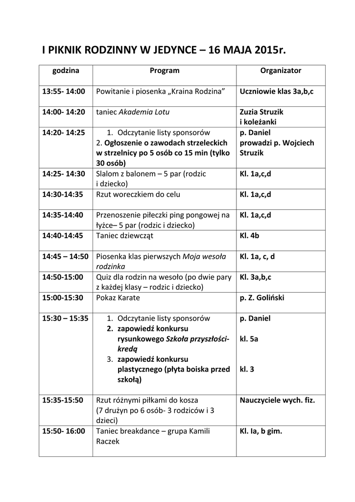 I PIKNIK RODZINNY W JEDYNCE – 16 MAJA 2015r. godzina Program Organizator 13:55- 14:00 Powitanie i piosenka „Kraina Rodzina” Uczniowie klas 3a,b,c 14:00- 14:20 taniec Akademia Lotu 14:20- 14:25 1. Odczytanie listy sponsorów 2. Ogłoszenie o zawodach strzeleckich w strzelnicy po 5 osób co 15 min (tylko 30 osób) Slalom z balonem – 5 par (rodzic i dziecko) Rzut woreczkiem do celu Zuzia Struzik i koleżanki p. Daniel prowadzi p. Wojciech Struzik 14:25- 14:30 14:30-14:35 14:35-14:40 14:40-14:45 Przenoszenie piłeczki ping pongowej na łyżce– 5 par (rodzic i dziecko) Taniec dziewcząt Kl. 1a,c,d Kl. 1a,c,d Kl. 1a,c,d Kl. 4b 14:45 – 14:50 Piosenka klas pierwszych Moja wesoła Kl. 1a, c, d rodzinka 14:50-15:00 Quiz dla rodzin na wesoło (po dwie pary Kl. 3a,b,c z każdej klasy – rodzic i dziecko) 15:00-15:30 Pokaz Karate p. Z. Goliński 15:30 – 15:35 15:35-15:50 15:50- 16:00 1. Odczytanie listy sponsorów 2. zapowiedź konkursu rysunkowego Szkoła przyszłościkredą 3. zapowiedź konkursu plastycznego (płyta boiska przed szkołą) Rzut różnymi piłkami do kosza (7 drużyn po 6 osób- 3 rodziców i 3 dzieci) Taniec breakdance – grupa Kamili Raczek p. Daniel kl. 5a kl. 3 Nauczyciele wych. fiz. Kl. Ia, b gim. 16:50- 17:10 zapowiedź pokazu wozu strażackiego- teren przed szkołą, droga pożarowa (PÓŁ GODZINY) Przeciąganie liny: 1. nauczyciele i rodzice (po 10 osób) 2. nauczyciele i uczniowie (10 naucz. I 15 uczniów) Piosenka Podajmy sobie ręce oraz piosenka Mama z córką Skakanka (rodzic, nauczyciel, uczeń, dochodzi następna trójka Bieg na trzech nogach (5 par- rodzic i dziecka) Przedstawienie klas 2a,b - Ile przygód na was zerka z tornistra dzielnego Kacperka Konkurs na dowcip o szkole (do 15 osób) Występ nauczycieli ) 17:10-17:15 Odczytanie listy sponsorów p. Daniel 17:15-17:55 LOSOWANIE LOTERII FANTOWEJ LOS 3 ZŁ ATRAKCYJNE NAGRODY KAŻDY LOS WYGRYWA! DZIĘKUJEMY ZA WSPÓLNĄ ZABAWĘ DO ZOBACZENIA ZA ROK! RADA RODZICÓW 16:00-16:10 16:10-16:15 16:15- 16:20 16:20-16:25 16:25-16:40 16:40-16:50 17:55-18:00 Nauczyciele wych. fiz. Kl. 2a,b Nauczyciele wych. fiz. Kl. 1a,c,d Kl. 2a,b Kl. 5a P. DANIEL P. M. GŁUSZEK, P. W. ŚLIWA DYR. K. ZIĘBA Rodzice wręczają nagrody uczestnikom konkursów. Cały czas trwa grillowanie, konsumpcja słodkości przygotowanych przez klasy (ciasta i ciasteczka). Są lody na patyku i soki, woda sodowa oraz grochówka i bigos! Dla najmłodszych dmuchana zjeżdżalnia.