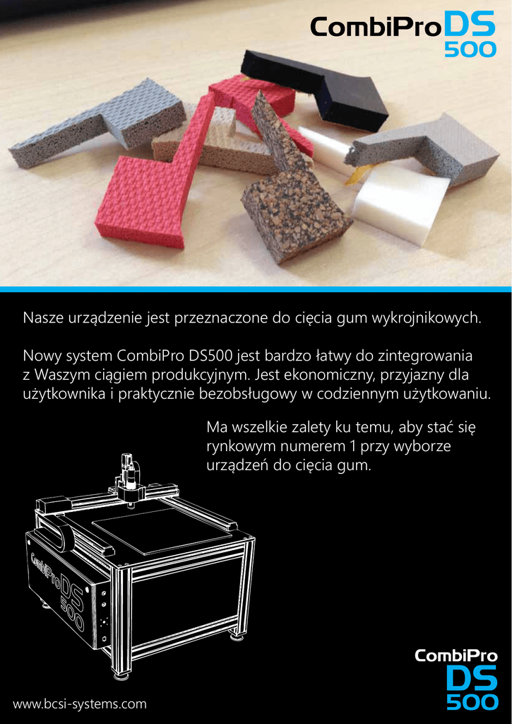 Nasze urządzenie jest przeznaczone do cięcia gum wykrojnikowych. Nowy system CombiPro DS500 jest bardzo łatwy do zintegrowania z Waszym ciągiem produkcyjnym. Jest ekonomiczny, przyjazny dla użytkownika i praktycznie bezobsługowy w codziennym użytkowaniu. Ma wszelkie zalety ku temu, aby stać się rynkowym numerem 1 przy wyborze urządzeń do cięcia gum. www.bcsi-systems.com Niewielka zajmowana przestrzeń, praktyczny obszar roboczy (550 x 550 mm), stół podciśnieniowy oraz wydajny pneumatyczny nóż oscylacyjny sprawiają, że DS500 może znaleźć swoje miejsce w każdej wykrojnikowni. Zaprojektowany z myślą o wygodzie obsługi – ergonomiczny, z dostępem ze wszystkich stron. DSystem napędu CombiPro DS500 oparty jest na układzie mocnych, bezobsługowych śrub na wszystkich osiach (X, Y, C oraz Z). Wbudowany stół komorowy z pompą podsysającą, będący podstawowym czynnikiem wpływającym na dokładność pracy pozwala na cięcie nożem oscylacyjnym bez zjawiska podnoszenia ciętego materiału przy ruchu noża w górę. Głowica narzędziowa i narzędzia robocze Wysokowydajny, napędzany sprężanym powietrzem, nóż oscylacyjny o skoku 7 mm i częstotliwości oscylacji 166 Hz pozwala na cięciegum z prędkościami, które robią wrażenie. Szybki przesuw w osi Z oraz optymalnie dobrane kształty ostrzy tnących pozwalają maksymalnie zoptymalizować process produkcyjny. www.bcsi-systems.com Próbka CombiPro DS500 www.bcsi-systems.com powered by PackDesign Urządzenie CombiPro sterowane jest z programu plikami w formacie CF2. Jeśli użytkownik nie posiada modułu do obliczania i projektowania elementów gumowych wykrojnika, wówczas możemy zaproponować moduł PackRubber, który na podstawie plików z innego programu projektowego dokona obliczenia elementów gumowych oraz optymalizacji ich rozkładu na arkuszu gumy. PackRubber jest w stanie importować pliki w wielu formatach, m.in.: PDF, EPS, CF2, DXF, DWG, DDE(S). Zawiera w sobie również bazę danych materiałowych, dla których wstępnie programuje się parametry pracy tak, aby maksymalnie usprawnić produkcję. Automatyczne rozplanowanie elementów gumy nigdy nie było tak łatwe. • Wprowadź wymiary arkusza • Wprowadź odstępy między elementami • Automatyczny podział różnych typów gum • Tworzenie rozkładu na wielu arkuszach ( jeśli zaprojektowane elementy jednego typu gumy nie mieszczą się na jednym) • Sterowanie stopniem optymalizacji ścieżki narzędzia Quick nesting, optimize in seconds! ********* Leng 19001 19001 19001 19001 19013 19013 19013 19013 Rubber Edge rubber Rubber shee th Calculation ***** PackDesi gn ************ leng => 35.06 m area => 0.0893 m² xtnt => 0.41 m x 0.49 m xarea => 0.1990 m² ==> 44.91 % leng => 7.93 m area => 0.0170 m² xtnt => 0.22 m x 0.19 m xarea => 0.0421 m² ==> 40.46 % => 42.99 m => 2.32 m t X => 662. 64 mm Y => 498.00 mm Sterowanie Sterownik PC jest dedykowany do tego typu zadania I do tego typu urządzenia. Gwarantuje optymalny przebieg procesu przy zachowaniu najwyższej jakości wykonywanych elementów. UCC - User Control Center www.bcsi-systems.com Cięcie nożem Zoptymalizowaliśmy kształt ostrzy tak, aby nacinanie było minimalne, ale pozostanie mimo wszystko i będzie widoczne. Nie wpłynie to jednak na pracę wyciętych elementów na wykrojniku. Poza tym nowy kształt naszych ostrzy pozwala “złapać” więcej materiału przy każdym ruchu. Dzięki temu efektywna prędkość procesu została znacznie zwiększona. Do cięcia bardziej skomplikowanych kształtów zalecamy nożyki o podwójnie ostrzonym ostrzu. Oferujemy szeroki wachlarz ostrzy, które można dopasować do realizacji każdej z prac. t1 (T20) 14.3 mm a b a b t3 (T22) 14 mm Nacięcie: - + Nacięcie: - + Nacięcie: - + t4 (T62) 13.2 mm t2 (T21) 17.4 mm Nacięcie: - + Uwaga: Nacięcie (X) zależy głównie od grubości materiału (T) T x Dane techniczne: Obszar pracy: Wysokość stołu: Wymiary całkowite: Wysokość ciętego materiału: Waga: 550 x 550 mm +/- 700 mm 980 x 1080 x 1050 mm Sterowanie: PC (nie jest zawarty w dostawie), Ethernet (RJ45) Nóż oscylacyjny: Osie: Prędkość wzdłuż osi: Przyspieszenie wzdłuż osi: Powtarzalność pozycjonowania: Zasilanie elektryczne: Pompa ssąca: Sprężone powietrze: Warunki otoczenia: do 40 mm, zależnie od narzędzia +/- 180 kg 1050 mm 7 mm przy 10,000 1/min (166Hz) X, Y, C oraz Z (śruby) do 30 m/min do 3 m/s² +/- 0.02 mm 230V 50-60 Hz, 16A (z pompą ssącą włącznie) 1.1 kW 80 l/min., 6 bar (kompresor nie stanowi przedmiotu dostawy) temperatura pracy +5°.. +40°C, wilgotność względna 40% - 80% 1080 mm 980 mm Zwarta konstrukcja, oszczędność miejsca. Świadectwa zgodności/zabezpieczenia: świadectwo CE, wyłącznik bezpieczeństwa Zalecane wymagania dotyczące komputera: Windows XP Professional z SP 3 (32 bit), Windows 7 Professional (32 bit), 2 GB RAM lub więcej, dysk 1 GB, 2 porty Ethernet RJ45, 2 porty USB St Janstraat 30 4741 AR Hoeven The Netherlands Tel: +31 165 505681 Fax +31 165 504923 www.bcsi-systems.com [email protected]