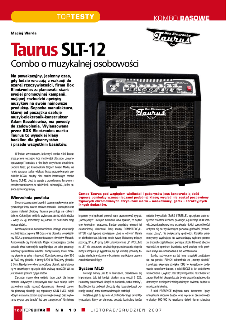 TOPTESTY KOMBO BASOWE Maciej Warda Taurus SLT-12 Combo o muzykalnej osobowości Na powakacyjny, jesienny czas, gdy ludzie wracają z wakacji do szarej rzeczywistości, firma Box Electronics zaplanowała start swojej promocyjnej kampanii, mającej rozbudzić apetyty muzyków na swoje najnowsze produkty. Sopocka manufaktura, której od początku szefuje muzyk-elektronik-konstruktor Adam Kozakiewicz, ma powody do zadowolenia. Wylansowana przez BOX Electronics marka Taurus to wysokiej klasy backline dla gitarzystów i przede wszystkim basistów. W Polsce wzmacniacze, kolumny i comba z linii Taurus znają prawie wszyscy, lecz możliwości bliższego, „organoleptycznego” kontaktu z nimi były dotychczas utrudnione. Dopiero teraz, po krakowskich targach Music Media, na rynek zaczyna trafiać większa liczba poszukiwanych produktów BOX-a, między nimi bardzo interesujące combo Taurus SLT-12. Jest to wersja z prawdziwym, lampowym przedwzmacniaczem, w odróżnieniu od wersji SL, która posiada symulację lampy. Wierzchnia powłoka Srebrno-czarny panel przedni, czarna maskownica, estetyczne logo firmy, czarne stalowe narożniki i krawędzie oraz czarny materiał obiciowy Taurusa prezentują się całkiem dobrze. Całość jest solidnie wykonana, ale też dość ciężka – waży 25 kg. Pocieszmy się jednak, że perkusiści mają jeszcze ciężej… Combo opiera się na wzmacniaczu, którego konstrukcja jest bliźniacza z głową TH Cross oraz głośniku włoskiej firmy SICA, z powodzeniem montowanym również w Mesach, Ashdownach czy Fenderach. Część wzmacniająca comba posiada dwa harmonijnie współgrające ze sobą preampy: lampowy (prawdziwa lampa!) i tranzystorowy, które możemy płynnie ze sobą miksować. Końcówka mocy daje 300 W RMS przy głośniku 4 Ohmy i 200 W RMS przy głośniku 8 Ohm. Neodymowy dwunastocalowy głośnik, zainstalowany w omawianym sprzęcie, daje wyższą moc(300 W), co jest również jednym z jego atutów. Z przodu mamy dwa wejścia typu Jack dla instrumentów aktywnych i pasywnych oraz dwie sekcje, które pozwoliłem sobie nazwać dynamiczną i korekcji barwy. Na pierwszą składają się regulatory GAIN i MIX, dzięki którym ustalamy poziom sygnału wejściowego oraz wybieramy sygnał „po lampie” lub „po tranzystorze”. Umiejętne 128 TOPGUITAR k N R 1 3 Combo Taurus pod względem wielkości i gabarytów jest konstrukcją dość typową pomiędzy wzmacniaczami podobnej klasy; wygląd nie został pozbawiony typowych chromowanych atrybutów marki – maskownicy, gałek i atrakcyjnych innych dodatków. kręcenie tymi gałkami pozwoli nam przesterować sygnał, „rozmiękczyć” i ocieplić brzmienie albo sprawić, że będzie ono konkretne i osadzone. Bardzo przydatny element tej elektronicznej układanki. Dalej mamy COMPRESOR/LIMITER, czyli typowe rozwiązanie „dwa w jednym”. Działa on dokładnie tak, jak tego sobie życzę. Ustawiony między pozycją „3” a „4” (przy GAIN ustawionym na „2” i VOLUME na „6”) nie dopuszcza do zbytniego przesterowania stopnia mocy i kompresuje sygnał tak, by był w miarę jednolity, tuszując niechciane różnice w brzmieniu, wynikające czasem z niedoskonałości gry. System MLO Korekcja barwy, jak to w Taurusach, przedstawia się imponująco. Jak już kiedyś pisałem przy okazji B 525, Holendrzy prezentowali kiedyś na boiskach „futbol totalny”, Box Electronics podkradł chyba tę ideę i zaprojektował „korekcję totalną”, teraz doprowadzoną do perfekcji. Podstawą jest tu system MLO (Middle-range Level Optymization), który po pierwsze, posiada kontrolery tonów k niskich i wysokich (BASS i TREBLE), sprzężone automatycznie z tonami średnimi; po drugie, equalizacja MLO sprawia, że zmiana barwy tonu w zakresie niskich częstotliwości odbywa się na wyrównanym poziomie głośności (wzmacniając „basy”, nie zwiększamy głośności). Korektor parametryczny, wycinający lub wzmacniający wybrane pasmo ze średnich częstotliwości pomaga z kolei filtrować zbędne wartości ze spektrum brzmienia, czyli według mnie powinien służyć do eliminowania a nie wzmacniania. Bardzo pożyteczne są też inne przyciski znajdujące się na panelu. PUNCH odpowiada za „mocny środek” i zwiększa ekspresję dźwięku. DBS to kunsztowne dodawanie rumieńców basom, z kolei BOOST to ich dodatkowe wzmocnienie i „wykop”. Bez aktywnego DBS nasz basik też zabrzmi ładnie i okrąglutko, ale by nie drażnić sąsiadów, dla domowych treningów i wielogodzinnych ćwiczeń, będzie to rozwiązanie idealne. Z kolei PRESENCE rozjaśnia nasz instrument i przy umiejętnym dodaniu basów oraz wycięciu częstotliwości w okolicy 300-400 Hz uzyskamy dzięki niemu naturalną L I S T O PA D / G R U D Z I E Ń 2 0 0 7 TOPTESTY bazę do techniki slap – graficznie przypominającą trochę głęboki „uśmieszek”. MUTE to wyciszenie sygnału na wyjściach liniowych i w głośnikach, przydatne podczas strojenia instrumentu na scenie i podczas dłuższych przerw w graniu. Panel tylni to wzór funkcjonalności. Wyjście słuchawkowe, wejście na tuner, gniazda dla podłączenie pętli efektów (zarówno szeregowo, jak i równolegle), wyjście „kanon”, aktywacja „gwizdka”, wyjście dla dodatkowej kolumny (jedna kolumna 4 Ohmy, minimum 200 W lub dwie 8 Ohm połączone równolegle o mocy min. 100 W). Dodatkowo odcięcie masy od wyjścia liniowego oraz przycisk PRE/POST, czyli wysyłka sygnału z pominięciem lub nie, sekcji korekcji barwy. Obydwa panele, pomimo mnogości funkcji, są czytelnie i zrozumiale opisane. Nic dodać, nic ująć. Dźwięki, dźwięki... Po dokładnym zaznajomieniem się z pokrętłami regulacji barwy i przyciskami filtrującymi wpiąłem aktywny basik (Warwick Thumb BO) i zagrałem nieśmiertelne, pastoriusowskie „Continuum”. Ten utwór rządzi u mnie niepodziel- nie przy testowaniu brzmienia sprzętu oraz gitar basowych. Ciepłe, mruczące dźwięki, z odpowiedni