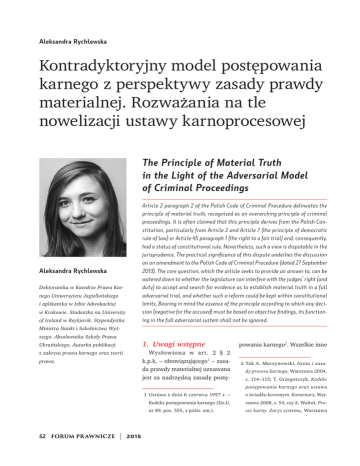 Aleksandra Rychlewska Kontradyktoryjny model postępowania karnego z perspektywy zasady prawdy materialnej. Rozważania na tle nowelizacji ustawy karnoprocesowej The Principle of Material Truth in the Light of the Adversarial Model of Criminal Proceedings Aleksandra Rychlewska Doktorantka w Katedrze Prawa Kar‑ nego Uniwersytetu Jagiellońskiego i aplikantka w Izbie Adwokackiej w Krakowie. Studentka na University of Iceland w Reykjavik. Stypendystka Article 2 paragraph 2 of the Polish Code of Criminal Procedure delineates the principle of material truth, recognized as an overarching principle of criminal proceedings. It is often claimed that this principle derives from the Polish Constitution, particularly from Article 2 and Article 7 (the principle of democratic rule of law) or Article 45 paragraph 1 (the right to a fair trial) and, consequently, had a status of constitutional rule. Nevertheless, such a view is disputable in the jurisprudence. The practical significance of this dispute underlies the discussion on an amendment to the Polish Code of Criminal Procedure (dated 27 September 2013). The core question, which the article seeks to provide an answer to, can be watered down to whether the legislature can interfere with the judges’ right (and duty) to accept and search for evidence as to establish material truth in a full adversarial trial, and whether such a reform could be kept within constitutional limits. Bearing in mind the essence of the principle according to which any decision (negative for the accused) must be based on objective findings, its functioning in the full adversarial system shall not be ignored. Ministra Nauki i Szkolnictwa Wyż‑ szego. Absolwentka Szkoły Prawa Ukraińskiego. Autorka publikacji z zakresu prawa karnego oraz teorii prawa. 1. Uwagi wstępne Wysłowiona w art. 2 § 2 k.p.k. – obowiązującego1 – zasada prawdy materialnej uznawana jest za nadrzędną zasadę postę- powania karnego2. Wszelkie inne 2 Tak A. Murzynowski, Istota i zasa‑ dy procesu karnego, Warszawa 2004, s. 114–115; T. Grzegorczyk, Kodeks postępowania karnego oraz ustawa 52 FORUM PR AWNICZE | 2015 1 Ustawa z dnia 6 czerwca 1997 r. – o świadku koronnym. Komentarz, War- Kodeks postępowania karnego (Dz.U. szawa 2008, s. 54, czy S. Waltoś, Pro‑ nr 89, poz. 555, z późn. zm.). ces karny. Zarys systemu, Warszawa artykuły zasady procesowe są jej w tym znaczeniu podporządkowane, że oparte na nich uregulowania mają umożliwiać poczynienie w sprawie prawdziwych ustaleń faktycznych, a w konsekwencji – realizację wyszczególnionych w art. 2 § 1 k.p.k. celów postępowania3. W rzeczy samej, trafna reakcja karna, czyli pociągnięcie osoby winnej do odpowiedzialności karnej i uchronienie od takiej odpowiedzialności osoby niewinnej, możliwa jest jedynie wówczas, gdy odtworzy się rzeczywisty przebieg inkryminowanego zdarzenia. Warunek ten odnosi się także do ujawnienia okoliczności sprzyjających popełnianiu przestępstw czy należytego uwzględnienia interesu osoby pokrzywdzonej. Nie budzi zarazem wątpliwości przekonanie, że dyrektywa sprawnego (szybkiego) postępowania nie 2009, s. 220. Odmiennie Z. Gostyński, S. Zabłocki (w:) Z. Gostyński, R.A. Stefański, S. Zabłocki (red.), Kodeks po‑ stępowania karnego. Komentarz, t. I, Warszawa 2003, s. 200, którzy zasadzie tej przypisują pozycję równą z innymi zasadami postępowania. Warto nadmienić, iż zasada prawdy materialnej nie została wysłowiona w sposób bezpośredni w żadnym przepisie Konstytucji RP, niemniej często spotkać się można z poglądem, iż ma ona właśnie konstytucyjne korzenie. Jako jej źródło wskazuje się zwłaszcza art. 2 w zw. z art. 7 Konstytucji RP i zasadę demokratycznego państwa prawa, oraz art. 45 ust. 1 Konstytucji RP gwarantujący prawo do sądu i uczciwego procesu. Tak TK w postanowieniu z dnia 7 marca 2011 r., P 3/09, OTK nr 2 A /2011, poz. 13. Zob. także S. Waltoś, Proces karny…, dz. cyt., s. 223; B. Nita, A. Światłowski, Kontradyktoryjny proces karny (między prawdą materialną a szybkością postępowania), „Państwo i Prawo” powinna odbić się negatywnie na prawidłowości rozstrzygnięcia4. Wchodząca w życie z dniem 1 lipca 2015 r. ustawa nowelizująca obowiązujący kodeks postępowania karnego5 nie wprowadza żadnych zmian w treści art. 2 § 2 k.p.k. Co więcej, myśl przewodnia opracowywanej reformy – przemodelowanie polskiego procesu w stronę większej kontradyktoryjności – uwzględniać ma wagę prawdy materialnej. Zgodnie ze stanowiskiem Komisji Kodyfikacyjnej Prawa Karnego to właśnie kontradyktoryjność stwarzać ma najlepsze warunki do ujawnienia tejże prawdy6. Także w literaturze przedmiotu znaleźć można opinię, iż zasada kontradyktoryjności stanowi istotny warunek osiągnięcia prawdy materialnej. Pozwala ona bowiem rozwinąć aktywność dowodową stron, która sprzyjać ma wszechstronnemu wyjaśnieniu okoliczności sprawy, wyszukiwaniu możliwych dowodów i wyczerpaniu argumentów przemawiających za i przeciw tezie oskarżenia7. W szczególności, oskarżonemu i jego obrońcy umożliwia się w ten sposób przeciwdziałanie niesłusznemu skazaniu. Z tej perspektywy kontradyktoryjność stanowi również gwarancję sprawiedliwego wyroku8. Z drugiej jednak strony podnosi się obecnie głosy, iż założenie, na którym opiera się forsowany model postępowania karnego, a mianowicie że strony samodzielnie będą dążyć do wyjawienia prawdy, gdyż leżeć to będzie w ich interesie, jest w zasadzie utopijne9. O ile kontradyktoryjność stać się może środkiem 4 Zob. wyrok TK z dnia 7 grudnia 2010 r., P 11/09, OTK nr 10A/2010, poz. 128. 2012, nr 1, s. 37; J. Grajewski, S. Steinborn (w:) Z. Sobolew- 5 Stricte ustawa z dnia 27 września 2013 r. o zmianie ustawy – ski, G. Artymiak (red.), Zasada prawdy materialnej. Materiały Kodeks postępowania karnego oraz niektórych innych ustaw z konferencji – Krasiczy
