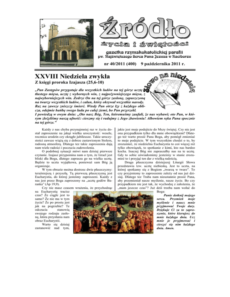 gazetka rzymskokatolickiej parafii pw. Najświętszego Serca Pana Jezusa w Raciborzu nr 40/2011 (400) 9 października 2011 r. XXVIII Niedziela zwykła Z księgi proroka Izajasza (25,6-10) „Pan Zastępów przygotuje dla wszystkich ludów na tej górze ucztę z tłustego mięsa, ucztę z wybornych win, z najpoŜywniejszego mięsa, z najwyborniejszych win. Zedrze On na tej górze zasłonę, zapuszczoną na twarzy wszystkich ludów, i całun, który okrywał wszystkie narody. Raz na zawsze zniszczy śmierć. Wtedy Pan otrze łzy z kaŜdego oblicza, odejmie hańbę swego ludu po całej ziemi, bo Pan przyrzekł. I powiedzą w owym dniu: „Oto nasz Bóg, Ten, któremuśmy zaufali, Ŝe nas wybawi; oto Pan, w którym złoŜyliśmy naszą ufność: cieszmy się i radujmy z Jego zbawienia! Albowiem ręka Pana spocznie na tej górze.” KaŜdy z nas chyba przynajmniej raz w Ŝyciu dostał zaproszenie na jakąś wielka uroczystość: wesele, rocznica urodzin czy okrągłe jubileusze. Takie uroczystości zawsze wiąŜą się z dobrze zastawionym Stolem, radosną atmosferą. Dlatego tez takie zaproszenia dają nam wiele radości i poczucia zadowolenia. O podobnej sytuacji mówi nam dzisiaj pierwsze czytanie. Izajasz przypomina nam o tym, Ŝe Izrael jest bliski dla Boga, dlatego zaprasza go na wielka ucztę. Będzie to uczta wyjątkowa, poniewaŜ sam Bóg ją organizuje. W tym obrazie moŜna dostrzec dwie płaszczyzny: teraźniejszą i przyszłą. Tą pierwszą płaszczyzną jest Eucharystia, do której jesteśmy zaproszeni. KaŜdy z nas jest przez Boga zaproszony na „ucztę godów Baranka” (Ap 19,9). Czy nie masz czasem wraŜenia, Ŝe przychodząc na Eucharystię tracisz czas? śe ciągle jest to samo? śe nie ma w tym Ŝycia? śe po prostu jest jak na pogrzebie? Te odczucia stanowią swojego rodzaju zasłonę, która przysłania nam obraz Eucharystii. Warto się dzisiaj zastanowić nad tym, jakie jest moje podejście do Mszy świętej. Czy nie jest ona przypadkiem tylko dla mnie obowiązkiem? Dlatego teŜ warto prosić Pana Boga, aby pomógł zmieniać to moje podejście. W tym wszystkim chodzi o to, by zrozumieć, Ŝe niedzielna Eucharystia to coś więcej niŜ tylko obowiązek, to spotkanie z kimś, kto nas bardzo kocha. Inaczej Bóg nie zapraszałby nas na te ucztę. Gdy to sobie uświadomimy jesteśmy w stanie zrozumieć to i przyjąć ten dar z wielką radością. Druga płaszczyzna dzisiejszej Liturgii Słowa przedstawia tzw. ucztę niebieską. Jest to uczta, na której spotkamy się z Bogiem „twarzą w twarz”. To czy przyjmiemy to zaproszenie zaleŜy od nas juŜ dzisiaj. Dlatego tez Traba nam nieustannie prosić Pana, aby przemieniał nasze myślenie, nasze Ŝycie. Bo czy przypadkiem nie jest tak, Ŝe wychodzę z załoŜenia, Ŝe „mam jeszcze czas”? JuŜ dziś trzeba nam wołać do Boga: Panie dotknij mojego serca. Przemień moje myślenie i naucz mnie przyjmować Twoje dary. Dziękuje Ci za to zaproszenie, które kierujesz do mnie kaŜdego dnia. Ucz mnie je przyjmować i cieszyć się nim kaŜdego dnia. Amen. 2 Źródło - gazetka Poniedziałek – 10 października 2011 Łk 11,29-32 630 Za †† Gerarda Zimnego w 10. r. śmierci, braci Józefa i Ernesta oraz rodziców z obu stron 700 Za †† rodziców Stanisławę i Juliana, męŜa Stefana, siostrę Marię, trzech braci, szwagra i bratową 1800 1. Do BoŜej Opatrzności w intencji Gabrieli i Gerarda w 25. rocznicę ślubu z podziękowaniem za otrzymane łaski, z prośbą o zdrowie i BoŜe błogosławieństwo w rodzinie 2. Za †† ojca Franciszka, Ŝonę Marię i Magdalenę, siostrę Helenę, †† z całej rodziny oraz dusze w czyśćcu cierpiące NaboŜeństwo róŜańcowe Wtorek – 11 października 2011 Łk 11,37-41 630 Za † Jerzego Łabuza w rocznicę urodzin, †† rodziców z obu stron 700 Z podziękowaniem za otrzymane zdrowie, z prośbą o dalsze BoŜe błogosławieństwo, potrzebne łaski i zdrowie w intencji Anny W języku niemieckim: Für †† Eltern Georg, Marta Runge, Bruder Günter und alle †† aus 800 der Verwandschaft 1800 Za †† Otylię Solich w I rocznicę śmierci, rodziców z obu stron NaboŜeństwo róŜańcowe Środa – 12 października 2011 Łk 11,42-46 630 Za †† rodziców Łucję i Karola Wallach, ojca Joachima Białdygę oraz dusze w czyśćcu 700 Za † matkę Jadwigę Kolada w rocznicę śmierci 1800 1. Z podziękowaniem za otrzymane łaski, z prośbą o dalszą opiekę BoŜą, błogosławieństwo dla całej rodziny 2. Do BoŜej Opatrzności w intencji Krzysztofa z okazji 18. rocznicy urodzin, z podziękowaniem za otrzymane łaski, z prośbą o BoŜe błogosławieństwo, zdrowie i światło Ducha Świętego na czas nauki i w dalszym Ŝyciu NaboŜeństwo róŜańcowe Czwartek – 13 października 2011 – bł. Honorata Koźmińskiego, kapłana Łk 11,47-54 630 Za †† brata Grzegorza i rodziców 700 Za †† Weronikę i Jana Szeremet, Ilinę i Jana Gorzko oraz za ich rodziców 1630 RóŜaniec dla dzieci 1800 1. Do BoŜej Opatrzności w intencji Jadwigi z okazji urodzin z podziękowaniem za otrzymane łaski, z prośbą o dalszą opiekę BoŜą i zdrowie oraz za †† rodziców i pokrewieństwo 2. Za † Krystynę Klimanek w rocznicę śmierci, †† z pokrewieństwa Wyszkoni, Klimanek, DoleŜych, Kuc, Gocman i Przybyła 3. W intencji słuchaczy, wykładowców i dobroczyńców Śląskiego Uniwersytetu Trzeciego Wieku oraz za zmarłych słuchaczy NaboŜeństwo róŜańcowe Piątek – 14 października 2011 Łk 12,1-7 630 Za †† kapłana Philippa Wollnika w 5. rocznicę śmierci, rodziców i rodzeństwo 700 Za † matkę Teresę Kuraś w 70. rocznicę urodzin i za †† z rodziny Misiarz i Kuraś oraz dusze w czyśćcu cierpiące 1800 1. Do Miłosierdzia BoŜego za †† męŜa Stanisława, rodziców Marię i Antoniego, siostrę Jadwigę i wszystkich †† z rodziny 2. Za † Jerzego Taszkę w rocznicę śmierci NaboŜeństwo róŜańcowe 1900 NaboŜeństwo dla młodzieŜy S