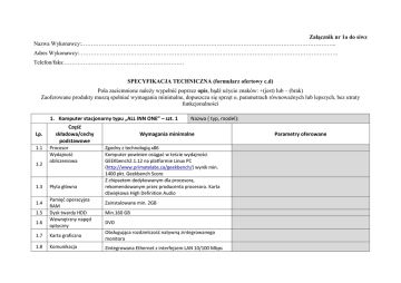 Załącznik nr 1a do siwz Nazwa Wykonawcy:…………………………………………………………………………………………………………………….. Adres Wykonawcy:………………………………………………………………………………………………………………………. Telefon/faks:……………………………………………………… SPECYFIKACJA TECHNICZNA (formularz ofertowy c.d) Pola zaciemnione należy wypełnić poprzez opis, bądź użycie znaków: +(jest) lub – (brak) Zaoferowane produkty muszą spełniać wymagania minimalne, dopuszcza się sprzęt o, parametrach równoważnych lub lepszych, bez utraty funkcjonalności Lp. 1.1 1.2 1.3 1.4 1.5 1.6 1. Komputer stacjonarny typu „ALL INN ONE” – szt. 1 Nazwa ( typ, model): Część składowa/cechy Wymagania minimalne podstawowe Procesor Wydajność obliczeniowa Płyta główna Pamięć operacyjna RAM Dysk twardy HDD Wewnętrzny napęd optyczny Zgodny z technologią x86 Komputer powinien osiągać w teście wydajności GEEKbench2.1.12 na platformie Linux PC (http://www.primatelabs.ca/geekbench/) wynik min. 1400 pkt. Geekbench Score Z chipsetem dedykowanym dla procesora, rekomendowanym przez producenta procesora. Karta dźwiękowa High Definition Audio Zainstalowane min. 2GB Min.160 GB DVD 1.7 Karta graficzna Obsługująca rozdzielczość natywną zintegrowanego monitora 1.8 Komunikacja Zintegrowana Ethernet z interfejsem LAN 10/100 Mbps Parametry oferowane 1.9 Porty we./wy (złacza zew.) 1.10 1.11 Typ obudowy Mysz 1.12 Klawiatura 1.13 System operacyjny 1.14 Wyposażenie dodatkowe 1.15 Wymagania dodatkowe 1.16 Wymagania 1.17 Certyfikaty 1.18 Zintegrowany monitor 1.19 Gwarancja 1.20 Akcesoria dodatkowe 4x USB 2.0 1xRj45 Audio –mikrofon i słuchawki Zintegrowana z monitorem Optyczna USB z rolką Klawiatura qwerty USB, standard amerykański, polska programisty brak Wbudowane głośniki podłączone do karty dźwiękowej Wbudowany czytnik kart pamięci SDHC Zintegrowana kamera instrukcja obsługi w języku polskim, nośniki instalacyjne z oprogramowaniem i sterownikami urządzeń zamontowanymi w komputerze Ustawienie w BIOS gwarantujące uruchomienie systemu z HDD napędu DVD, USB i wbudowanego czytnika kart pamięci SD Komputer powinien posiadać deklaracje zgodności z certyfikatem bezpieczeństwa CE. Do dostarczonego sprzętu mają być dostarczone : Instrukcja obsługi w języku polskim, nośniki ze sterownikami urządzeń. Wielkości minimalne: przekątna 18 cali, minimalna rozdzielczość w poziomie 1280, minimalna rozdzielczość w pionie 768 Min 1 rok producenta sprzętu 1.Przewód do sieci LAN (wtyki RJ45) 1szt. x 2 metry, 2. Karta SDHC 1 szt. pojemność 8GB class 6 ( przypadku kart microSDHC konieczny jest adapter) 3. Listwa zasilająca – min 5 gniazd z bolcem uziemiającym, filtr przepięciowy linii telefonicznej RJ11 Lp. 2. Komputer stacjonarny z monitorem – szt. 17 Nazwa ( typ, model): Część składowa/cechy Wymagania minimalne podstawowe 2.1 Procesor 2.2 Chipset 2.2 Płyta główna 2.3 Pamięć operacyjna 2.4 Dysk twardy HDD 2.5 Obudowa Procesor czterordzeniowy klasy x86 taktowany zegarem minimum 3,30 GHz, posiadający pamięć trzeciego poziomu 6 MB lub procesor osiągający w teście CPU Mark wynik min 6590 punktów – do oferty należy dołączyć wydruk ze strony http://www.cpubenchmark.net potwierdzający spełnienie wymogów siwz Rekomendowany przez producenta procesora Producenta komputera, opatrzona trwałym jego Logo z niezamazywaną informacją w BIOS zawierającą nazwę oraz nr seryjny komputera, z wbudowanym kontrolerem dysków SATA3 obsługującym konfiguracje RAID 0,1,5. Wyposażona z złącza: 2 złącza PCI-Express x 16, 1 złącze PCI-Express x 1, 3 złącza PCI 4 GB (2x2GB DDR3 SDRAM 1333MHz) – możliwość rozbudowy do 32GB, min dwa gniazda na pamięci wolne 1TB SATA III 7200rpm kompatybilny z technologią SMART II NCQ Obudowa typu Tower, metalowa, umożliwiająca pracę w pionie jak i w poziomie oraz montaż napędów zewnętrznych 5.25” w orientacji pionowej i poziomej. Opcjonalny montaż dwóch dodatkowych dysków wewnętrznych i dwóch napędów zewnętrznych 5.25”. Zaprojektowana i wykonana przez producenta komputera opatrzona trwałym logo producenta. Obudowa musi umożliwiać serwisowanie komputera bez użycia narzędzi. Z przodu obudowy wymagany jest wbudowany fabrycznie wizualny system diagnostyczny, służący do sygnalizowania i diagnozowania problemów z komputerem i jego Parametry oferowane komponentami, który musi sygnalizować co najmniej: awarie procesora lub pamięci podręcznej procesora uszkodzenie lub brak pamięci RAM, uszkodzenie złączy PCI oraz płyty głównej uszkodzenie kontrolera Video Wbudowany czujnik otwarcia obudowy oraz mechaniczne zabezpieczenie otwarcia obudowy w postaci kłódki z kluczykiem „indywidualnym” i uniwersalnym kluczykiem serwisowym tzw. „master key” lub zamka elektromagnetycznego 2.6 Karta graficzna 2.7 Karta muzyczna 2.8 Karta sieciowa 2.9 Napęd optyczny 2.10 Zintegrowane złącza wyprowadzone na zewnątrz obudowy 2.11 Mysz 2.12 Klawiatura Zintegrowana, dwumonitorowa zgodna z DirectX 10.1 i Open GL 3.0 – zintegrowane porty DisplayPort, D-Sub 15pin(VGA) Zintegrowana z płytą główną, zgodna z High Definition (HD) Audio Zintegrowana 10/100/1000, WakeOnLan Umożliwiający odczyt i zapis płyt w standardach CD, DVD – nie dopuszcza się napędów typu SLIM 2 x PS/2 2 x Serial, 10 x USB 2.0 (w tym 4 z przodu obudowy), 1 x DB-15, 1 x Display Port 1 x RJ45, 1 x wejście audio 1 x wyjście audio, 1 x wejście mikrofonowe 1 x LPT 1 x eSATA Czytnik kart multimedialnych 22-in-1 Przewodowa dwu przyciskowa z rolką podłączana do portu USB Klawiatura typu Windows pełnowymiarowa, układ typu QWERTY US, z wbudowanym czytnikiem Smart Card, przewodowa podłączana przez port USB 2.13 Zasilacz 2.14 System operacyjny 2.15. Oprogramowanie dodatkowe 2.16 Zarządzanie 