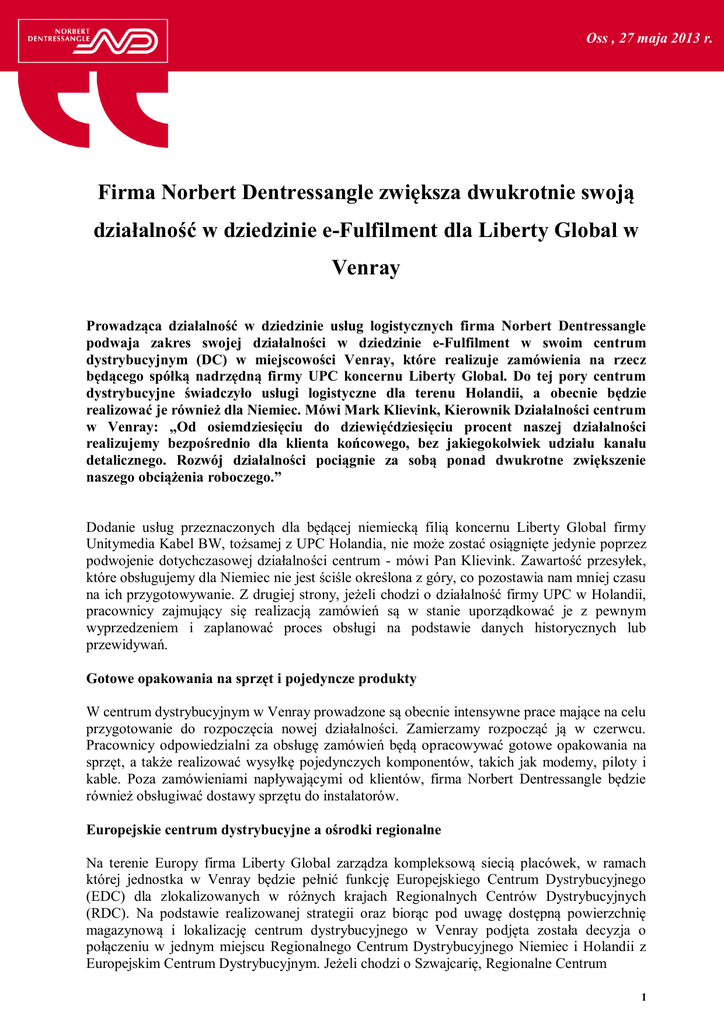 Mercredi 24 avril 2013 Oss , 27 maja 2013 r. Firma Norbert Dentressangle zwiększa dwukrotnie swoją działalność w dziedzinie e-Fulfilment dla Liberty Global w Venray Prowadząca działalność w dziedzinie usług logistycznych firma Norbert Dentressangle podwaja zakres swojej działalności w dziedzinie e-Fulfilment w swoim centrum dystrybucyjnym (DC) w miejscowości Venray, które realizuje zamówienia na rzecz będącego spółką nadrzędną firmy UPC koncernu Liberty Global. Do tej pory centrum dystrybucyjne świadczyło usługi logistyczne dla terenu Holandii, a obecnie będzie realizować je również dla Niemiec. Mówi Mark Klievink, Kierownik Działalności centrum w Venray: „Od osiemdziesięciu do dziewięćdziesięciu procent naszej działalności realizujemy bezpośrednio dla klienta końcowego, bez jakiegokolwiek udziału kanału detalicznego. Rozwój działalności pociągnie za sobą ponad dwukrotne zwiększenie naszego obciążenia roboczego.” Dodanie usług przeznaczonych dla będącej niemiecką filią koncernu Liberty Global firmy Unitymedia Kabel BW, tożsamej z UPC Holandia, nie może zostać osiągnięte jedynie poprzez podwojenie dotychczasowej działalności centrum - mówi Pan Klievink. Zawartość przesyłek, które obsługujemy dla Niemiec nie jest ściśle określona z góry, co pozostawia nam mniej czasu na ich przygotowywanie. Z drugiej strony, jeżeli chodzi o działalność firmy UPC w Holandii, pracownicy zajmujący się realizacją zamówień są w stanie uporządkować je z pewnym wyprzedzeniem i zaplanować proces obsługi na podstawie danych historycznych lub przewidywań. Gotowe opakowania na sprzęt i pojedyncze produkty W centrum dystrybucyjnym w Venray prowadzone są obecnie intensywne prace mające na celu przygotowanie do rozpoczęcia nowej działalności. Zamierzamy rozpocząć ją w czerwcu. Pracownicy odpowiedzialni za obsługę zamówień będą opracowywać gotowe opakowania na sprzęt, a także realizować wysyłkę pojedynczych komponentów, takich jak modemy, piloty i kable. Poza zamówieniami napływającymi od klientów, firma Norbert Dentressangle będzie również obsługiwać dostawy sprzętu do instalatorów. Europejskie centrum dystrybucyjne a ośrodki regionalne Na terenie Europy firma Liberty Global zarządza kompleksową siecią placówek, w ramach której jednostka w Venray będzie pełnić funkcję Europejskiego Centrum Dystrybucyjnego (EDC) dla zlokalizowanych w różnych krajach Regionalnych Centrów Dystrybucyjnych (RDC). Na podstawie realizowanej strategii oraz biorąc pod uwagę dostępną powierzchnię magazynową i lokalizację centrum dystrybucyjnego w Venray podjęta została decyzja o połączeniu w jednym miejscu Regionalnego Centrum Dystrybucyjnego Niemiec i Holandii z Europejskim Centrum Dystrybucyjnym. Jeżeli chodzi o Szwajcarię, Regionalne Centrum 1 Mercredi 24 avril 2013 Oss , 27 maja 2013 r. Dystrybucyjne zostało utworzone w tym kraju już wcześniej i jest również obsługiwane przez firmę Norbert Dentressangle. „Oczywiście poszczególne magazyny są od siebie odseparowane pod względem zarządzania. Utrzymujemy zapasy tak długo, jak tylko to możliwe w Europejskim Centrum Dystrybucyjnym i przekazujemy je do odpowiedniego Centrum Regionalnego dopiero, kiedy klient składa zamówienie. Wszystkimi tymi przepływami zarządza koncern Liberty Global” - mówi Pan Klievink. Specjalne narzędzie obsługi zamówień internetowych We współpracy z firmą Liberty Global, usługodawca logistyczny opracował specjalne narzędzie internetowe umożliwiające przyjmowanie i obsługę zamówień składanych za pośrednictwem sieci Internet. Zamówienia są składane przez klientów między innymi z firm MediaMarkt, Saturn i BCC, a następnie przekazywane detalistom za pośrednictwem internetowego narzędzia obsługi. Detalista może wówczas złożyć zamówienie dotyczące odbioru produktów z magazynu. Osobny dział zwrotów W centrum w Venray utworzony został osobny dział dla zwrotów z terenu Holandii, w których przypadku firma Norbert Dentressangle prowadzi obsługę przepływu produktów na podstawie ich numerów seryjnych. "Przeprowadzamy odbiór towarów na podstawie ich numerów seryjnych, co umożliwia firmie UPC bezbłędne śledzenie, do jakiego klienta należą." Istnieją dwa rodzaje towarów zwracanych do centrum - są to produkty wymieniane oraz naprawiane. Trzeci, zdecydowanie najmniejszy przepływ logistyczny dotyczy sprzętu zwracanego przez klientów po zakończeniu obowiązywania ich umów zawartych z Liberty Global. Duża liczba obsługiwanych przesyłek Codzienny przepływ przesyłek jest bardzo poważny - centrum obsługuje ich mniej więcej 3.000 dziennie. W chwili rozszerzenia działalności na teren Niemiec liczba obsługiwanych przesyłek wzrośnie o dalsze 3.600. W związku z powyższym, w lokalizacji przeprowadzony został program zwiększenia poziomu bezpieczeństwa do stopnia TAPA B. „Jesteśmy bardzo zadowoleni z rozszerzenia zakresu naszej działalności i zrobimy wszystko, aby obsługa nowych przesyłek została rozpoczęta jak najszybciej bez jakichkolwiek błędów.” O spółce Norbert Dentressangle Norbert Dentressangle działa na międzynarodowym rynku transportu, logistyki i przewozów towarowych. W 2012 r. obroty spółki wyniosły 3,9 mld euro. W trzech dziedzinach swojej działalności w Europie, Ameryce i Azji Norbert Dentressangle oferuje rozwiązania o wysokiej wartości dodanej. W każdym z sektorów, w których działa, dba o zrównoważony rozwój. Spółka działa w 26 krajach, zatrudnia 32 500 osób. 59% jej obrotów powstaje poza Francją. Spółka Norbert Dentressangle jest uwzględniana w indeksach CAC Small i CAC All Tradable. Jej prezesem jest Hervé Montjotin. Euronext Paryż, kategoria B. Kod GND – Isin FR0000052870 www.norbert-dentressangle.com Kontakt 2 Mercredi 24 avril 2013 Norbert Dentressangle Dyrektor ds. komunikacji Thierry LEDUC 