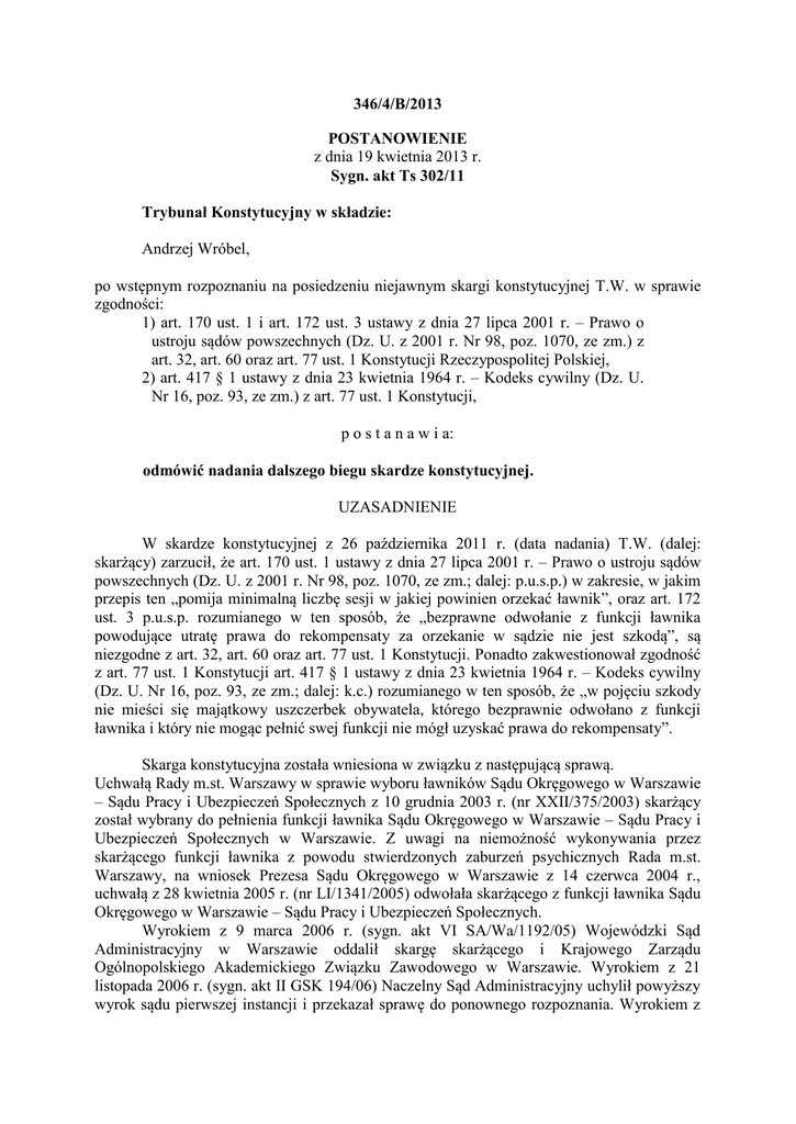 346/4/B/2013 POSTANOWIENIE z dnia 19 kwietnia 2013 r. Sygn. akt Ts 302/11 Trybunał Konstytucyjny w składzie: Andrzej Wróbel, po wstępnym rozpoznaniu na posiedzeniu niejawnym skargi konstytucyjnej T.W. w sprawie zgodności: 1) art. 170 ust. 1 i art. 172 ust. 3 ustawy z dnia 27 lipca 2001 r. – Prawo o ustroju sądów powszechnych (Dz. U. z 2001 r. Nr 98, poz. 1070, ze zm.) z art. 32, art. 60 oraz art. 77 ust. 1 Konstytucji Rzeczypospolitej Polskiej, 2) art. 417 § 1 ustawy z dnia 23 kwietnia 1964 r. – Kodeks cywilny (Dz. U. Nr 16, poz. 93, ze zm.) z art. 77 ust. 1 Konstytucji, p o s t a n a w i a: odmówić nadania dalszego biegu skardze konstytucyjnej. UZASADNIENIE W skardze konstytucyjnej z 26 października 2011 r. (data nadania) T.W. (dalej: skarżący) zarzucił, że art. 170 ust. 1 ustawy z dnia 27 lipca 2001 r. – Prawo o ustroju sądów powszechnych (Dz. U. z 2001 r. Nr 98, poz. 1070, ze zm.; dalej: p.u.s.p.) w zakresie, w jakim przepis ten „pomija minimalną liczbę sesji w jakiej powinien orzekać ławnik”, oraz art. 172 ust. 3 p.u.s.p. rozumianego w ten sposób, że „bezprawne odwołanie z funkcji ławnika powodujące utratę prawa do rekompensaty za orzekanie w sądzie nie jest szkodą”, są niezgodne z art. 32, art. 60 oraz art. 77 ust. 1 Konstytucji. Ponadto zakwestionował zgodność z art. 77 ust. 1 Konstytucji art. 417 § 1 ustawy z dnia 23 kwietnia 1964 r. – Kodeks cywilny (Dz. U. Nr 16, poz. 93, ze zm.; dalej: k.c.) rozumianego w ten sposób, że „w pojęciu szkody nie mieści się majątkowy uszczerbek obywatela, którego bezprawnie odwołano z funkcji ławnika i który nie mogąc pełnić swej funkcji nie mógł uzyskać prawa do rekompensaty”. Skarga konstytucyjna została wniesiona w związku z następującą sprawą. Uchwałą Rady m.st. Warszawy w sprawie wyboru ławników Sądu Okręgowego w Warszawie – Sądu Pracy i Ubezpieczeń Społecznych z 10 grudnia 2003 r. (nr XXII/375/2003) skarżący został wybrany do pełnienia funkcji ławnika Sądu Okręgowego w Warszawie – Sądu Pracy i Ubezpieczeń Społecznych w Warszawie. Z uwagi na niemożność wykonywania przez skarżącego funkcji ławnika z powodu stwierdzonych zaburzeń psychicznych Rada m.st. Warszawy, na wniosek Prezesa Sądu Okręgowego w Warszawie z 14 czerwca 2004 r., uchwałą z 28 kwietnia 2005 r. (nr LI/1341/2005) odwołała skarżącego z funkcji ławnika Sądu Okręgowego w Warszawie – Sądu Pracy i Ubezpieczeń Społecznych. Wyrokiem z 9 marca 2006 r. (sygn. akt VI SA/Wa/1192/05) Wojewódzki Sąd Administracyjny w Warszawie oddalił skargę skarżącego i Krajowego Zarządu Ogólnopolskiego Akademickiego Związku Zawodowego w Warszawie. Wyrokiem z 21 listopada 2006 r. (sygn. akt II GSK 194/06) Naczelny Sąd Administracyjny uchylił powyższy wyrok sądu pierwszej instancji i przekazał sprawę do ponownego rozpoznania. Wyrokiem z 17 kwietnia 2007 r. (sygn. akt VI SA/Wa/241/07) Wojewódzki Sąd Administracyjny uchylił uchwałę Rady m.st. Warszawy z 28 kwietnia 2008 r. w sprawie odwołania skarżącego z funkcji ławnika Sądu Okręgowego – Sądu Pracy i Ubezpieczeń Społecznych w Warszawie. Orzeczeniem z 27 września 2007 r. Naczelny Sąd Administracyjny oddalił skargę Rady m.st. Warszawy od wyroku WSA. W związku z zakończonym postępowaniem skarżący 4 marca 2010 r., wniósł pozew o zasądzenie od m.st. Warszawy kwoty 1 749,00 zł wraz z odsetkami ustawowymi od 28 kwietnia 2005 r. do dnia zapłaty. W uzasadnieniu wskazał, że powyższej kwoty dochodzi tytułem odszkodowania za bezprawne odwołanie z funkcji ławnika sądowego w dniu 8 kwietnia 2005 r., jako rekompensatę za udział w 33 sesjach sądowych od kwietnia 2005 r. do grudnia 2007 r. Wyrokiem z 4 października 2010 r. (sygn. akt VI C 285/10) Sąd Rejonowy dla Warszawy-Śródmieścia w Warszawie – Wydział VI Cywilny oddalił powództwo skarżącego. Wyrokiem z 16 maja 2011 r. (sygn. akt V Ca 379/11) Sąd Okręgowy w Warszawie – V Wydział Cywilny – Odwoławczy oddalił apelację. Wyrok sądu okręgowego, wskazany jako ostateczne orzeczenie w rozumieniu art. 79 ust. 1 Konstytucji, został doręczony skarżącemu wraz z uzasadnieniem 18 sierpnia 2011 r. Skarżący twierdzi, że wydane na podstawie zakwestionowanych w skardze przepisów orzeczenie pozbawia go prawa do odszkodowania za utratę możliwości orzekania oraz możliwości uzyskania rekompensaty za szkodę wywołaną niezgodnym z prawem działaniem organu władzy publicznej (odwołanie z funkcji ławnika). Uzasadniając zarzuty, skarżący wskazał, że art. 170 p.u.s.p. przez to, że nie określa minimalnej liczby sesji, jaką powinien odpracować ławnik, narusza zasadę równości wobec prawa oraz dostępu do służby publicznej na jednakowych zasadach. Godzi także w „rekompensaty ławnicze” utracone w wyniku niezgodnego z prawem odwołania. W odniesieniu do art. 172 ust. 3 p.u.s.p. i art. 417 k.c. skarżący wniósł o wydanie wyroku interpretacyjnego. Jego zdaniem przepisy te są rozumiane zbyt wąsko, co narusza art. 77 ust. 1 Konstytucji. Zdaniem skarżącego interpretacja art. 172 ust. 3 p.u.s.p. narusza również art. 32 i art. 60 Konstytucji, ponieważ różnicuje sytuację ławników. Jak stwierdził: „nie do przyjęcia jest zasada w myśl której jedni ławnicy będą orzekać kilkadziesiąt razy w ciągu roku i uzyskiwać quasi dochód, natomiast inni będą tego całkowicie pozbawieni (0 sesji w ciągu roku)”. Uzasadnienie powyższych zarzutów w znacznym stopniu zostało odniesione do okoliczności konkretnej sprawy skarżącego, w związku z którą została wniesiona skarga konstytucyjna. Trybunał Konstytucyjny zważył, co następuje: Skarga konstytucyjna jest sformalizowanym środkiem ochrony konstytucyjnych wolności i praw. Aby można ją było przekazać do merytorycznego rozpoznania, musi ona spełniać przesłanki wynikające zarówno z art. 79 ust. 1 Konstytucji, jak i art. 46-47 ustawy z dnia 1 sierpn