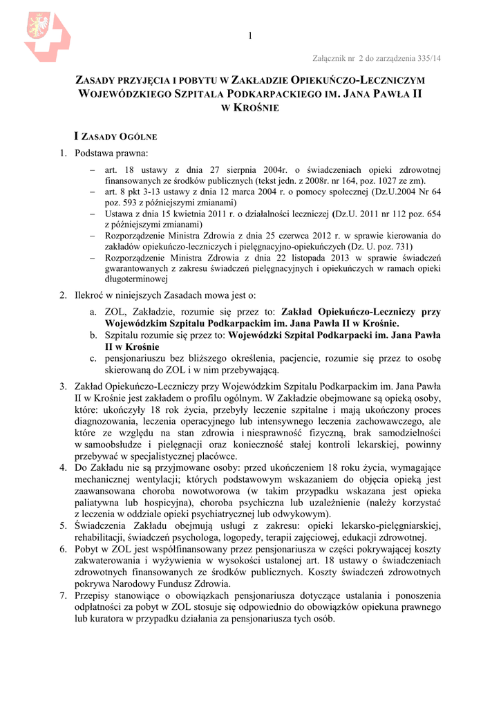 1 Załącznik nr 2 do zarządzenia 335/14 ZASADY PRZYJĘCIA I POBYTU W ZAKŁADZIE OPIEKUŃCZO-LECZNICZYM WOJEWÓDZKIEGO SZPITALA PODKARPACKIEGO IM . JANA PAWŁA II W K ROŚNIE I ZASADY OGÓLNE 1. Podstawa prawna: art. 18 ustawy z dnia 27 sierpnia 2004r. o świadczeniach opieki zdrowotnej finansowanych ze środków publicznych (tekst jedn. z 2008r. nr 164, poz. 1027 ze zm). art. 8 pkt 3-13 ustawy z dnia 12 marca 2004 r. o pomocy społecznej (Dz.U.2004 Nr 64 poz. 593 z późniejszymi zmianami) Ustawa z dnia 15 kwietnia 2011 r. o działalności leczniczej (Dz.U. 2011 nr 112 poz. 654 z późniejszymi zmianami) Rozporządzenie Ministra Zdrowia z dnia 25 czerwca 2012 r. w sprawie kierowania do zakładów opiekuńczo-leczniczych i pielęgnacyjno-opiekuńczych (Dz. U. poz. 731) Rozporządzenie Ministra Zdrowia z dnia 22 listopada 2013 w sprawie świadczeń gwarantowanych z zakresu świadczeń pielęgnacyjnych i opiekuńczych w ramach opieki długoterminowej 2. Ilekroć w niniejszych Zasadach mowa jest o: a. ZOL, Zakładzie, rozumie się przez to: Zakład Opiekuńczo-Leczniczy przy Wojewódzkim Szpitalu Podkarpackim im. Jana Pawła II w Krośnie. b. Szpitalu rozumie się przez to: Wojewódzki Szpital Podkarpacki im. Jana Pawła II w Krośnie c. pensjonariuszu bez bliższego określenia, pacjencie, rozumie się przez to osobę skierowaną do ZOL i w nim przebywającą. 3. Zakład Opiekuńczo-Leczniczy przy Wojewódzkim Szpitalu Podkarpackim im. Jana Pawła II w Krośnie jest zakładem o profilu ogólnym. W Zakładzie obejmowane są opieką osoby, które: ukończyły 18 rok życia, przebyły leczenie szpitalne i mają ukończony proces diagnozowania, leczenia operacyjnego lub intensywnego leczenia zachowawczego, ale które ze względu na stan zdrowia i niesprawność fizyczną, brak samodzielności w samoobsłudze i pielęgnacji oraz konieczność stałej kontroli lekarskiej, powinny przebywać w specjalistycznej placówce. 4. Do Zakładu nie są przyjmowane osoby: przed ukończeniem 18 roku życia, wymagające mechanicznej wentylacji; których podstawowym wskazaniem do objęcia opieką jest zaawansowana choroba nowotworowa (w takim przypadku wskazana jest opieka paliatywna lub hospicyjna), choroba psychiczna lub uzależnienie (należy korzystać z leczenia w oddziale opieki psychiatrycznej lub odwykowym). 5. Świadczenia Zakładu obejmują usługi z zakresu: opieki lekarsko-pielęgniarskiej, rehabilitacji, świadczeń psychologa, logopedy, terapii zajęciowej, edukacji zdrowotnej. 6. Pobyt w ZOL jest współfinansowany przez pensjonariusza w części pokrywającej koszty zakwaterowania i wyżywienia w wysokości ustalonej art. 18 ustawy o świadczeniach zdrowotnych finansowanych ze środków publicznych. Koszty świadczeń zdrowotnych pokrywa Narodowy Fundusz Zdrowia. 7. Przepisy stanowiące o obowiązkach pensjonariusza dotyczące ustalania i ponoszenia odpłatności za pobyt w ZOL stosuje się odpowiednio do obowiązków opiekuna prawnego lub kuratora w przypadku działania za pensjonariusza tych osób. 2 8. Przepisy niniejszych Zasad mają zastosowanie również do pensjonariuszy przebywających w ZOL w dniu ich wejścia w życie, w szczególności dotyczy to obowiązku zawarcia umowy na ponoszenie odpłatności. II ZASADY PRZYJĘCIA DO ZOL 9. Do Zakładu Opiekuńczo-Leczniczego Wojewódzkiego Szpitala Podkarpackiego im. Jana Pawła II w Krośnie (ZOL) mogą być przyjęte osoby, które w klasyfikacyjnej Skali Barthel nie przekraczają 40 punktów. 10. Podstawą przyjęcia jest skierowanie wydawane przez lekarza ubezpieczenia zdrowotnego. Wzór skierowania jest zamieszczony na stronie internetowej Szpitala w zakładce „Zakład Opiekuńczo-Leczniczy” 11. Do skierowania dołącza się; Wniosek o wydanie skierowania; Zaświadczenie lekarza psychiatry o braku przeciwwskazań do pobytu w ZOL o profilu ogólnym – dotyczy chorych z zaburzeniami psychicznymi; Wywiad pielęgniarski; Kartę Oceny Świadczeniobiorcy wg. Skali Barthel; Zgody i informacje; Kopie postanowień Sądu: o ubezwłasnowolnieniu, o ustanowieniu opiekuna prawnego / kuratora dla osoby niepełnosprawnej – dotyczy osoby niezdolnej do świadomego decydowania o sobie; Kopie dokumentów potwierdzających wysokość dochodów (wg zasad ujętych w ust. 20); Umowa i Oświadczenie woli dotyczące sposobu regulowania opłat za pobyt pensjonariusza w ZOL Wzory dokumentów są zamieszczone na stronie internetowej Szpitala w zakładce „Zakład Opiekuńczo-Leczniczy” 12. Z wnioskiem o przyjęcie do ZOL może wystąpić pensjonariusz lub jego opiekun prawny 13. W przypadku, gdy stan zdrowia osoby ubiegającej się o przyjęcie do ZOL nie pozwala na świadome podjęcie decyzji o ubieganiu się o przyjęcie, a wnioskodawca nie posiada opiekuna prawnego, zgodę na umieszczenie w placówce może wyrazić Sąd Rejonowy, właściwy dla miejsca zamieszkania 14. Umieszczenie w kolejce osób oczekujących na przyjęcie jest potwierdzany w formie pisemnej, na adres pensjonariusza/ jego opiekuna prawnego/ osoby upoważnionej przez pacjenta do kontaktów z Zakładem. 15. Termin przyjęcia wyznaczany jest w zależności od liczby wolnych miejsc, zgodnie z kolejką osób oczekujących. 16. W przypadkach nagłych, wynikających ze zdarzeń losowych, uzasadnionych stanem zdrowia, na wniosek ordynatora oddziału Wojewódzkiego Szpitala Podkarpackiego im. Jana Pawła II w Krośnie, w którym przebywa pacjent, istnieje możliwość skierowania do ZOL w trybie pilnym. 17. Przyjęcie w trybie pilnym oznacza: - przyjęcie pacjenta w przypadku nie planowanego zwolnienia się miejsca w ZOL, - przyjęcie pacjenta naprzemiennie, tzn.: jednej osoby z kolejki osób oczekujących w trybie zwykłym i jednej osoby z kolejki w trybie pilnym. 18. Osoba ustanowiona przez pacjenta do kontaktu z ZOL jest zobowiązana do poinformowania Zakładu o rezygnacji z ubiegania się o przyjęcie pacjenta do ZOL bez względu na powód rezygnacji. W przypadku rezygnacji z proponowane