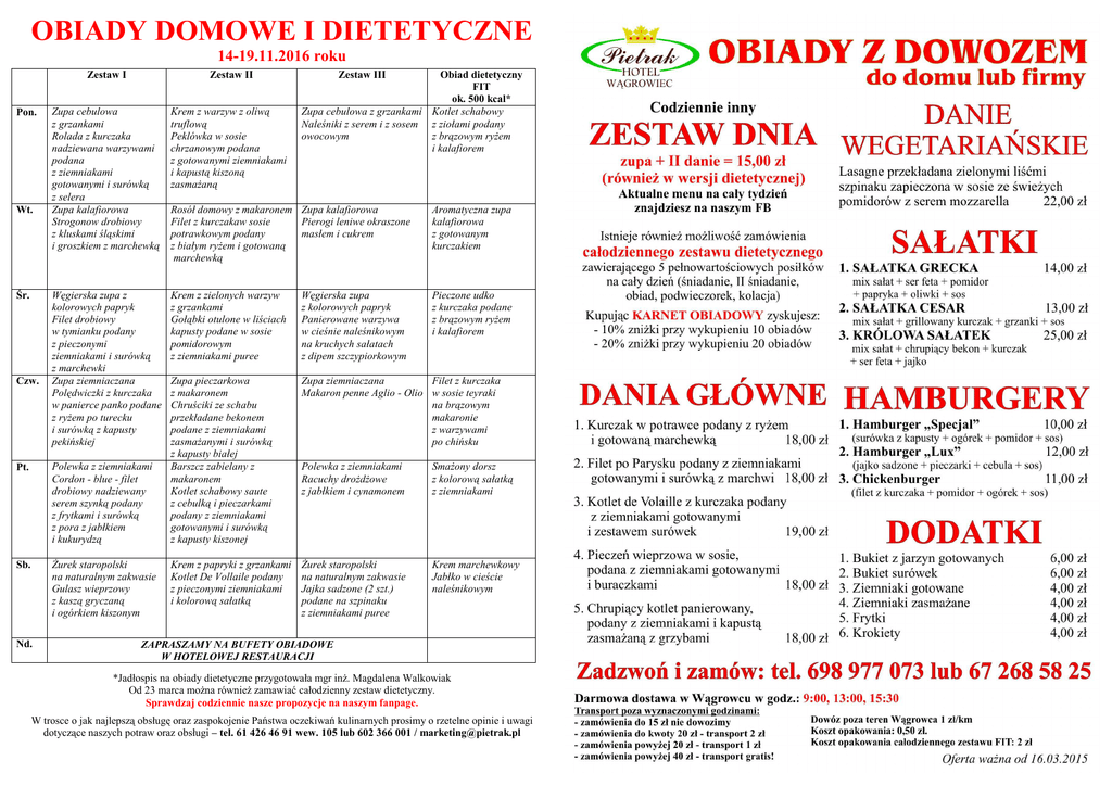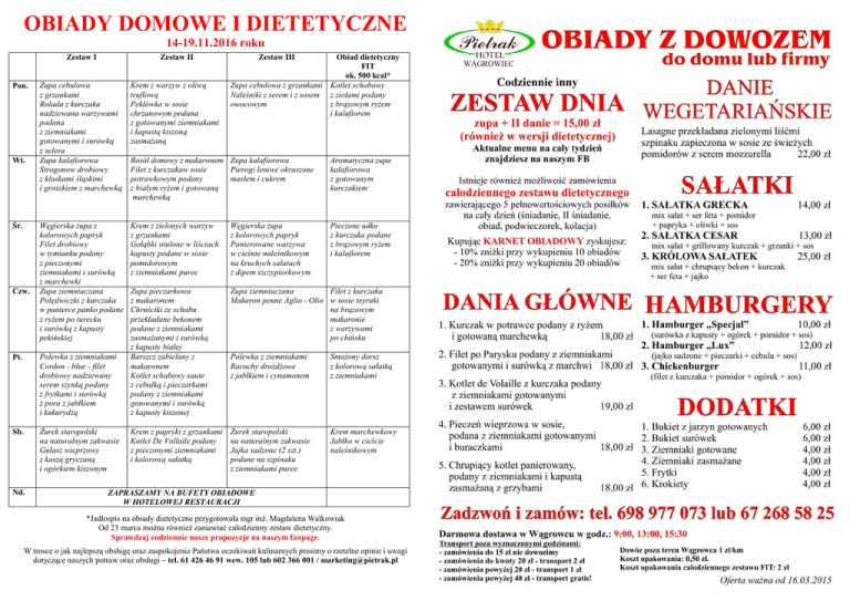 OBIADY DOMOWE I DIETETYCZNE 14-19.11.2016 roku Pon. Wt. Śr. Czw. Zestaw I Zestaw II Zupa cebulowa z grzankami Rolada z kurczaka nadziewana warzywami podana z ziemniakami gotowanymi i surówką z selera Zupa kalafiorowa Strogonow drobiowy z kluskami śląskimi i groszkiem z marchewką Krem z warzyw z oliwą truflową Peklówka w sosie chrzanowym podana z gotowanymi ziemniakami i kapustą kiszoną zasmaŜaną Rosół domowy z makaronem Zupa kalafiorowa Filet z kurczakaw sosie Pierogi leniwe okraszone masłem i cukrem potrawkowym podany z białym ryŜem i gotowaną marchewką Aromatyczna zupa kalafiorowa z gotowanym kurczakiem Węgierska zupa z kolorowych papryk Filet drobiowy w tymianku podany z pieczonymi ziemniakami i surówką z marchewki Zupa ziemniaczana Polędwiczki z kurczaka w panierce panko podane z ryŜem po turecku i surówką z kapusty pekińskiej Krem z zielonych warzyw z grzankami Gołąbki otulone w liściach kapusty podane w sosie pomidorowym z ziemniakami puree Węgierska zupa z kolorowych papryk Panierowane warzywa w cieśnie naleśnikowym na kruchych sałatach z dipem szczypiorkowym Pieczone udko z kurczaka podane z brązowym ryŜem i kalafiorem Zupa pieczarkowa z makaronem Chruściki ze schabu przekładane bekonem podane z ziemniakami zasmaŜanymi i surówką z kapusty białej Barszcz zabielany z makaronem Kotlet schabowy saute z cebulką i pieczarkami podany z ziemniakami gotowanymi i surówką z kapusty kiszonej Zupa ziemniaczana Filet z kurczaka Makaron penne Aglio - Olio w sosie teyraki na brązowym makaronie z warzywami po chińsku Polewka z ziemniakami Racuchy droŜdŜowe z jabłkiem i cynamonem SmaŜony dorsz z kolorową sałatką z ziemniakami Krem z papryki z grzankami Kotlet De Vollaile podany z pieczonymi ziemniakami i kolorową sałatką śurek staropolski na naturalnym zakwasie Jajka sadzone (2 szt.) podane na szpinaku z ziemniakami puree Krem marchewkowy Jabłko w cieście naleśnikowym Pt. Polewka z ziemniakami Cordon - blue - filet drobiowy nadziewany serem szynką podany z frytkami i surówką z pora z jabłkiem i kukurydzą Sb. śurek staropolski na naturalnym zakwasie Gulasz wieprzowy z kaszą gryczaną i ogórkiem kiszonym Nd. Zestaw III Obiad dietetyczny FIT ok. 500 kcal* Zupa cebulowa z grzankami Kotlet schabowy Naleśniki z serem i z sosem z ziołami podany owocowym z brązowym ryŜem i kalafiorem ZAPRASZAMY NA BUFETY OBIADOWE W HOTELOWEJ RESTAURACJI *Jadłospis na obiady dietetyczne przygotowała mgr inŜ. Magdalena Walkowiak Od 23 marca moŜna równieŜ zamawiać całodzienny zestaw dietetyczny. Sprawdzaj codziennie nasze propozycje na naszym fanpage. W trosce o jak najlepszą obsługę oraz zaspokojenie Państwa oczekiwań kulinarnych prosimy o rzetelne opinie i uwagi dotyczące naszych potraw oraz obsługi – tel. 61 426 46 91 wew. 105 lub 602 366 001 / [email protected]