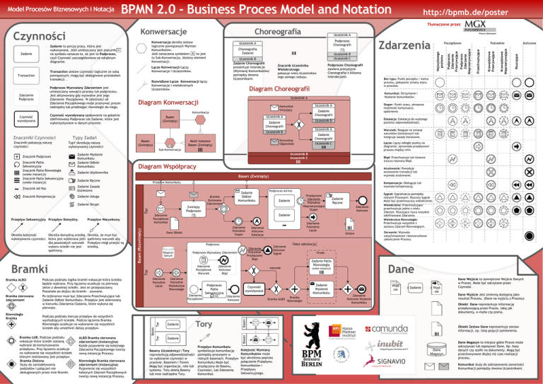 Model Procesów Biznesowych i Notacja BPMN 2.0 - Business Proces Model and Notation http://bpmb.de/poster Tłumaczone przez Podproces Wyzwalany Zdarzeniem jest umieszczany wewątrz procesu lub podprocesu . Jest aktywowany gdy wyzwalne jest jego Zdarzenie Początkowe. W zależności od Zdarzenia Początkowego może przerywać proces nadrzędny lub przebiegać równolegle do niego. Zdarzenie Podproces Rozwidlone Łącze Konwersacji łączy Konwersacje i wielokrotnych Uczestników. Czynność wywoływana pokazuje wielu Uczestników tego samego rodzaju. Diagram Choreografii Komunikat Inicjujący Komunikacja Uczestnik A Basen (Zwinięty) Zadanie Choreografii Zadanie Choreografii Uczestnik B Uczestnik B Uczestnik A TypY określają naturę wykonywanej czynności: Znacznik Podproces ~ Znacznik Pętla Sekwencyjna Znacznik Pętla Równoległa (wiele instancji) Znacznik Pętla Sekwencyjna (wiele instancji) Znacznik Ad Hoc Znacznik Kompensacja Zadanie Wysłanie Komunikatu Zadanie Odbiór Komunikatu Basen (Zwinięty) Uczestnik B Uczestnik C Przepływ Komunikatu Tor Zadanie Skrypt Bramka LUB. Podczas podziału wskazuje które ścieżki zostaną wybrane do kontynuowania przepływu. Przy łączeniu oczekuje na wykonanie się wszystkich ścieżek którymi realizowany jest przepływ. Bramka Złożona Służy do zamodelowania podziałów i połączeń nie obsługiwanych przez inne Bramki. ALBO Bramka sterowana zdarzeniami (instancyjna) Każde pojawienie się kolejnego Zdarzenia Początkowego tworzy nową instancję Procesu. Równoległa Bramka sterowana zdarzeniami (instancyjna) Pojawienie się wszystkich kolejnych Zdarzeń Początkowych tworzy nową instancję Procesu. ~ Zdarzenie Końcowe Eskalacja ` Magazyn Danych Zdarzenie Pośrednie Wielokrotne Równoległe Zdarzenie Początkowe Zadanie Zadanie Zdarzenie Końcowe Błąd Podproces Pętla Sekwencyjna Zdarzenie Końcowe Sygnał Zdarzenie Pośrednie Przyłączone Błąd Podproces Wyzwalany Zdarzeniem Zdarzenie Początkowe Warunek Zdarzenie Pośrednie Łącze Przyłączone Zdarzenie Pośrednie Nieprzerywające Stoper Zadanie Podproces Tor Podczas podziału kieruje przepływ do wszystkich wychodzących ścieżek. Podcza łączenia Bramka Równoległa oczekuje na wykonanie się wszystkich ścieżek aby umożliwić dalszy przepływ. Zdarzenie Pośrednie Stoper Dane Obiekt Tor Równoległa Bramka Bramka Sterowana Zdarzeniami Zadanie Ręczne Zdarzenie Końcowe Zadanie Tor Bramka sterowana zdarzeniami Podczas podziału logika bramki wskazuje która ścieżka będzie wybrana. Przy łączeniu oczekuje na pierwszy żeton z dowolnej ścieżki. Jest on przepuszczany. Pozostałe po dojścu do bramki – usuwane. Po tejbramce musi być Zdarzenia Przechwytujące lub Zadanie Odbiór Komunikatu. Przepływ jest skierowany w kierunku Zdarzenia/Zadania, które wykona się pierwsze. Podproces Ad-hoc Zadanie Odbiór Komunikatu Zdarzenie Początkowe Komunikat Basen (Rozwinięty) Przepływ Warunkowy Zwinięty Podproces Basen Bramka ALBO Rzucające Kompensacja: Obsługuje lub wyzwala kompensację. Zadanie Usługa Bramki Anulowanie: Powoduje anulowanie transakcji lub wyzwala anulowanie. Basen (Zwinięty) Zadanie Zasada biznesowa Określa, że musi być spełniony warunek aby Przepływ mógł przejść tą ścieżką. Błąd: Przechwytuje lub Ustawia (rzuca) nazwany Błąd. Diagram Współpracy Zadanie Ręczne Określa domyślną scieżkę, Określa kolejność wykonywania czynności. która jest wybierana jeśli dla pozostałych warunek wyboru ścieżki nie jest spełniony. Łącze: Łączy odległe punkty na diagramie, oprowiada przepływowi procesu między nimi. Sub-Konwersacja Zadanie Użytkownika Przepływ Sekwencyjny Przepływ Domyślny Zadanie Choreografii Uczestnik C Komunikat Odpowiedź Multi Instance Basen (Zwinięty) Warunek: Reaguje na zmianę warunków biznesowych lub integruje zasady biznesowe. Zdarzenie Pośrednie Łącze Grupa Zadanie Pętla Równoległa Tory Przepływ Komunikatu Baseny (Uczestnicy) i Tory symbolizuje komunikację reprezentują odpowedzialności pomiędzy procesami w za wykonanie czynności w różnych basenach. Przepływ procesie. Basenem i Torem Komunikatu Może być Mogą być organizacje, role lub przyłączony do Basenu, systemy. Tory dzielą Baseny Czynności, lub Zdarzenia lub inne nadrzędne Tory. Komunikat. Dane (wiele instancji) Zadanie Wysłanie Komunikatu Czynność wywoływana Bramka ALBO Zerwanie: Wyzwala natychmiastowe i bezwarunkowe zakończenie Procesu. Tekst Adnotacja warunek Zdarzenie Końcowe Zestaw Sygnał: Sygnalizacja pomiędzy różnymi Procesami. Rzucony Sygnał Może być przechwycony wielokrotnie. Wielokrotne: Przechwytujące przechwytuje jedno z wielu Zdarzeń. Rzucające rzuca wszyskie zdefiniowane Zdarzenia Wielokrotne Równoległe: Przechwytuje wszystkie z zestawu Zdarzeń Równoległych. Bramka Równoległa Wejś cie Zadanie Wyjś cie Zdarzenie Końcowe Wysłanie Komunikatu Kolejność Wymiany Komunikatów może być określona poprzez połączenie Przepływu Komunikatów i Przepływu Sekwencyjnego. Dane Wejście to zewnętrzne Wejście Danych w Proces. Może być odczytane przez Czynność. Dane Wyjście Jest zmienną dostępną jako rezultat Procesu. (Dane na wyjściu z Procesu) Obiekt Dane reprezentuje informację przepływającą przez Proces, taką jak dokumenty, e-maile czy pisma. Basen Znaczniki pokazują naturę czynności: Typy Zadań Eskalacja: Eskalacja do wyższego poziomu odpowiedzialności. Obiekt Zestaw Dane reprezentuje zestaw informacji, np. listę pozycji zamówienia. Basen ZnacznikI Czynności Bez typu: Punkt początku / końca procesu, pokazanie zmiany stanu w procesie. Stoper: Punkt czasu, okresowa możliwość kontynuacji, opóźnienie. Uczestnik A Uczestnik B Końcowe Komunikat: Otrzymanie i Wysłanie komunikatów. Uczestnik A Diagram Konwersacji Czynność wywoływana opakowanie na gobalnie zdefiniowany Podproces lub Zadanie, które jest wykorzystywane w danym procesie. Podproces Choreografii 
