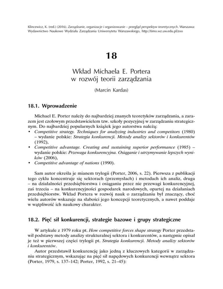 Klincewicz, K. (red.) (2016). Zarządzanie, organizacje i organizowanie – przegląd perspektyw teoretycznych. Warszawa: Wydawnictwo Naukowe Wydziału Zarządzania Uniwersytetu Warszawskiego, http://timo.wz.uw.edu.pl/zoo 18 Wkład Michaela E. Portera w rozwój teorii zarządzania (Marcin Kardas) 18.1. Wprowadzenie Michael E. Porter należy do najbardziej znanych teoretyków zarządzania, a zarazem jest czołowym przedstawicielem tzw. szkoły pozycyjnej w zarządzaniu strategicznym. Do najbardziej popularnych książek jego autorstwa należą: • Competitive strategy. Techniques for analyzing industries and competitors (1980) – wydanie polskie: Strategia konkurencji. Metody analizy sektorów i konkurentów (1992), • Competitive advantage. Creating and sustaining superior performance (1985) – wydanie polskie: Przewaga konkurencyjna. Osiąganie i utrzymywanie lepszych wyników (2006), • Competitive advantage of nations (1990). Sam autor określa je mianem trylogii (Porter, 2006, s. 22). Pierwsza z publikacji tego cyklu koncentruje się sektorach (przemysłach) i metodach ich analiz, druga – na działalności przedsiębiorstwa i osiąganiu przez nie przewagi konkurencyjnej, zaś trzecia – na konkurencyjności gospodarek narodowych, opartej na działaniach przedsiębiorstw. Wkład Portera w rozwój nauk o zarządzaniu był znaczący, choć wielu autorów wskazuje na słabości jego koncepcji teoretycznych, a nawet poddaje w wątpliwość ich naukowy charakter. 18.2. Pięć sił konkurencji, strategie bazowe i grupy strategiczne W artykule z 1979 roku pt. How competitive forces shape strategy Porter przedstawił podstawy metody analizy strukturalnej sektora i konkurentów, a następnie opisał je też w pierwszej części trylogii pt. Strategia konkurencji. Metody analizy sektorów i konkurentów. Autor przedstawił konkurencję jako jedną z kluczowych kategorii w zarządzaniu strategicznym, wskazując na pięć sił napędowych konkurencji wewnątrz sektora (Porter, 1979, s. 137–142; Porter, 1992, s. 21–45): 272 III. EKONOMICZNE INSPIRACJE W ZARZĄDZANIU 1) groźba nowych wejść (potencjalnych, nowych konkurentów), która zależy od barier wejścia do sektora, takich jak: efekty skali, zróżnicowanie produktów, wymagania kapitałowe, dostęp do kanałów dystrybucji, struktura kosztowa działalności, polityka rządu, spodziewane działania odwetowe obecnych konkurentów czy aktualny poziom cen; 2) siła przetargowa nabywców, uzależniona od: koncentracji nabywców, udziału zamówień nabywców w całości sprzedaży przedsiębiorstwa lub całkowitych wydatkach nabywców, standaryzacji produktów, kosztów zmiany dostawcy, poziomu zyskowności nabywców, ryzyka integracji wstecznej (ang. backward integration), czyli przejęciu firm-dostawców przez nabywcę, znaczenia wyrobu dla jakości produktów lub usług oferowanych przez nabywcę oraz wiedzy nabywców o sytuacji rynkowej; 3) siła przetargowa dostawców, wynikająca z: koncentracji dostawców, dostępności substytutów, udziału wyrobu w całkowitych zyskach lub sprzedaży dostawcy, znaczenia dostarczanego produktu dla działalności przedsiębiorstwa, zróżnicowania produktów poszczególnych dostawców, kosztów zmiany dostawcy lub ryzyka integracji postępującej (ang. forward integration), czyli przejmowania firm-odbiorców wyrobu; 4) zagrożenie ze strony substytucyjnych produktów lub usług; 5) rywalizacja między firmami działającymi w sektorze (konkurencja w sektorze), związana z: liczbą konkurentów, równowagą między konkurentami, sytuacją ekonomiczną sektora, poziomem kosztów stałych i kosztów magazynowania, zróżnicowaniem produktów, kosztami zmiany, potencjałem produkcyjnym i zaangażowaniem strategicznym obecnych konkurentów oraz barierami wyjścia. Zdaniem Portera w poszczególnych sektorach różne siły konkurencji mają zróżnicowany wpływ na kształtowanie konkurencji, stanowiąc odpowiednio zagrożenia lub szanse dla przedsiębiorstwa. Łączne odziaływanie pięciu sił ma wpływ na natężenie konkurencji w sektorze, a tym samym na jego atrakcyjność i potencjalną opłacalność działalności firm – im większe oddziaływanie sił, tym niższe zyski przedsiębiorstw (Porter, 1992, s. 20). Mimo niekorzystnej struktury i ograniczonej, średniej rentowności sektora przedsiębiorstwa mogą lepiej radzić sobie z siłami konkurencji oraz spożytkować je na własną korzyść dla osiągnięcia wyższej od konkurentów rentowności dzięki zajęciu odpowiedniej pozycji w sektorze. Przyczynia się do tego wybór jednej z trzech strategii bazowych (strategii generycznych) (Porter, 1992, s. 51–55): • przywództwa kosztowego – oznaczającego utrzymywanie kosztów działalności na poziomie niższym od konkurentów; • zróżnicowania (dyferencjacji) – czyli oferowania klientom produktów lub usług uznawanych za unikatowe, co zapewnia wyższe od konkurentów zyski; • koncentracji na niszy – rozumianej jako wyspecjalizowany, wąski asortyment wyrobów lub rynek geograficzny, dzięki czemu możliwe jest utrzymywanie niższych od rywali kosztów lub postrzeganie przez klientów unikalności oferty. Na podstawie analizy licznych przypadków firm oraz refleksji teoretycznej Porter sugeruje, że wybór jednej z trzech strategii i jej konsekwentna realizacja pozwalają na Marcin Kardas – Wkład Michaela E. Portera w rozwój teorii zarządzania 273 osiągnięcie i utrzymanie w dłuższym okresie pozycji, która będzie zapewniać wyniki lepsze od konkurencji. Aby uniemożliwić konkurentom zniwelowanie przewag, przedsiębiorstwa powinny dążyć do tworzenia i stosowania odpowiednich mechanizmów obronnych (Porter, 1992, s. 60). Przedsiębiorstwo, które nie podejmie wyboru jednej z trzech strategii bazowych, znajdzie się w niekorzystnej pozycji strategicznej, określanej mianem ugrzęźnięcia (ang. stuck in the middle). W wielu sektorach najbardziej rentowne są fi