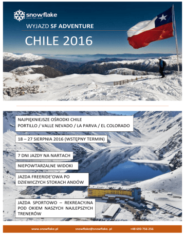 WYJAZD SF ADVENTURE CHILE 2016 NAJPIĘKNIEJSZE OŚRODKI CHILE PORTILLO / VALLE NEVADO / LA PARVA / EL COLORADO 18 – 27 SIERPNIA 2016 (WSTĘPNY TERMIN) 7 DNI JAZDY NA NARTACH NIEPOWTARZALNE WIDOKI JAZDA FREERIDE’OWA PO DZIEWICZYCH STOKACH ANDÓW JAZDA SPORTOWO – REKREACYJNA POD OKIEM NASZYCH NAJLEPSZYCH TRENERÓW www.snowflake.pl snowflake@snowflake. pl +48 693 756 256 CHILE 2016 - PORTILLO / VALLE NEVADO / LA PARVA / EL COLORADO / 7 DNI NA NARTACH MIEJSCA: MAPA POGLĄDOWA: http://goo.gl/kUQyzz TRES VALLES Oddalone od Santiago o zaledwie 50 km, chilijskie Trzy Doliny oferują jedne z najlepszych warunków śniegowych i możliwość jazdy w 3 połączonych ze sobą ośrodkach. LA PARVA LA PARVA – WIDOK NA DOLINĘ VALLE NEVADO - 3670 m n.p.m. VALLE NEVADO Valle Nevado jest jednym z najlepszych ośrodków narciarskich w Chile ze świetną infrastrukturą – 14 wyciągów, 9 km2 wyratrakowanych tras i off-piste. Różnica wzniesień 820 m. W "Śnieżnej dolinie" średni roczny opad śniegu wynosi 7 m. Najwyższy punkt ośrodka położony jest na 3670 m n.p.m. Ośrodek położony najbliżej Santiago, popularny wśród bogatych Chilijczyków. Obszar narciarski o powierzchni 5 km2, 15 nieco bardziej tradycyjnych wyciągów (tylko 5 krzesełkowych), trasy przygotowane przez ratraki (najdłuższa 4 km) jak i tzw. off-piste w Valle de Fabres (Zona de Freeskiing). Średni roczny opad śniegu wynosi tu 7 metrów. Najwyższy punkt 3720 m n.p.m., różnica wzniesień 960 m. Istnieje możliwość wybrania się na heli skiing (opcjonalnie). LA PARVA 3720 m n.p.m. VALLE NEVADO – NOWOCZESNY KURORT strona: http://www.vallenevado.com/en/ mapa: http://www.vallenevado.com/en/ski-trail-map/map-of-tracks/ www.snowflake.pl strona: http://www.laparva.cl/english/ mapa: http://www.laparva.cl/newsite/wpcontent/uploads/2011/03/mapa-pistas.pdf [email protected] +48 693 756 256 CHILE 2016 - PORTILLO / VALLE NEVADO / LA PARVA / EL COLORADO / 7 DNI NA NARTACH Średni roczny opad śniegu 5 metrów. Najwyższy punkt 3333 m n.p.m., różnica wzniesień 1090 m. Istnieje możliwość wybrania się na heli skiing (opcjonalnie). EL COLORADO strona: http://www.elcolorado.cl/ mapa: http://www.elcolorado.cl/mapa-de-pista/ PO TRASIE, CZY PO PUCHU? EL COLORADO 101 TRAS DO WYBORU Największy ośrodek składający się w rzeczywistości z dwóch: El Colorado i Fallerones, o łącznej, imponującej powierzchni 11 km2, z wytyczonymi 101 trasami, dostępnymi z nieco bardziej tradycyjnych wyciągów. PORTILLO JEZIORO LAGUNA DEL INCA stopniu trudności, a także tereny off-piste. Co ciekawe w Portillo każdego dnia sprzedawana jest ograniczona liczba karnetów, więc na stokach nigdy nie ma tłoku. Ponadto jest tam okazja do skorzystania z wyjątkowych 4 os. orczyków. Średni roczny opad śniegu 7,5 metra. Najwyższy punkt 3310 m n.p.m., różnica wzniesień 762 m. 80% dni słonecznych. Portillo to najlepsze miejsce na heli skiing! Najlepszy i najbardziej znany kurort w Chile. W 1966 r. jako pierwszy południowoamerykański ośrodek gościł narciarskie Mistrzostwa Świata. W 1978 r. pobito w nim rekord prędkości 200 km/h. Miejsce cieszy się niesłabnącą popularnością wśród profesjonalnych narciarzy ze względu na strome stoki. Dużą zaletą jest też jego malownicze położenie pośród andyjskich szczytów nad jeziorem Laguna del Inca. Tereny narciarskie (5 km2) to długie, chwilami bardzo strome wyratrakowane trasy, o różnym www.snowflake.pl strona: http://www.skiportillo.com/?lang=en mapa ośrodka: http://www.skiportillo.com/wpcontent/uploads/2013/10/MapaPistas2013_Retiro.pdf [email protected] +48 693 756 256 CHILE 2016 - PORTILLO / VALLE NEVADO / LA PARVA / EL COLORADO / 7 DNI NA NARTACH VALLE EL ARPA - Arpa Cat Skiing (opcjonalnie) wrażeń każdemu narciarzowi. Ratrak dojeżdża na wysokość 3610 m n.p.m. Zjazdy odbywają się w 6 osobowych grupach z przewodnikiem. Jeden dzień to minimum 4 zjazdy (można kupić dodatkowe przejazdy). GÓRNA STACJA RATRAKU WIDOK NA ACONCAGUA Niepowtarzalna okazja jazdy po dziewiczych stokach z widokiem na Aconcagua – najwyższy szczyt Andów. Valle el Arpa oferuje jedynie cat skiing, co oznacza, że nie ma tam wyciągów, a zamiast nich do góry podjeżdża się ratrakiem w małych grupach. Zjazdy w El Arpa są wyjątkowo długie (różnica wysokości 800 - 1100 m – jeden zjazd zajmuje do pół godziny) i dostarczą niezapomnianych strona internetowa: http://www.skiarpa.com/ mapa terenu: http://www.skiarpa.com/wordpress/wpcontent/uploads/2011/04/Ski-Arpa-Trail-Map.pdf INNE ATRAKCJE SANTIAGO – METROPOLIA U PODNÓŻA AND WINNICE W OKOLICACH SANTIAGO www.snowflake.pl [email protected] KANION MAIPO REZERWAT RÍO CLARILLO +48 693 756 256 CHILE 2016 - PORTILLO / VALLE NEVADO / LA PARVA / EL COLORADO / 7 DNI NA NARTACH Orientacyjny Program: Dzień 0 - czwartek Wylot z Warszawy ok. godz. 16.00 Dzień 5-8 – wtorek - piątek Jazda w Ski Portillo. Zakwaterowanie i dojazd z Los Andes. Dzień 1 - piątek Przylot do Santiago ok. godz. 09.00 rano. Transfer do Farellones w Tres Valles (60 km). Zakwaterowanie w Farellones – miejscowości skąd można dotrzeć do El Colorado, La Parva i Valle Nevado. Po południu opcjonalnie jazda na nartach (rozjeżdżanie) lub kuracja jet lag chilijskim winem :) Dzień 2-3 – sobota, niedziela Jazda w Tres Valles – wybór ośrodków zależnie od pogody i warunków śniegowych. Dzień 4 - poniedziałek Jazda do południa w jednym z ośrodków Tres Valles. Transfer do Los Andes (120 km) z przystankiem na degustację win chilijskich. Opcjonalnie (Dzień 7 – czwartek) Jazda w Valle el Arpa – Snowcat Skiing. Jazda z przewodnikami górskimi. Dzień 8 - piątek Transfer do Santiago (90 km) po nartach. Pożegnanie z Chile – wieczór w Santiago. Dzień 9 – sobota Spacer po Santiago. Wylot do Warszawy ok. godz. 15.00 Dzień 10 - niedziela Przylot do Warszawy ok. godz. 15.00 To jest nasz program minimum:) W zależności od Waszych oczekiwań może u