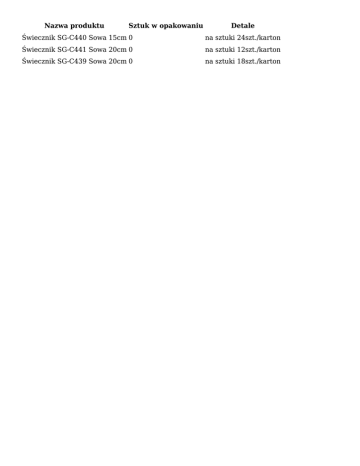 Nazwa produktu Sztuk w opakowaniu Detale Świecznik SG-C440 Sowa 15cm 0 na sztuki 24szt./karton Świecznik SG-C441 Sowa 20cm 0 na sztuki 12szt./karton Świecznik SG-C439 Sowa 20cm 0 na sztuki 18szt./karton