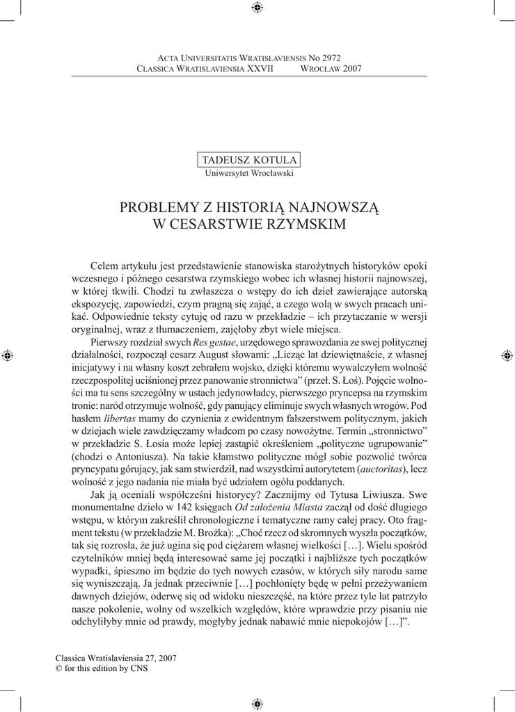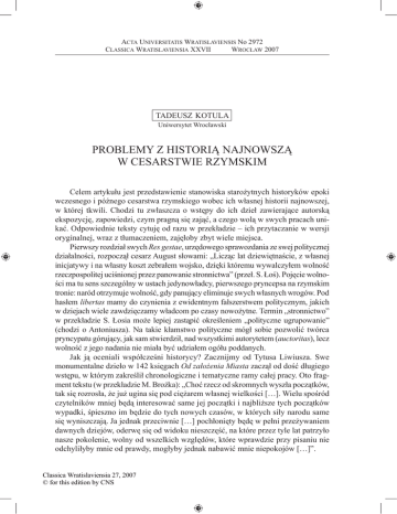 Acta Universitatis Wratislaviensis No 2972 Classica Wratislaviensia XXVII Wrocław 2007 39 Tadeusz Kotula Uniwersytet Wrocławski Problemy z historią najnowszą w cesarstwie rzymskim Celem artykułu jest przedstawienie stanowiska starożytnych historyków epoki wczesnego i późnego cesarstwa rzymskiego wobec ich własnej historii najnowszej, w której tkwili. Chodzi tu zwłaszcza o wstępy do ich dzieł zawierające autorską ekspozycję, zapowiedzi, czym pragną się zająć, a czego wolą w swych pracach unikać. Odpowiednie teksty cytuję od razu w przekładzie – ich przytaczanie w wersji oryginalnej, wraz z tłumaczeniem, zajęłoby zbyt wiele miejsca. Pierwszy rozdział swych Res gestae, urzędowego sprawozdania ze swej politycznej działalności, rozpoczął cesarz August słowami: „Licząc lat dziewiętnaście, z własnej inicjatywy i na własny koszt zebrałem wojsko, dzięki któremu wywalczyłem wolność rzeczpospolitej uciśnionej przez panowanie stronnictwa” (przeł. S. Łoś). Pojęcie wolności ma tu sens szczególny w ustach jedynowładcy, pierwszego pryncepsa na rzymskim tronie: naród otrzymuje wolność, gdy panujący eliminuje swych własnych wrogów. Pod hasłem libertas mamy do czynienia z ewidentnym fałszerstwem politycznym, jakich w dziejach wiele zawdzięczamy władcom po czasy nowożytne. Termin „stronnictwo” w przekładzie S. Łosia może lepiej zastąpić określeniem „polityczne ugrupowanie” (chodzi o Antoniusza). Na takie kłamstwo polityczne mógł sobie pozwolić twórca pryncypatu górujący, jak sam stwierdził, nad wszystkimi autorytetem (auctoritas), lecz wolność z jego nadania nie miała być udziałem ogółu poddanych. Jak ją oceniali współcześni historycy? Zacznijmy od Tytusa Liwiusza. Swe monumentalne dzieło w 142 księgach Od założenia Miasta zaczął od dość długiego wstępu, w którym zakreślił chronologiczne i tematyczne ramy całej pracy. Oto fragment tekstu (w przekładzie M. Brożka): „Choć rzecz od skromnych wyszła początków, tak się rozrosła, że już ugina się pod ciężarem własnej wielkości […]. Wielu spośród czytelników mniej będą interesować same jej początki i najbliższe tych początków wypadki, śpieszno im będzie do tych nowych czasów, w których siły narodu same się wyniszczają. Ja jednak przeciwnie […] pochłonięty będę w pełni przeżywaniem dawnych dziejów, oderwę się od widoku nieszczęść, na które przez tyle lat patrzyło nasze pokolenie, wolny od wszelkich względów, które wprawdzie przy pisaniu nie odchyliłyby mnie od prawdy, mogłyby jednak nabawić mnie niepokojów […]”. Classica Wratislaviensia 27, 2007 © for this edition by CNS 40 Tadeusz Kotula Poglądy Liwiusza na historię nowszą i najnowszą są tu znakomicie czytelne, choć miejscami nieco zakamuflowane. Przeżywanie zamierzchłych dziejów „pierwszego w świecie narodu” – jak pisze – sprawia mu satysfakcję, od najnowszej historii współczesnej sobie wyraźnie się dystansuje. Choć wielu jego czytelników woli, czytamy, śledzić pasjonujące bieżące wydarzenia, ich przyczyny i skutki, w całkiem innym położeniu znalazłby się sam autor zmuszony do niezwykle oględnego ważenia każdego słowa na temat współczesności, za które w trudnym czasie mógłby ponosić odpowiedzialność. Przez wspomniane „niepokoje” należy rozumieć ewentualne przykrości doznane przez historyka w dobie politycznej zapaści państwa rzymskiego u schyłku republiki, w okresie dwóch triumwiratów i aż po rządy Oktawiana Augusta. Dlatego ostrożnie unika Liwiusz konieczności dokonywania politycznych ocen w tak delikatnej materii, aby się schować w odległej przeszłości. Przezwyciężenie kryzysu widzi dopiero w Augustowym pryncypacie, doprowadzając wykład do śmierci Druzusa Starszego w 9 r. p.n.e. Wojny domowe doby schyłkowej republiki groziły zaangażowanym w nie osobistościom zwichnięciem politycznych karier czy wręcz realnym niebezpieczeństwem proskrypcji. Trudne wybory między zwalczającymi się ugrupowaniami wiodły do politycznego oportunizmu, łatwego przechodzenia na stronę zwycięskich wodzów. Do Liwiuszowych „niepokojów” dopisały polityczny komentarz losy i twórczość innych historyków okresu burzliwego przełomu. Mówcy i historycy stali bowiem u boku czołowych jednostek rzymskiej republiki w pierwszym szeregu walki politycznej, tworząc słowem i piórem jej ideologię w nurcie rzymskiej historii najnowszej przejściowego okresu. Perypetie łacińskiej historiografii tego czasu stanowią pouczającą ilustrację skomplikowanych problemów bieżącej chwili. Prześledzimy to na przykładzie czterech autorów piszących w tradycyjnym duchu republikańskim, nie bez „gniewu i stronniczości”. Byli nimi mianowicie: G. Azyniusz Pollion, M. Waleriusz, Messalla Korwinus, Kasjusz Sewerus i A. Kremucjusz Kordus. Łączy ich choćby fakt, jak zobaczymy znamienny, iż żadne z ich historycznych dzieł nie przetrwało do naszych czasów, jeśli nie liczyć drobnych fragmentów oraz nader skąpych i ogólnikowych wzmianek u innych pisarzy. Zacznijmy od mówcy Kremucjusza Kordusa, którego twórczość historiograficzną oraz polityczną działalność oceniają nasze główne źródła – Tacyt, Swetoniusz i Kasjusz Dion. Życie jego przypada na czas panowania Augusta i Tyberiusza. Kasjusz Dion wspomina, iż napisał on pracę o panowaniu Augusta, lecz bliższym prawdy wydaje się Tacyt, który mówi o rocznikach i kładzie w usta Kordusa wylewne pochwały republikańskich wodzów doby ostatnich wojen domowych. Raczej zatem należy przyjąć, że jego Annales były przedstawieniem wydarzeń tego głównie czasu do Augusta. Właśnie Tacyt odtworzył w swoich Rocznikach piękną mowę obrończą samego Kordusa oskarżonego w 25 r. n.e. przez Sejana lege maiestatis za gorącą apologię m.in. Brutusa Próbę wyjaśnienia tej cezury nie stanowiącej żadnej da