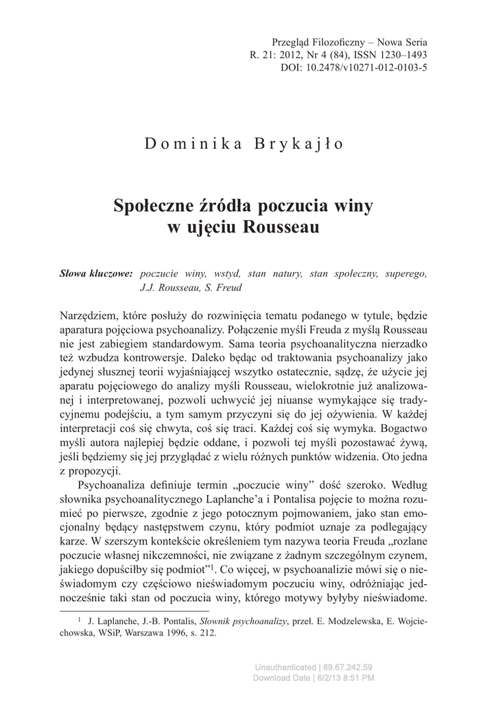 Przegląd Filozoficzny – Nowa Seria R. 21: 2012, Nr 4 (84), ISSN 1230–1493 DOI: 10.2478/v10271-012-0103-5 Dominika Brykajło Społeczne źródła poczucia winy w ujęciu Rousseau Słowa kluczowe: poczucie winy, wstyd, stan natury, stan społeczny, superego, J.J. Rousseau, S. Freud Narzędziem, które posłuży do rozwinięcia tematu podanego w tytule, będzie aparatura pojęciowa psychoanalizy. Połączenie myśli Freuda z myślą Rousseau nie jest zabiegiem standardowym. Sama teoria psychoanalityczna nierzadko też wzbudza kontrowersje. Daleko będąc od traktowania psychoanalizy jako jedynej słusznej teorii wyjaśniającej wszytko ostatecznie, sądzę, że użycie jej aparatu pojęciowego do analizy myśli Rousseau, wielokrotnie już analizowanej i interpretowanej, pozwoli uchwycić jej niuanse wymykające się tradycyjnemu podejściu, a tym samym przyczyni się do jej ożywienia. W każdej interpretacji coś się chwyta, coś się traci. Każdej coś się wymyka. Bogactwo myśli autora najlepiej będzie oddane, i pozwoli tej myśli pozostawać żywą, jeśli będziemy się jej przyglądać z wielu różnych punktów widzenia. Oto jedna z propozycji. Psychoanaliza definiuje termin „poczucie winy” dość szeroko. Według słownika psychoanalitycznego Laplanche’a i Pontalisa pojęcie to można rozumieć po pierwsze, zgodnie z jego potocznym pojmowaniem, jako stan emocjonalny będący następstwem czynu, który podmiot uznaje za podlegający karze. W szerszym kontekście określeniem tym nazywa teoria Freuda „rozlane poczucie własnej nikczemności, nie związane z żadnym szczególnym czynem, jakiego dopuściłby się podmiot”1. Co więcej, w psychoanalizie mówi się o nieświadomym czy częściowo nieświadomym poczuciu winy, odróżniając jednocześnie taki stan od poczucia winy, którego motywy byłyby nieświadome. 1 J. Laplanche, J.-B. Pontalis, Słownik psychoanalizy, przeł. E. Modzelewska, E. Wojciechowska, WSiP, Warszawa 1996, s. 212. Unauthenticated | 89.67.242.59 Download Date | 6/2/13 8:51 PM 174 Dominika Brykajło W tym sensie termin „poczucie” jest pewną nieścisłością. Podmiot może nie czuć się winny na poziomie świadomego przeżycia. W związku z tym Freud sugeruje, że w niektórych przypadkach właściwszym wydaje się mówienie nie tyle o poczuciu winy, ile o potrzebie kary. Zestawienie tych dwóch pojęć wskazuje na istotny aspekt poczucia winy dotyczący jego konsekwencji – jednostka z poczuciem winy poszukuje kary: „poczucie winy jest systemem nieświadomych motywacji, odpowiedzialnych za syndrom ponoszenia porażki, zachowania przestępcze, zadawanie sobie cierpienia itp.”2 Poczucie winy może być przyczyną chorób (nerwicy, depresji, uzależnień) i zbrodni. Wreszcie, z punktu widzenia struktury aparatu psychicznego, tak jak opisuje go psychoanaliza, poczucie winy jest efektem relacji, napięcia pomiędzy ego a superego, pomiędzy ja a instancją psychiczną pełniącą funkcję oceniającą i krytyczną, będącą zintrojektowanym autorytetem moralnym i społecznym. W niniejszym artykule posługuję się terminem „poczucie winy” w najszerszym z wymienionych znaczeń. Rozumiem je zatem jako „rozmyte”, nie do końca uświadamiane poczucie własnej niegodziwości, haniebności, które ma swoje negatywne i destrukcyjne dla jednostki konsekwencje. Z perspektywy struktury aparatu psychicznego jest zaś pewnym napięciem miedzy jego dwiema instancjami. Twierdzę, że pisma Rousseau wskazują, iż tak rozumiane poczucie winy ma źródła społeczne. Jest stanem emocjonalnym istotnym, wpływającym na kondycję jednostki, jej postrzeganie rzeczywistości i wtórnie na jej funkcjonowanie w relacjach. Samo pojęcie zaś, jako narzędzie, staje się użyteczne do opisu psychiki człowieka społecznego, takiego, jakim przedstawia go Rousseau, jego relacji z innymi i jego widzenia świata. Stan emocjonalny, który charakteryzuje poczucie winy, obcy jest człowiekowi nazywanemu przez Rousseau człowiekiem w stanie natury. Jego życie jest niewinne i spokojne, potrzeby niewygórowane i łatwe do zaspokojenia. Opisy życia w stanie natury mają sielski wydźwięk: „widzę go, jak głód syci pod dębem, pragnienie gasi w byle strumieniu, łoże znajduje u tegoż drzewa, pod którym przed chwilą spożył posiłek – i otóż i jego potrzeby zaspokojone”3; „pragnienia jego nie dalej sięgają niż jego potrzeby fizyczne; jedyne na świecie znane mu dobra to – to pożywienie, samica i wypoczynek, jedyne nieszczęścia, jakich się lęka, to ból i głód”4. Podstawową troską człowieka w stanie naturalnym jest troska o zachowanie własnego życia. Wrodzonym uczuciem jest litość, dyskomfort towarzyszący byciu świadkiem cierpienia istoty mu podobnej. Nie wchodzi jednak Tamże, s. 212. J.J. Rousseau, Rozprawa o pochodzeniu i podstawach nierówności między ludźmi, w: tenże, Trzy rozprawy z filozofii społecznej, przeł. H. Elzenberg, PWN, Kraków 1965, s. 144. 4 Tamże, s. 156–157. 2 3 Unauthenticated | 89.67.242.59 Download Date | 6/2/13 8:51 PM Społeczne źródła poczucia winy w ujęciu Rousseau 175 z taką istotą w żadne niemal relacje. Jedyną interakcją, do jakiej dochodzi, jest stosunek seksualny. Nie ma on jednak nic wspólnego z relacją społeczną, jest czystym i przypadkowym zaspokojeniem popędu, niełączącym się z żadną uczuciowością: „samiczki i samce łączyli się przypadkowo, zależnie od spotkania, sposobności i chęci, przy czym w rzeczach, które sobie mieli do powiedzenia, słowo, jak się zdaje, nie było pośrednikiem tak znów bardzo niezbędnym; rozstawali się z taką samą łatwością”5. Człowiek natury żyje samotnie. Nie wchodząc w związki z innymi, nie ma wobec nich żadnych zobowiązań. Jest to stan przed-moralny. „Widać od razu, że ludzie w tym stanie, nie utrzymując ze sobą stosunków natury moralnej ani też żadnych względem siebie obowiązków nie znają