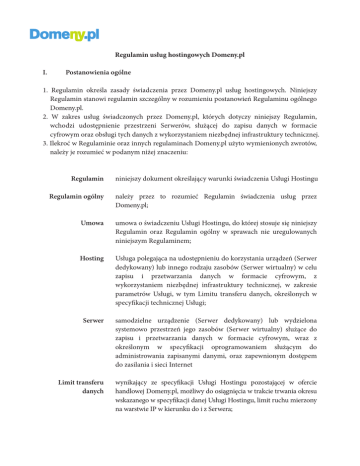 Regulamin usług hostingowych Domeny.pl I. Postanowienia ogólne