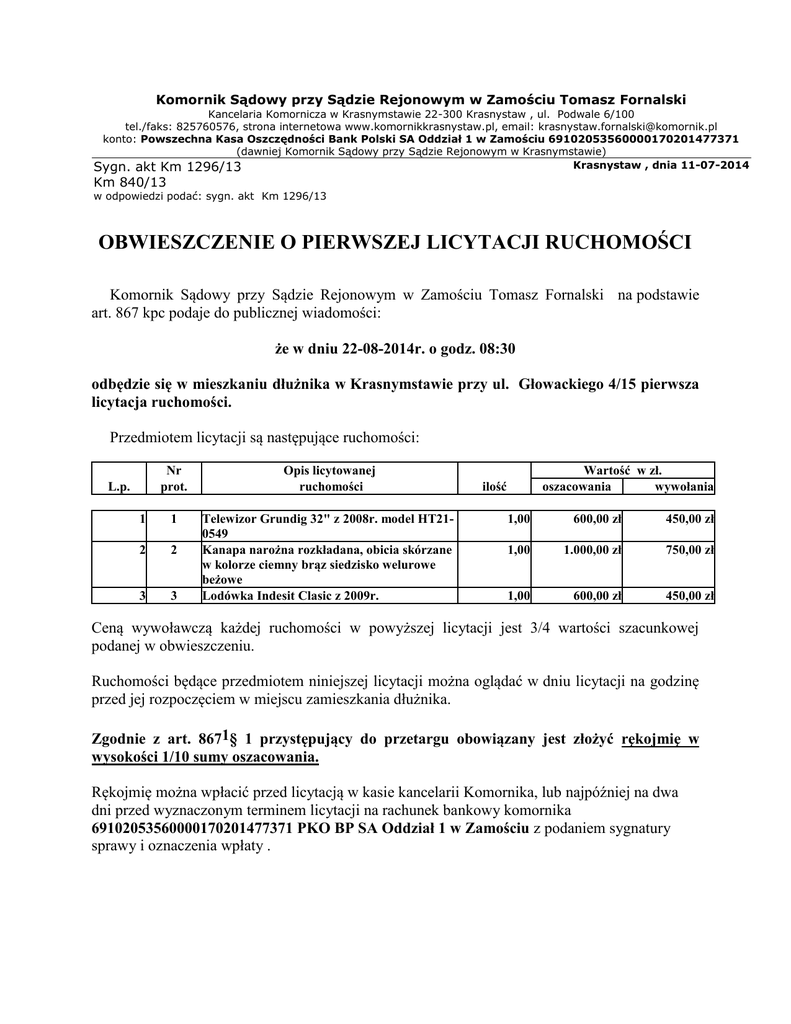 Komornik Sądowy przy Sądzie Rejonowym w Zamościu Tomasz Fornalski Kancelaria Komornicza w Krasnymstawie 22-300 Krasnystaw , ul. Podwale 6/100 tel./faks: 825760576, strona internetowa www.komornikkrasnystaw.pl, email: [email protected] konto: Powszechna Kasa Oszczędności Bank Polski SA Oddział 1 w Zamościu 69102053560000170201477371 (dawniej Komornik Sądowy przy Sądzie Rejonowym w Krasnymstawie) Krasnystaw , dnia 11-07-2014 Sygn. akt Km 1296/13 Km 840/13 w odpowiedzi podać: sygn. akt Km 1296/13 OBWIESZCZENIE O PIERWSZEJ LICYTACJI RUCHOMOŚCI Komornik Sądowy przy Sądzie Rejonowym w Zamościu Tomasz Fornalski na podstawie art. 867 kpc podaje do publicznej wiadomości: że w dniu 22-08-2014r. o godz. 08:30 odbędzie się w mieszkaniu dłużnika w Krasnymstawie przy ul. Głowackiego 4/15 pierwsza licytacja ruchomości. Przedmiotem licytacji są następujące ruchomości: Nr prot. Opis licytowanej ruchomości 1 1 2 2 3 3 Telewizor Grundig 32" z 2008r. model HT210549 Kanapa narożna rozkładana, obicia skórzane w kolorze ciemny brąz siedzisko welurowe beżowe Lodówka Indesit Clasic z 2009r. L.p. Wartość w zł. oszacowania wywołania ilość 1,00 600,00 zł 450,00 zł 1,00 1.000,00 zł 750,00 zł 1,00 600,00 zł 450,00 zł Ceną wywoławczą każdej ruchomości w powyższej licytacji jest 3/4 wartości szacunkowej podanej w obwieszczeniu. Ruchomości będące przedmiotem niniejszej licytacji można oglądać w dniu licytacji na godzinę przed jej rozpoczęciem w miejscu zamieszkania dłużnika. Zgodnie z art. 8671§ 1 przystępujący do przetargu obowiązany jest złożyć rękojmię w wysokości 1/10 sumy oszacowania. Rękojmię można wpłacić przed licytacją w kasie kancelarii Komornika, lub najpóźniej na dwa dni przed wyznaczonym terminem licytacji na rachunek bankowy komornika 69102053560000170201477371 PKO BP SA Oddział 1 w Zamościu z podaniem sygnatury sprawy i oznaczenia wpłaty .