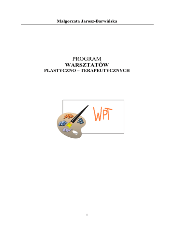Małgorzata Jarosz-Barwińska PROGRAM WARSZTATÓW PLASTYCZNO – TERAPEUTYCZNYCH 1 „Postawa twórcza równoznaczna jest z postawą otwartą ku światu, rzeczom, ludziom, z postawą mobilną – ruchem myśli, uczuć i wyobraźni, z chęcią i potrzebą działania.” Irena Wojnar „Tworzyć to znaczy wyrażać to, co ma się w sobie. Wszelki autentyczny wysiłek twórczy jest czymś wewnętrznym.” Henri Matisse WSTĘP Czynne uprawianie plastyki przez dzieci zyskuje na świecie coraz więcej entuzjastów. Świadczą o tym liczne konkursy, wystawy, cenne nagrody przyznawane młodym autorom, organizowane galerie, liczne publikacje. Prace plastyczne dzieci określane są często terminem „twórczości dziecięcej”, podkreślając tym samym bogactwo inwencji i pomysłowości, żywiołowości i siłę procesu tworzenia, jak również i to, że w wyniku tego procesu powstają niejednokrotnie wytwory artystycznie wartościowe i piękne. Wykorzystując powszechnie znaną i coraz bardziej docenianą terapeutyczną funkcję plastyki oraz naturalną chęć tworzenia dzieci 5-6 letnich, połączyłam te dwa elementy dla inicjowania procesu twórczego a tym samym do zwiększenia ogólnego poziomu ich rozwoju. Prezentowany program zakłada rozwój osobowości, sprawności manualnej, procesów poznawczych (spostrzeżeń, pamięci, wzrokowej, wyobraźni twórczej, myślenia) a także procesów emocjonalnych dzieci. 1. ZAŁOŻENIA PROGRAMOWE Program opracowany został dla dzieci pięcioletnich sześcioletnich wykazujących uzdolnienia i zainteresowania plastyczne. Realizowany będzie z małą grupą dzieci (10 – 16 osób) raz w tygodniu. Głównym założeniem programu jest wychodzenie naprzeciw potrzebom dziecka, rozwijanie i wspomaganie jego zdolności zgodnie z jego potencjałem i możliwościami. Często dużo czasu wymaga stymulowanie zmysłów: wzroku, słuchu itd. Trzeba nauczyć patrzeć, a nie tylko widzieć, słuchać, a nie tylko słyszeć. Nauczyciel dając uczniowi szansę choćby minimalnego i powolnego rozwoju, „otwiera okna i drzwi”, przez które dostrzeże to, czego dotychczas nie widział. Nawet to, że drzewo może być zielone, żółte, a innym razem białe od śniegu itp.– to wszystko trzeba często wielokrotnie utrwalać, uzmysławiając jednocześnie możliwość odtworzenia tego bogactwa na papierze lub innym materiale. Nauczyciel twórczy prowadząc warsztaty jest w stanie rozwinąć wrażliwość plastyczną dziecka do jego możliwości. Dzięki uwrażliwieniu plastycznemu dzieci takie mają szansę: - rozwinąć swoje zdolności percepcyjne - rozwinąć sprawność manualną i umiejętności plastyczne - rozwinąć swoją wyobraźnię - wzbogacić się pod względem słownictwa - rozbudzić poczucie własnej wartości i wiary w swoje możliwości - zrelaksować się Dzięki temu zwiększony zostanie ogólny poziom rozwoju dziecka co daje zwiększenie ich szans na lepsze funkcjonowanie w życiu dorosłym. 2 Zajęcia warsztatowe powinny mieć charakter swobodny, elastyczny. Każde spotkanie powinno stanowić zachętę do ponownego spotkania poprzez inspirowanie, wyzwalanie potrzeby twórczej ekspresji przez nauczyciela. W trakcie zajęć należy stosować ocenę słowną w formie zachęty, akceptacji działań dziecka, pomagać w przezwyciężaniu działań warsztatowych, podkreślać indywidualność podejścia do rozwiązań twórczych, co motywuje dziecko do samodzielnej twórczej pracy. Duże znaczenie maja również wystawy prac uczniów, udział w różnego rodzaju konkursach, wernisażach, dla pokazania dziecku wartości jego pracy. Dziecko nabiera wówczas pewności siebie, zaufania do siebie i wiary w to, że potrafi zrobić coś dobrego, wartościowego, że jest zdolne do działań, w tym działań twórczych. Nabiera tym samym wiedzy z dziedziny sztuki, czy nauki. Nie boi się i nie pracuje w stresie. Ciekawym elementem w warsztatach podnoszącym atrakcyjność zajęć jest wprowadzenie do zajęć muzyki, jako inspiracji do tematu czy formy tworzenia odpowiedniej atmosfery, wykorzystanie ćwiczeń kinezjologii edukacyjnej, tworzenie nie tylko w pracowni ale i w plenerze oraz kontakt z dziełami plastycznymi poprzez pokaz reprodukcji. 2. CELE GŁÓWNE PROGRAMU: - Wspomaganie wszechstronnego rozwoju dziecka - Relaksacja pozwalająca w naturalny sposób odreagować negatywne emocje - Diagnoza pozwalająca bliżej poznać dziecko 3. CELE SZCZEGÓŁOWE: - rozwój sprawności manualnej i koordynacji wzrokowo – motorycznej stymulacja i kształcenie percepcji wzrokowej działanie uspokajające i uaktywniające doskonalenie spostrzegawczości, pamięci, myślenia, wyobraźni, uwagi i wytrwałości rozwój doświadczeń z materią fizyczną w procesie stosowania różnych technik plastycznych, narzędzi, ich możliwości ekspresyjnych wzbogacanie słownictwa czynnego i biernego dostarczenie osobistej radości dziecku, poprawienie samopoczucia, pobudzenie ambicji i chęci do dalszego wysiłku wdrażanie do dokładności, staranności i precyzji rozwój i kształcenie przeżyć estetycznych i kultury estetycznej rozwój twórczości plastycznej dzieci i ogólnej postawy twórczej Terapia poprzez sztukę nie nakłada na prowadzącego obowiązku określania celów szczegółowych zajęć w odniesieniu do stanu psychofizycznego dziecka. Relacja mistrz– uczeń, twórca–dzieło, twórca–materiał, tworzywo, stanowią perspektywę ogólnorozwojową, poznawczą. 4. PROCEDURY OSIĄGNIĘCIA CELÓW - • Metody pracy Stymulujące – rozmowa, dyskusja, wymiana myśli Aktywizujące – zachęta do działania twórczego, przekonanie, wyzwalanie energii twórczej Wyzwalające – współdziałanie, współpraca, konkretna pomoc, współzawodnictwo Kształtujące – działanie samodzielne, projektowanie, konstruowanie, tworzenie pomysłów i ich realizacja 3 - • Formy pracy indywidualna zbiorowa • Formy działania różnymi technikami (propozycje technik plastyczny