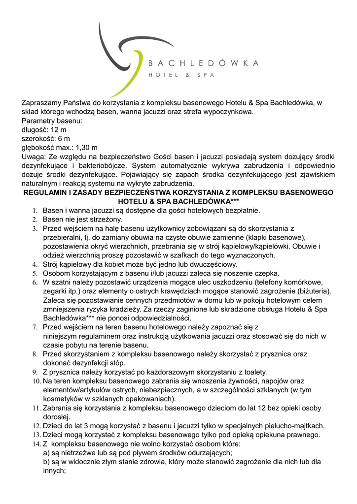 Zapraszamy Państwa do korzystania z kompleksu basenowego Hotelu & Spa Bachledówka, w skład którego wchodzą basen, wanna jacuzzi oraz strefa wypoczynkowa. Parametry basenu: długość: 12 m szerokość: 6 m głębokość max.: 1,30 m Uwaga: Ze względu na bezpieczeństwo Gości basen i jacuzzi posiadają system dozujący środki dezynfekujące i bakteriobójcze. System automatycznie wykrywa zabrudzenia i odpowiednio dozuje środki dezynfekujące. Pojawiający się zapach środka dezynfekującego jest zjawiskiem naturalnym i reakcją systemu na wykryte zabrudzenia. REGULAMIN I ZASADY BEZPIECZEŃSTWA KORZYSTANIA Z KOMPLEKSU BASENOWEGO HOTELU & SPA BACHLEDÓWKA*** 1. Basen i wanna jacuzzi są dostępne dla gości hotelowych bezpłatnie. 2. Basen nie jest strzeżony. 3. Przed wejściem na halę basenu użytkownicy zobowiązani są do skorzystania z przebieralni, tj. do zamiany obuwia na czyste obuwie zamienne (klapki basenowe), pozostawienia okryć wierzchnich, przebrania się w strój kąpielowy/kąpielówki. Obuwie i odzież wierzchnią proszę pozostawić w szafkach do tego wyznaczonych. 4. Strój kąpielowy dla kobiet może być jedno lub dwuczęściowy. 5. Osobom korzystającym z basenu i/lub jacuzzi zaleca się noszenie czepka. 6. W szatni należy pozostawić urządzenia mogące ulec uszkodzeniu (telefony komórkowe, zegarki itp.) oraz elementy o ostrych krawędziach mogące stanowić zagrożenie (biżuteria). Zaleca się pozostawianie cennych przedmiotów w domu lub w pokoju hotelowym celem zmniejszenia ryzyka kradzieży. Za rzeczy zaginione lub skradzione obsługa Hotelu & Spa Bachledówka*** nie ponosi odpowiedzialności. 7. Przed wejściem na teren basenu hotelowego należy zapoznać się z niniejszym regulaminem oraz instrukcją użytkowania jacuzzi oraz stosować się do nich w czasie pobytu na terenie basenu. 8. Przed skorzystaniem z kompleksu basenowego należy skorzystać z prysznica oraz dokonać dezynfekcji stóp. 9. Z prysznica należy korzystać po każdorazowym skorzystaniu z toalety. 10. Na teren kompleksu basenowego zabrania się wnoszenia żywności, napojów oraz elementów/artykułów ostrych, niebezpiecznych, a w szczególności szklanych (w tym kosmetyków w szklanych opakowaniach). 11. Zabrania się korzystania z kompleksu basenowego dzieciom do lat 12 bez opieki osoby dorosłej. 12. Dzieci do lat 3 mogą korzystać z basenu i jacuzzi tylko w specjalnych pielucho-majtkach. 13. Dzieci mogą korzystać z kompleksu basenowego tylko pod opieką opiekuna prawnego. 14. Z kompleksu basenowego nie wolno korzystać osobom które: a) są nietrzeźwe lub są pod pływem środków odurzających; b) są w widocznie złym stanie zdrowia, który może stanowić zagrożenie dla nich lub dla innych; c) posiadają niezagojone rany lub choroby dermatologiczne; d) są uczulone na środki dezynfekujące; e) cierpią na choroby i dolegliwości, przy których korzystanie z basenu nie jest zalecane; f) chorują na choroby zakaźne 15. Osoby znajdujące się w złym stanie zdrowia, sprawności bądź samopoczucia, a także kobiety w ciąży, powinny korzystać z basenu i jego urządzeń ze szczególną ostrożnością, stosownie do ich stanu zdrowia. Hotel & Spa Bachledówka*** nie ponosi odpowiedzialności za skutki zdrowotne spowodowane korzystaniem z basenu przez te osoby. 16. Na terenie kompleksu basenowego kategorycznie zabrania się: a) biegania, b) skoków do wody, c) spożywania napojów alkoholowych d) spożywania żywności oraz żucia gumy, e) wszczynania fałszywych alarmów, f) pozostawiania małych dzieci bez opieki, 17. W przypadku grup zorganizowanych za skutki zachowań uczestników odpowiedzialność ponosi opiekun grupy. 18. Osoba, która celowo lub mimowolnie zanieczyściła basen będzie obciążona kosztami wymiany wody w basenie. W przypadku dzieci odpowiedzialność ponosi opiekun dziecka. INSTRUKCJA UŻYTKOWANIA JACUZZI 1. Wejście do jacuzzi może się odbywać wyłącznie po stopniach. 2. Pierwszeństwo ma osoba wychodząca z wanny. 3. Podczas wychodzenia czy też wchodzenia do wanny jacuzzi należy zachować szczególną ostrożność. 4. Przed wejściem do jacuzzi należy bezwzględnie zdjąć obuwie basenowe. 5. Zalecany łączny pobyt w jacuzzi nie dłuższy niż 20 minut dziennie. 6. Kąpiel w jacuzzi odbywa się jedynie w pozycji siedzącej. 7. W jacuzzi, może przebywać jednocześnie nie więcej niż 6 osób 8. Osobom przebywającym w wannie jacuzzi zabrania się: - powodowania sytuacji zagrażającej własnemu bezpieczeństwu i bezpieczeństwu osób korzystających z wanny jacuzzi lub mogących spowodować nieszczęśliwy wypadek, - wchodzenia i wychodzenia z wanny jacuzzi w inny sposób niż poprzez schodki, - użytkowania wanny jacuzzi gdy wyłączona jest instalacja napowietrzająca bądź dostęp do wanny jest zakazany, - wpychania osób do wanny jacuzzi, - wnoszenia do wanny jacuzzi jakichkolwiek przedmiotów i substancji chemicznych, np. szamponów, olejków, soli kąpielowych itp., - przebywania w wannie jacuzzi w pozycji stojącej, - zanurzania głowy i twarzy, - manipulowanie przy dyszach i pokrętłach, - wylewania wody z wanny jacuzzi.